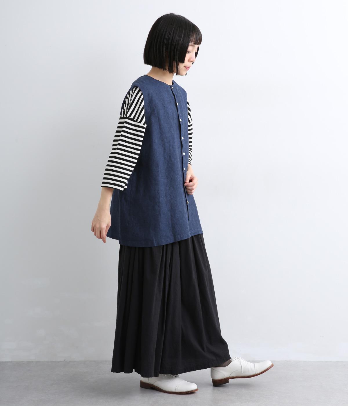 ざっくりとした表情が魅力の9番手リネンで仕立てました。しっかりとしたハリとほどよい肉感で、ロングシーズン着用できます。着るほどに肌になじみ、味わい深くなる素材です。