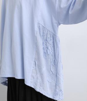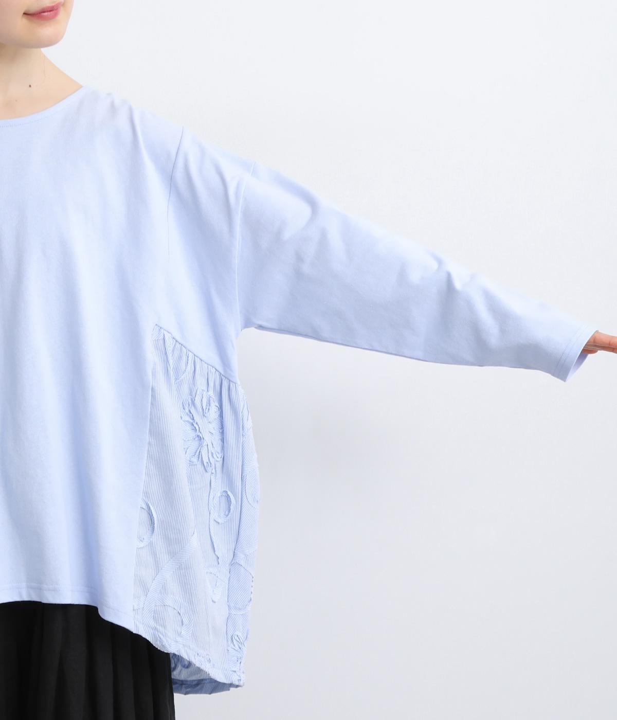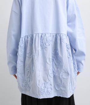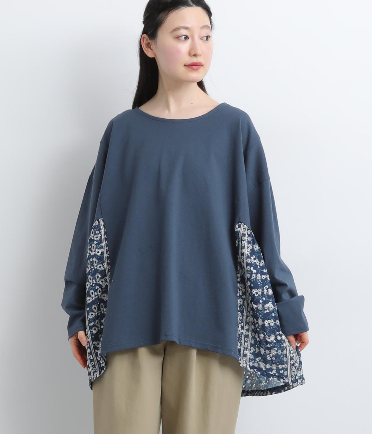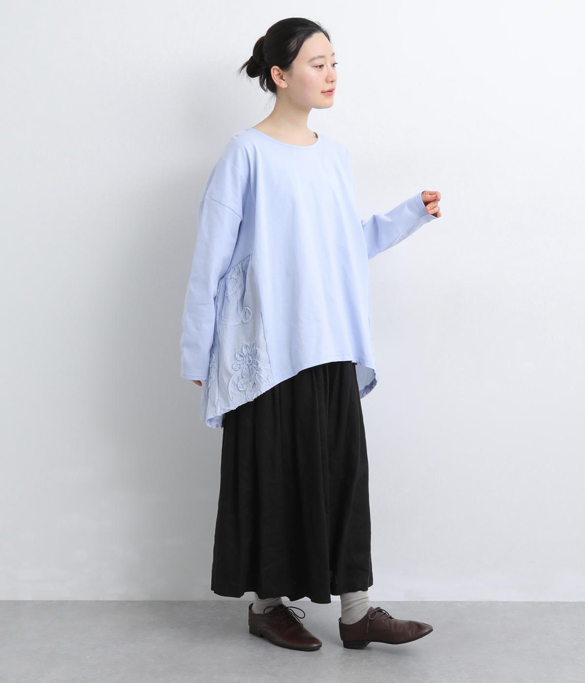 カジュアルスタイルに欠かせないカットソーに花モチーフの柄生地を配して着映え力を高めました。同色系でまとめているので着こなしやすく、適度なゆとりで着心地もリラクシー。裾は前後差をつけ、シルエットに動きをプラス。