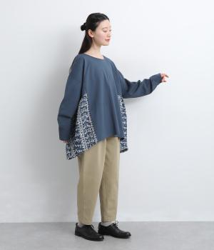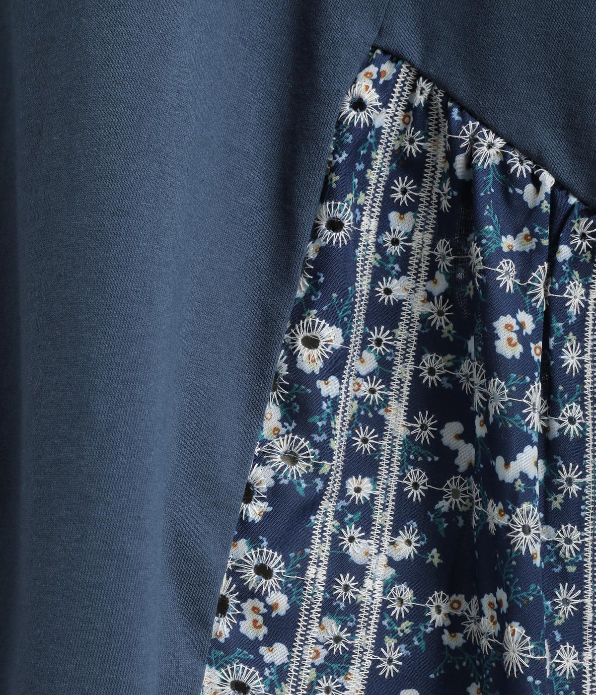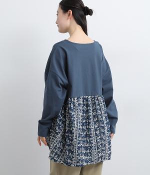 薄めながらも適度にしっかりしたカットソー生地と、軽やかな花柄生地をドッキングさせました。動きの多い部分はカットソー生地を配して着心地も◎。