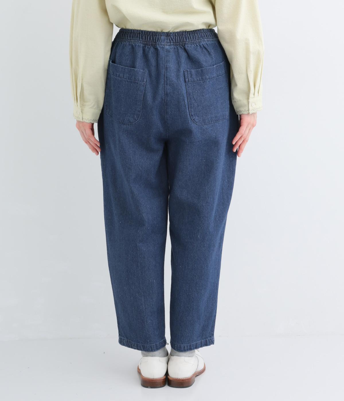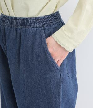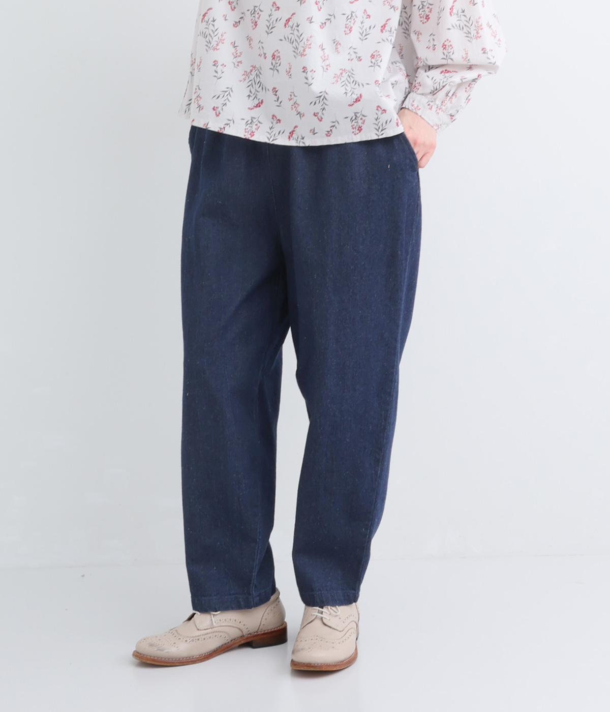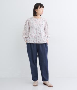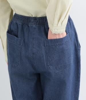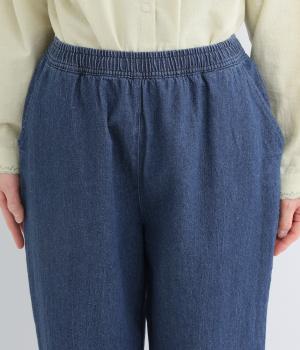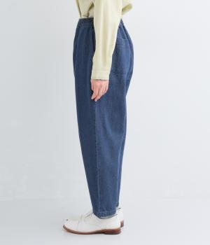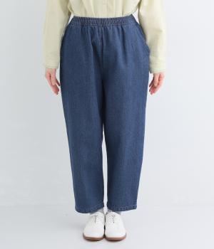 脚のラインを拾いにくいシルエットをアンクル丈で仕立てて、ボリュームに軽やかな抜け感を添えました。すっきりシンプルなフロントは、表情豊かな素材の魅力を引き立たせます。ウエストは総ゴム仕様で紐でサイズ調節が可能です。