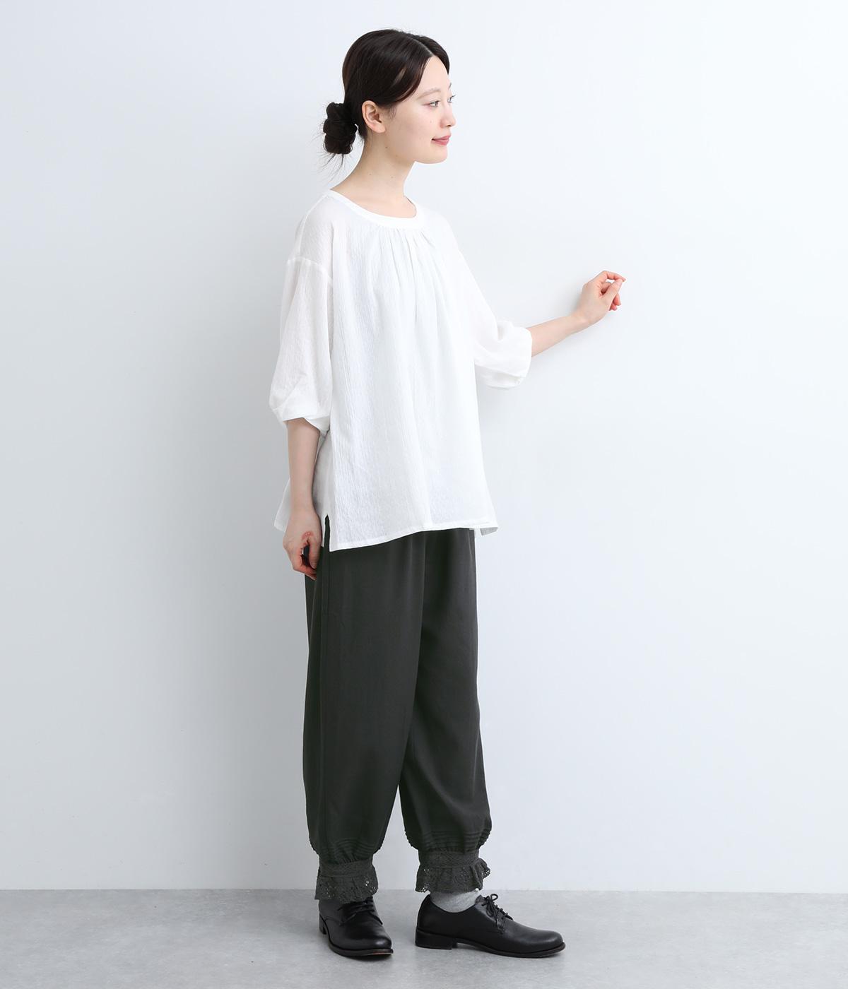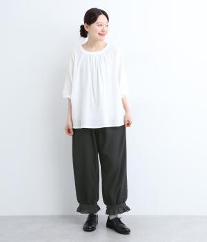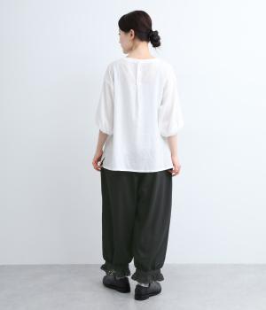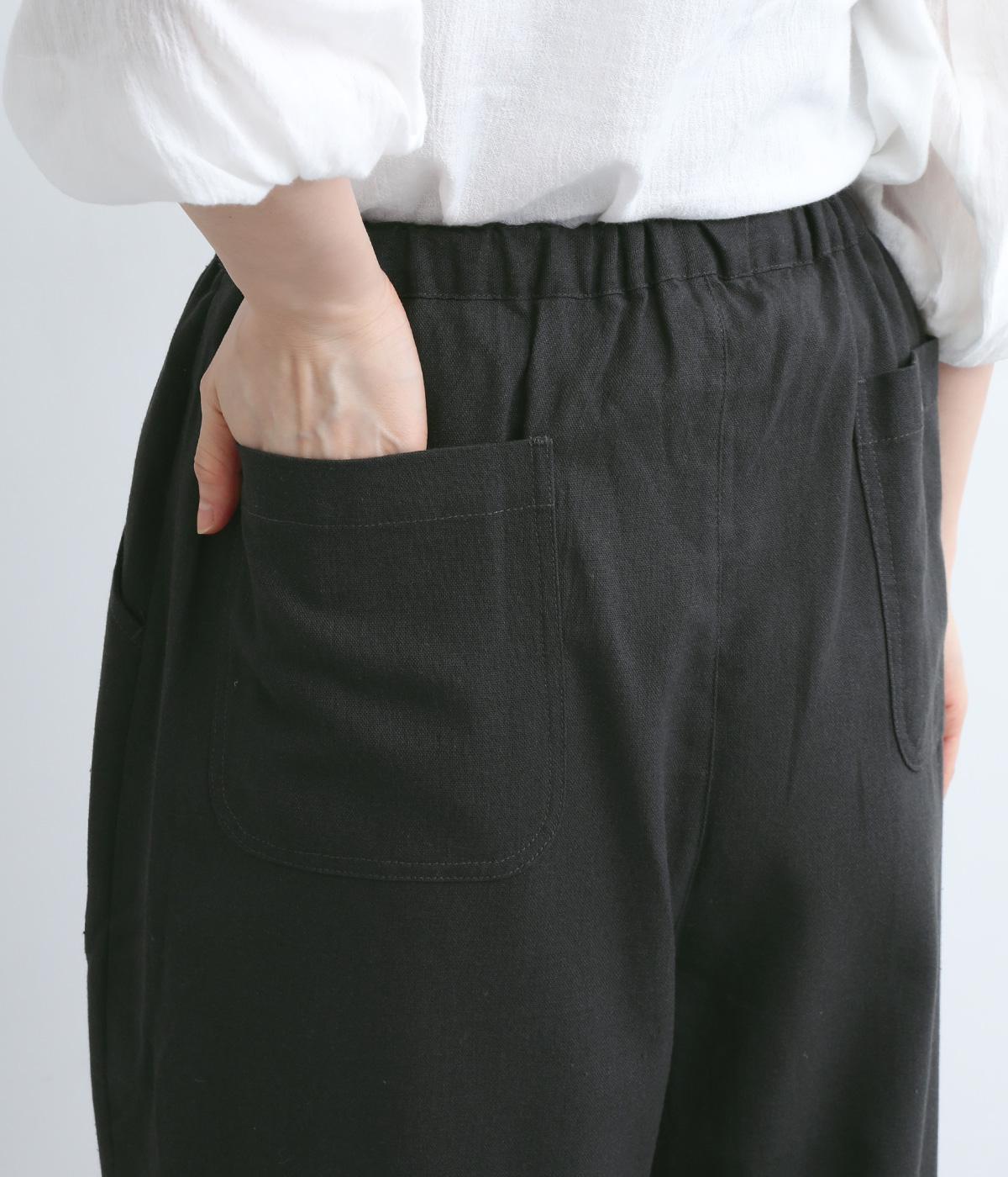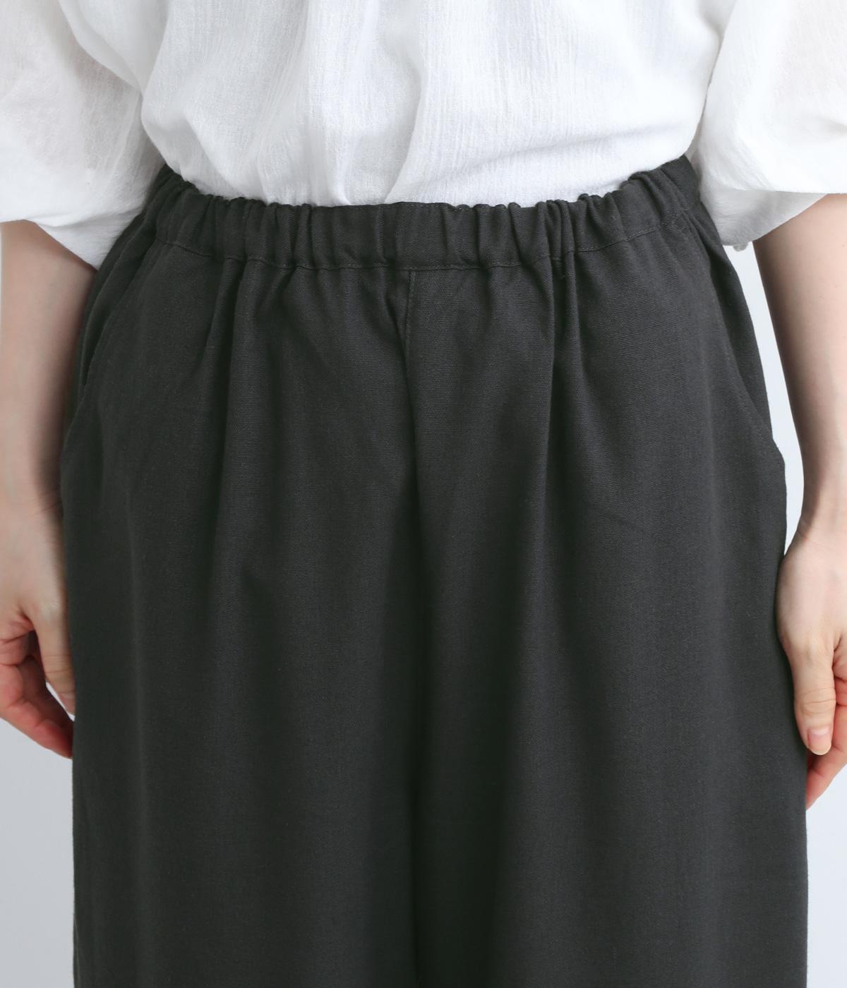 使い勝手のいい薄め中厚手のレーヨンリネン混紡生地を使用しています。なめらかで適度な落ち感とナチュラルな風合い、それぞれの特性を兼ね備えた雰囲気のいい素材です。