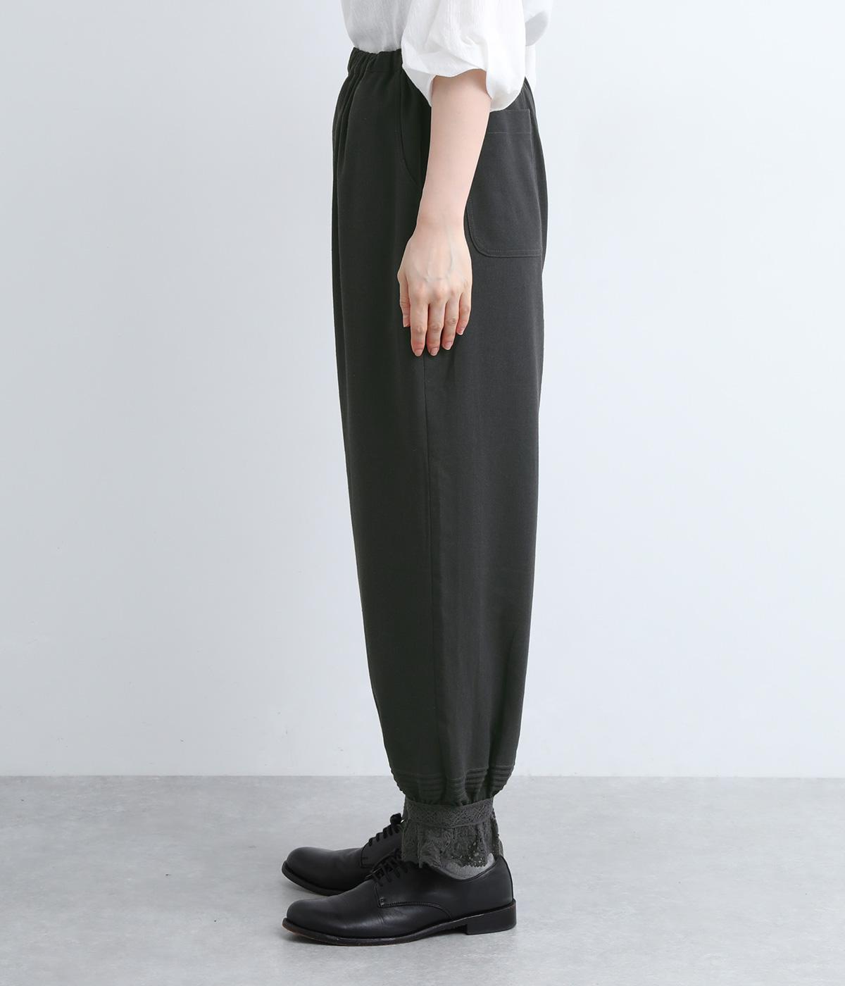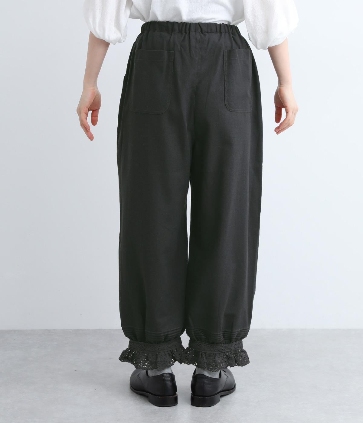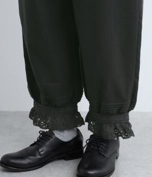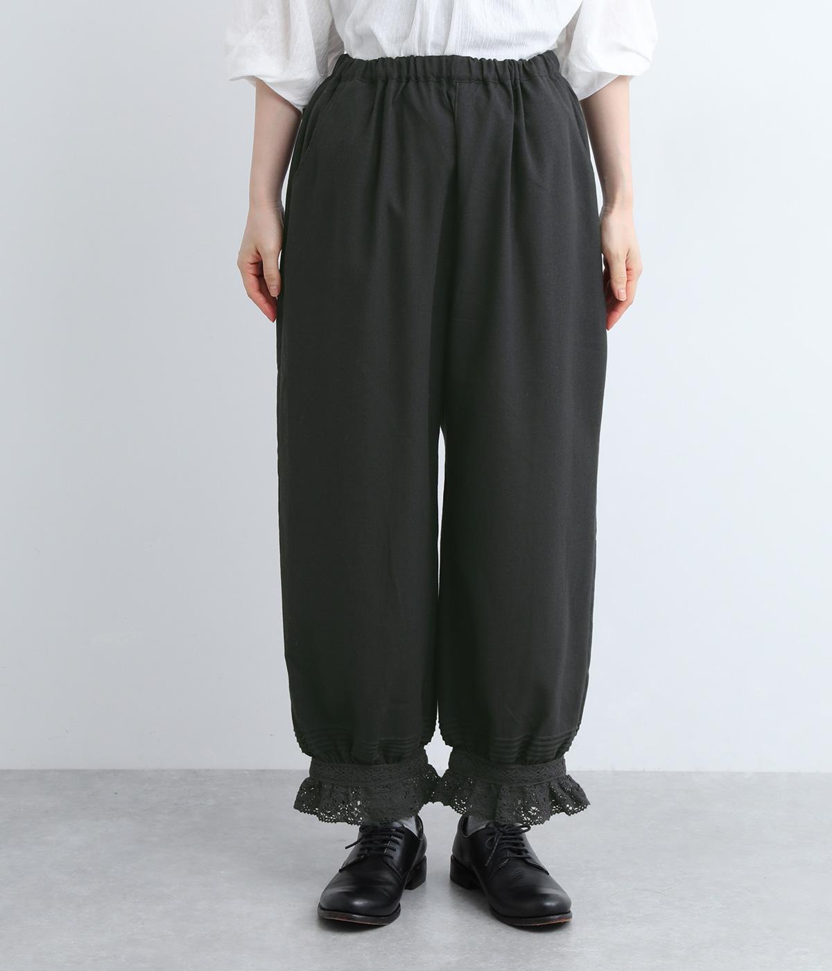 裾にピンタックやレースをはしらせたキャンディシルエットに仕上げたパンツです。裾にポイントがあるのでシューズ合わせがたのしめ、ワンピースなどのインナーにも活躍。ウエストは総ゴム&内紐のイージー仕様です。
