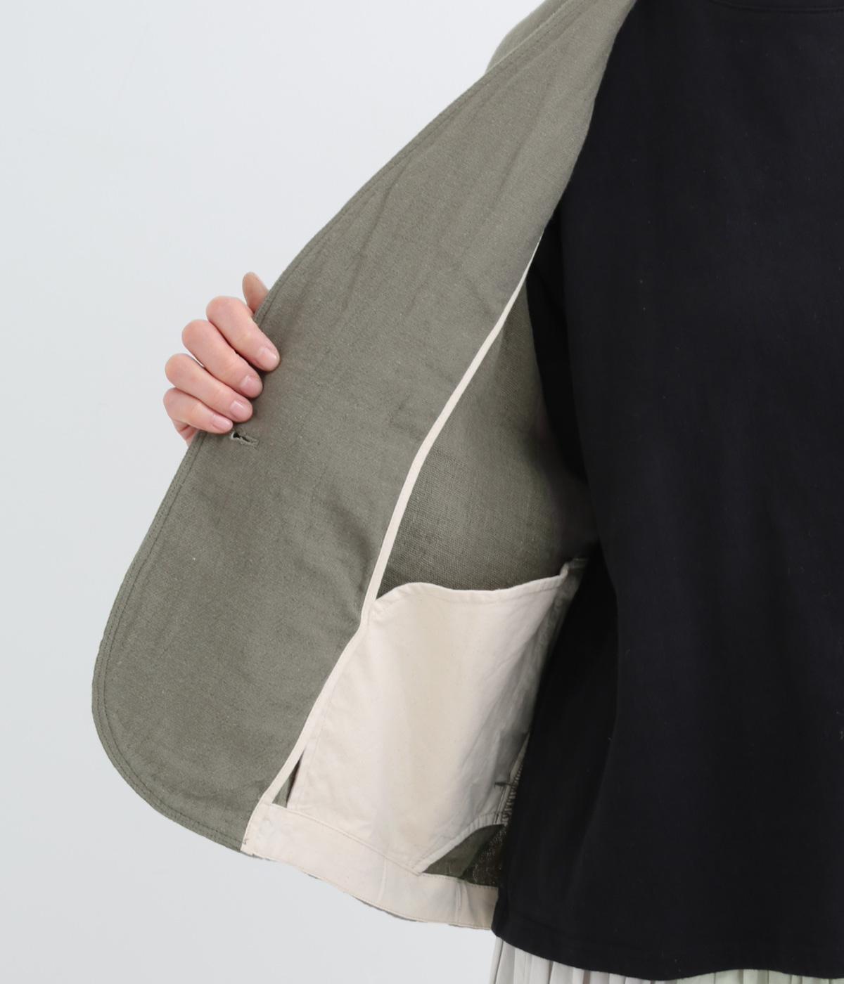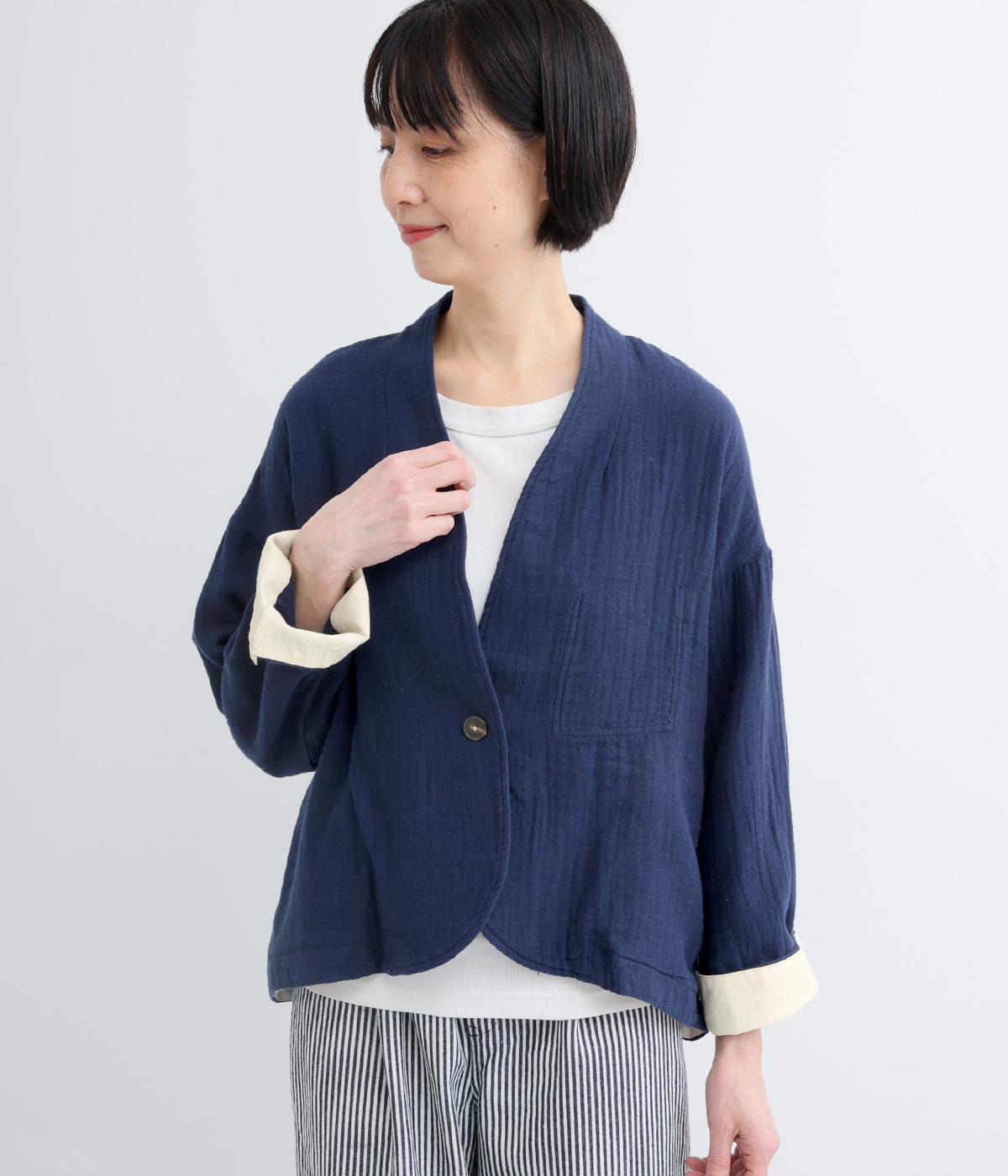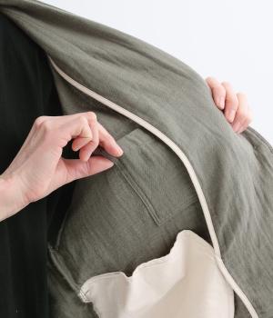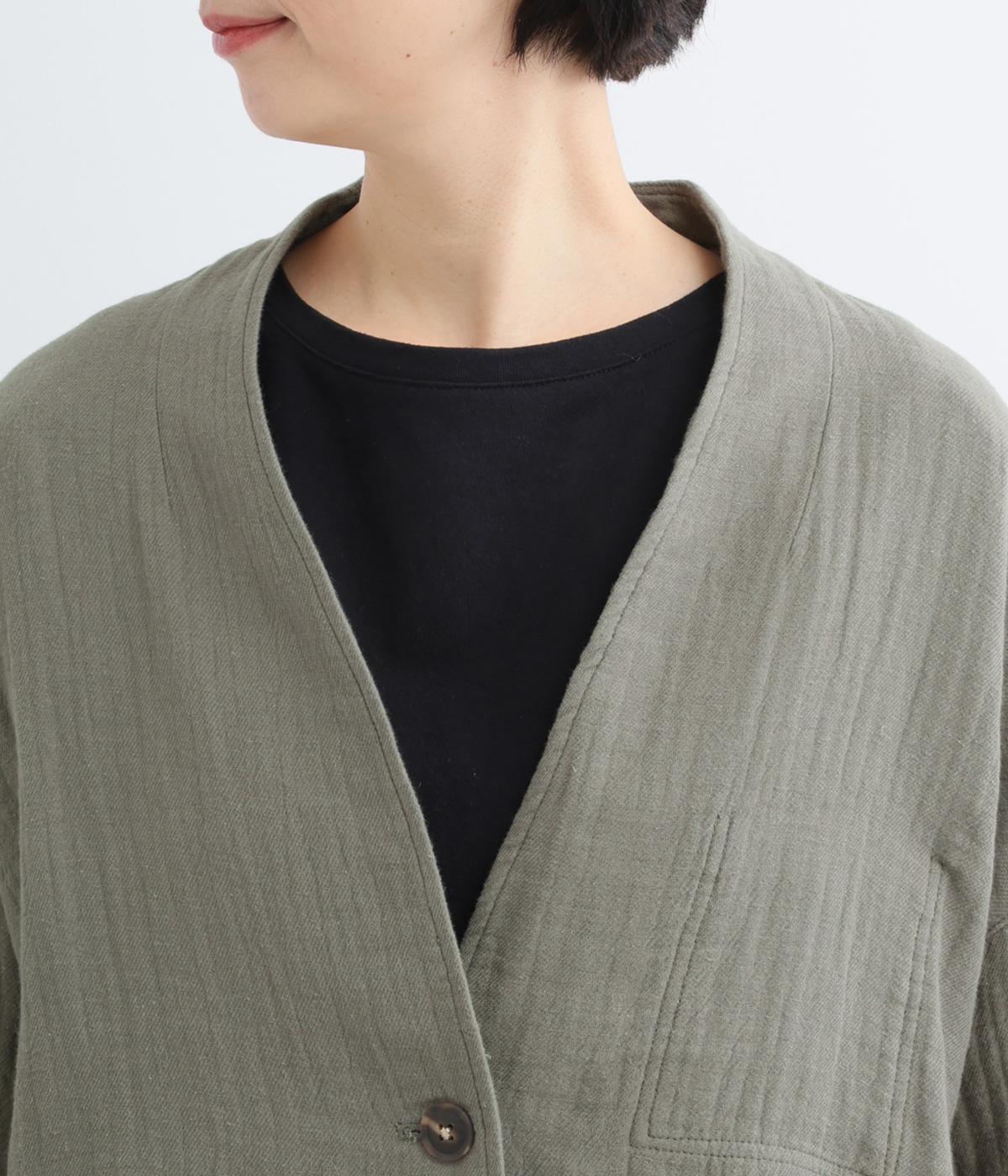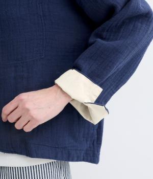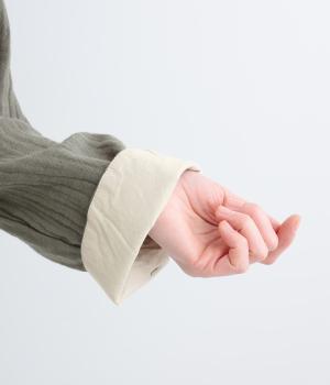 ゆるやかな裾の曲線がやわらかな雰囲気を演出します。ゆったりとした身幅に深めのVネックを合わせ、すっきりとしたバランスに仕上げました。袖口の裏には生成りの別布をあしらい、折り返せば手元に明るいアクセントを添えてくれます。
