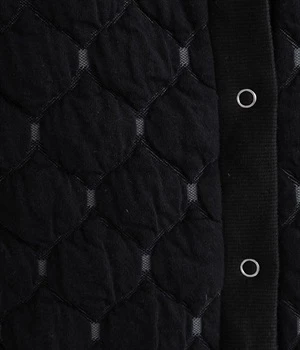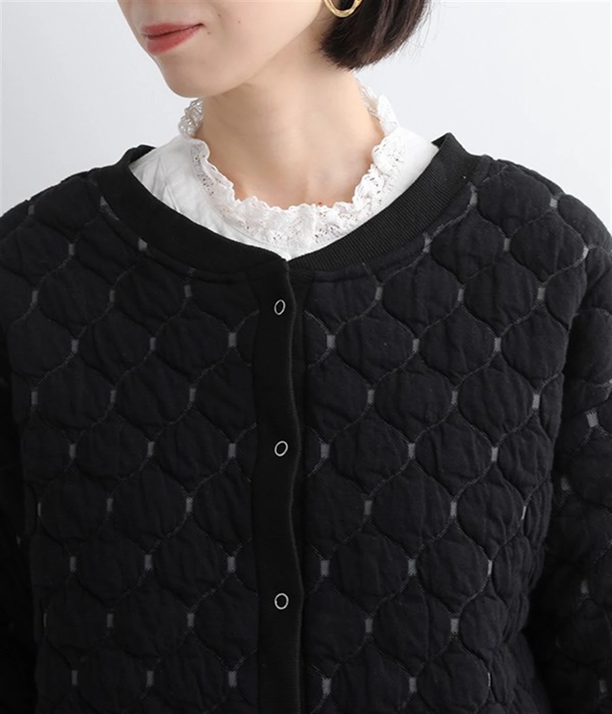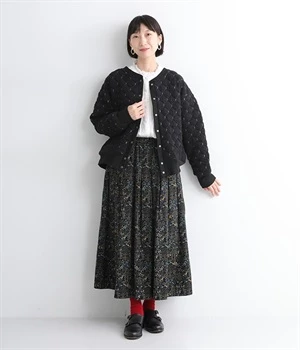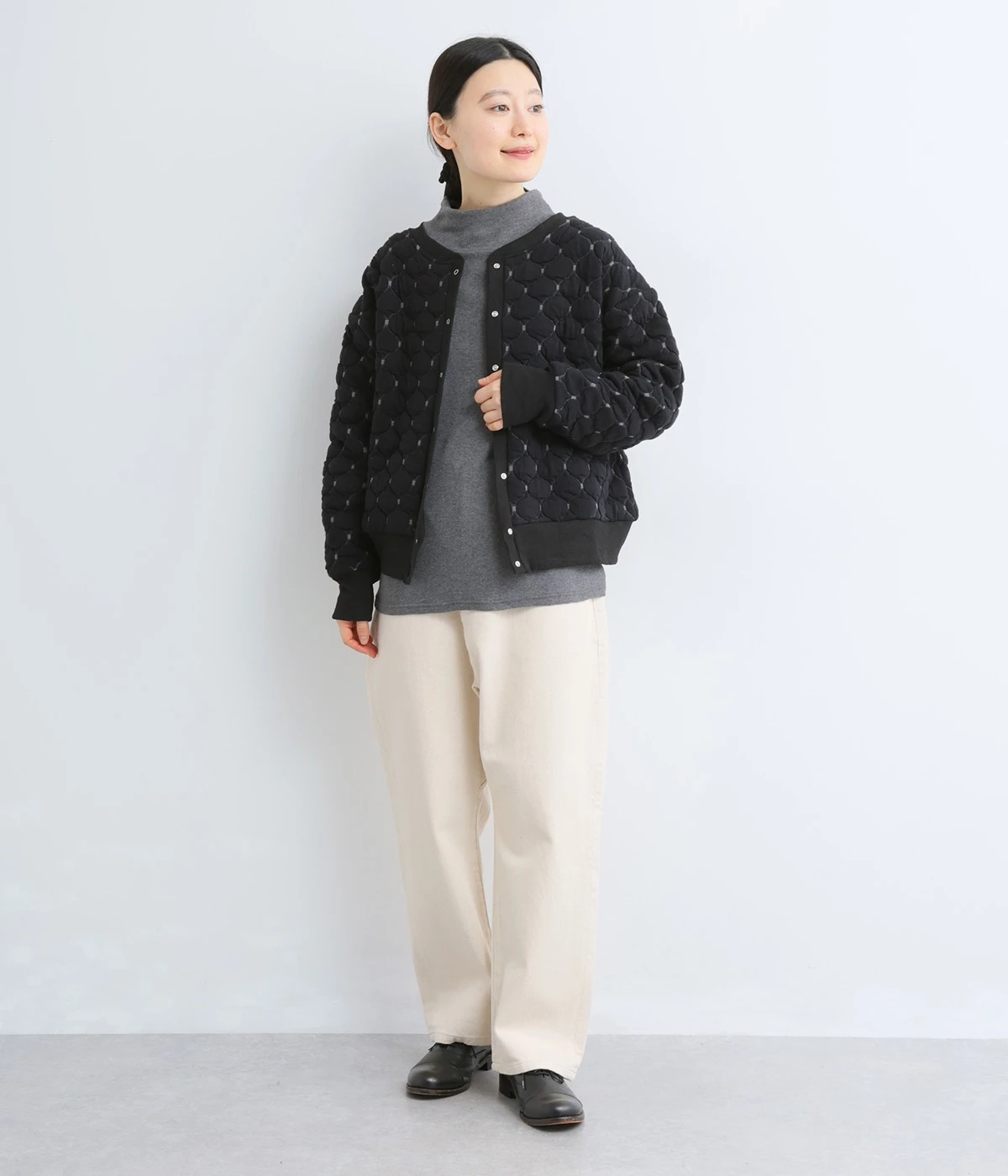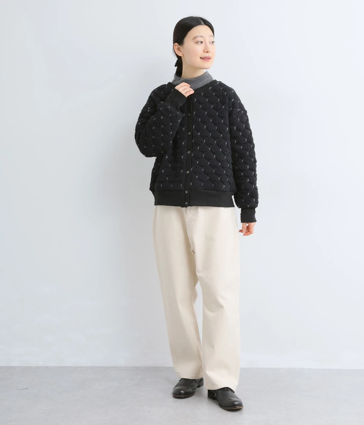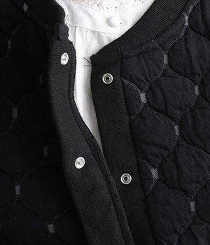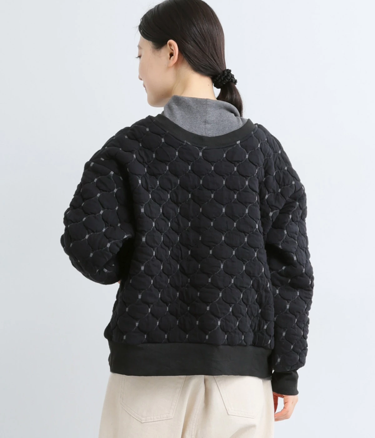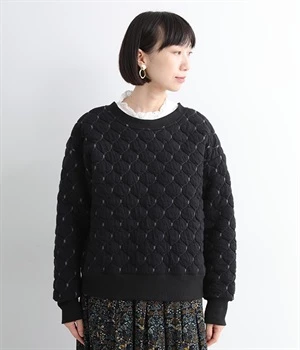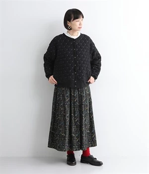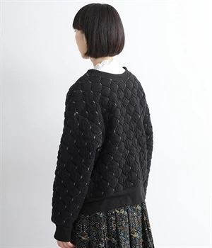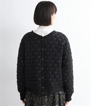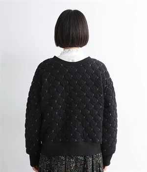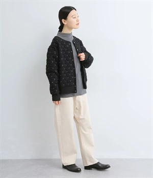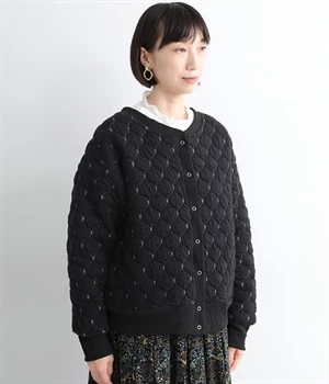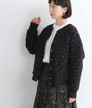 高密度に編み立てたオリジナルのキルト加工を施したジャカードブルゾン。ボタン面とクルーネック面、どちらもフロントにできる2WAYデザインです。着心地はとても軽く、負担がかかりやすい前立てや袖先はリブで仕立てに。開けたり閉めたりの動作が簡単に行えるドットボタン仕様です。ウエストほどのコンパクトな着丈で、ワイドパンツや分量感のあるスカートとの相性も抜群です。