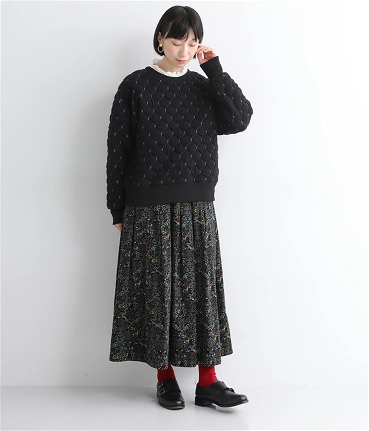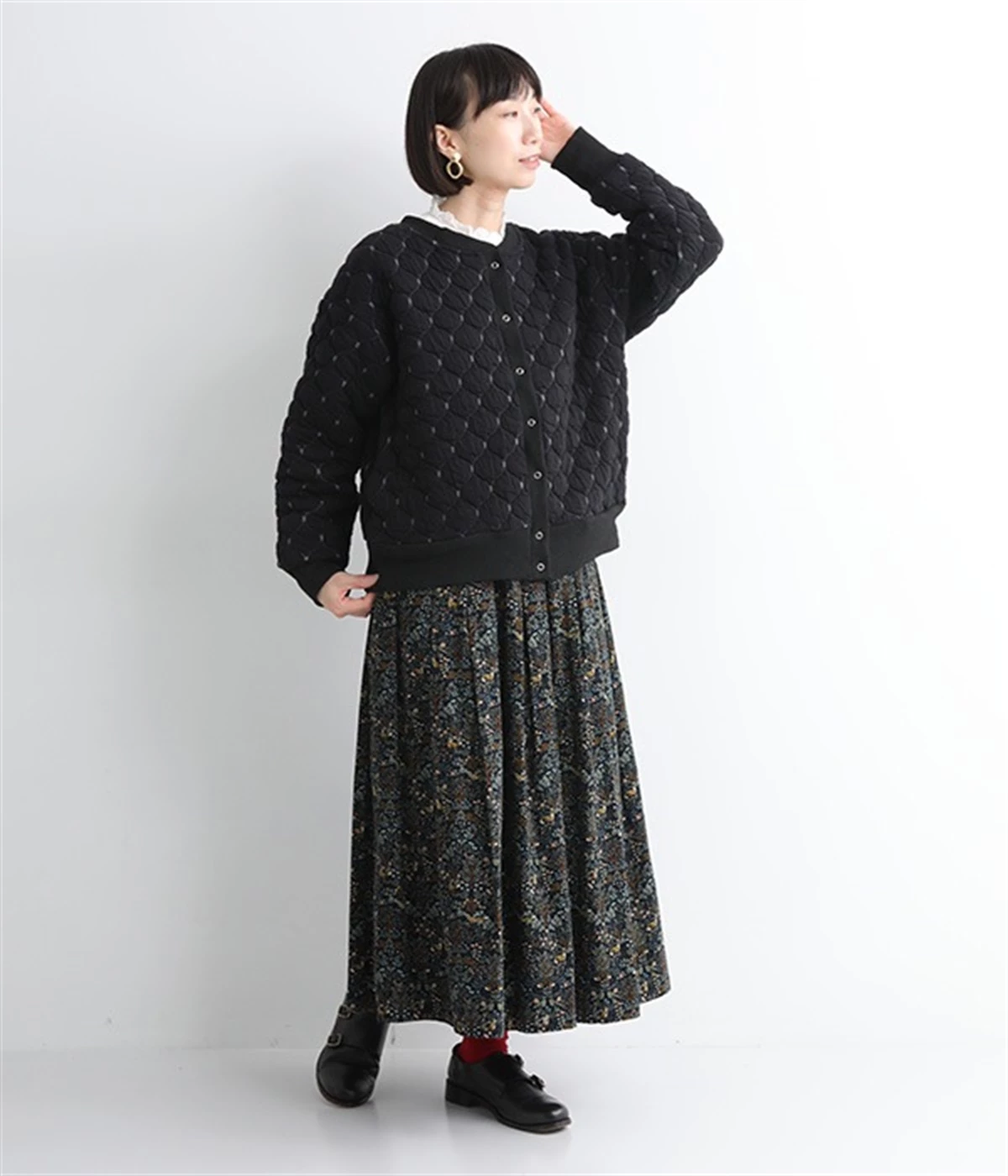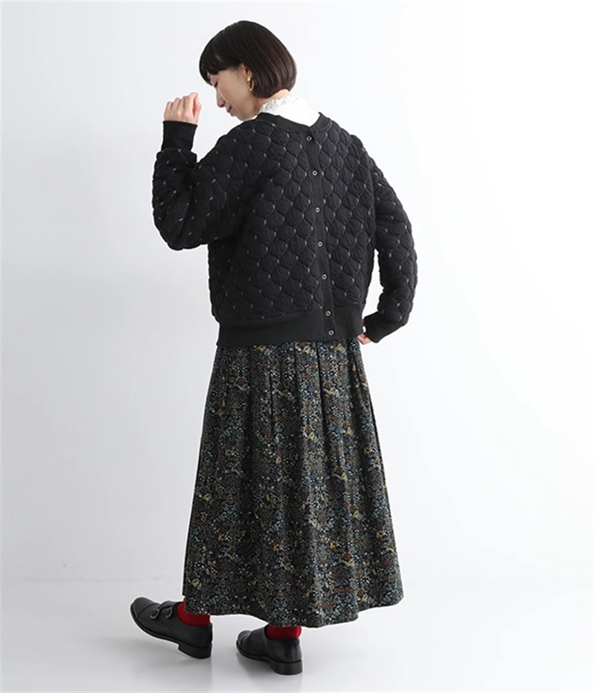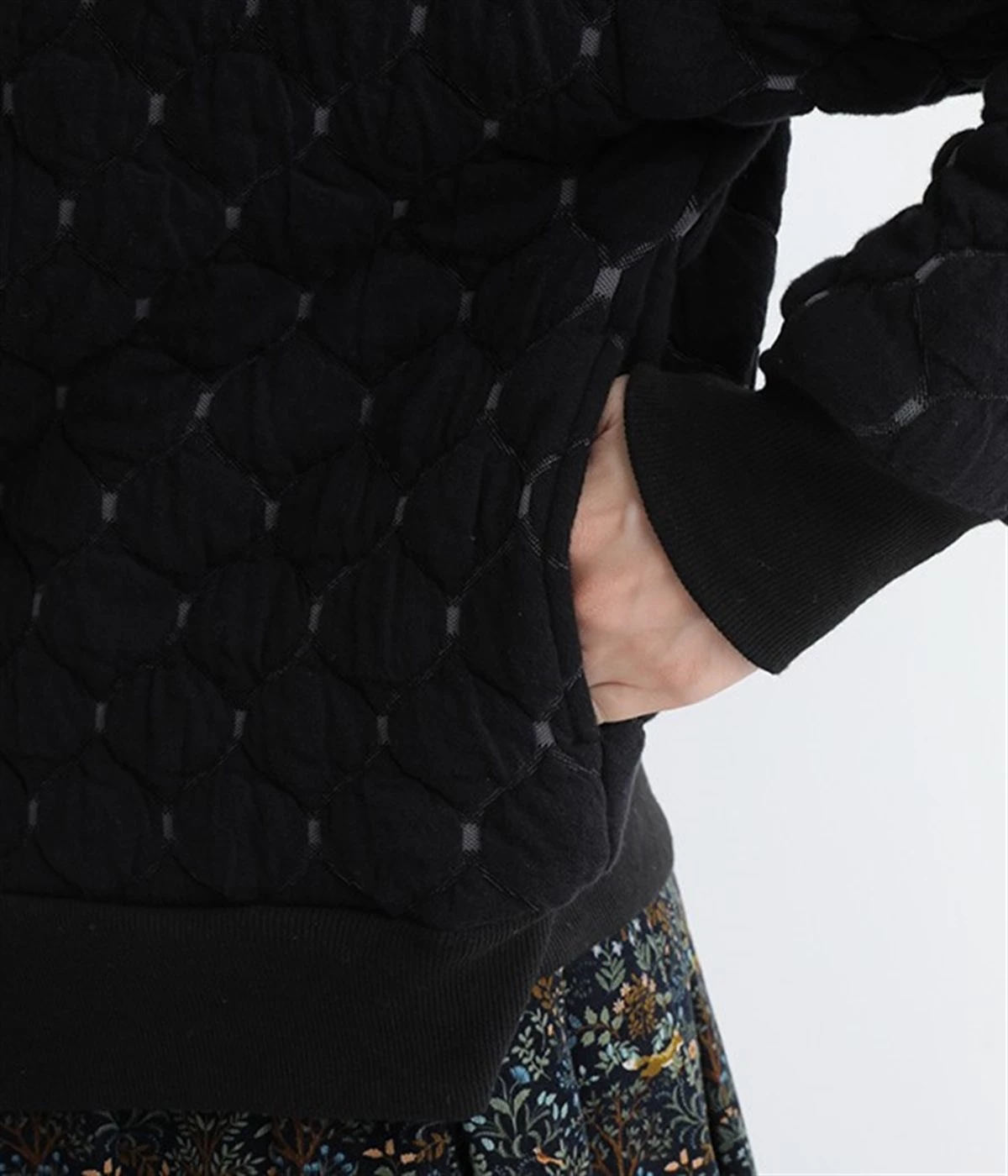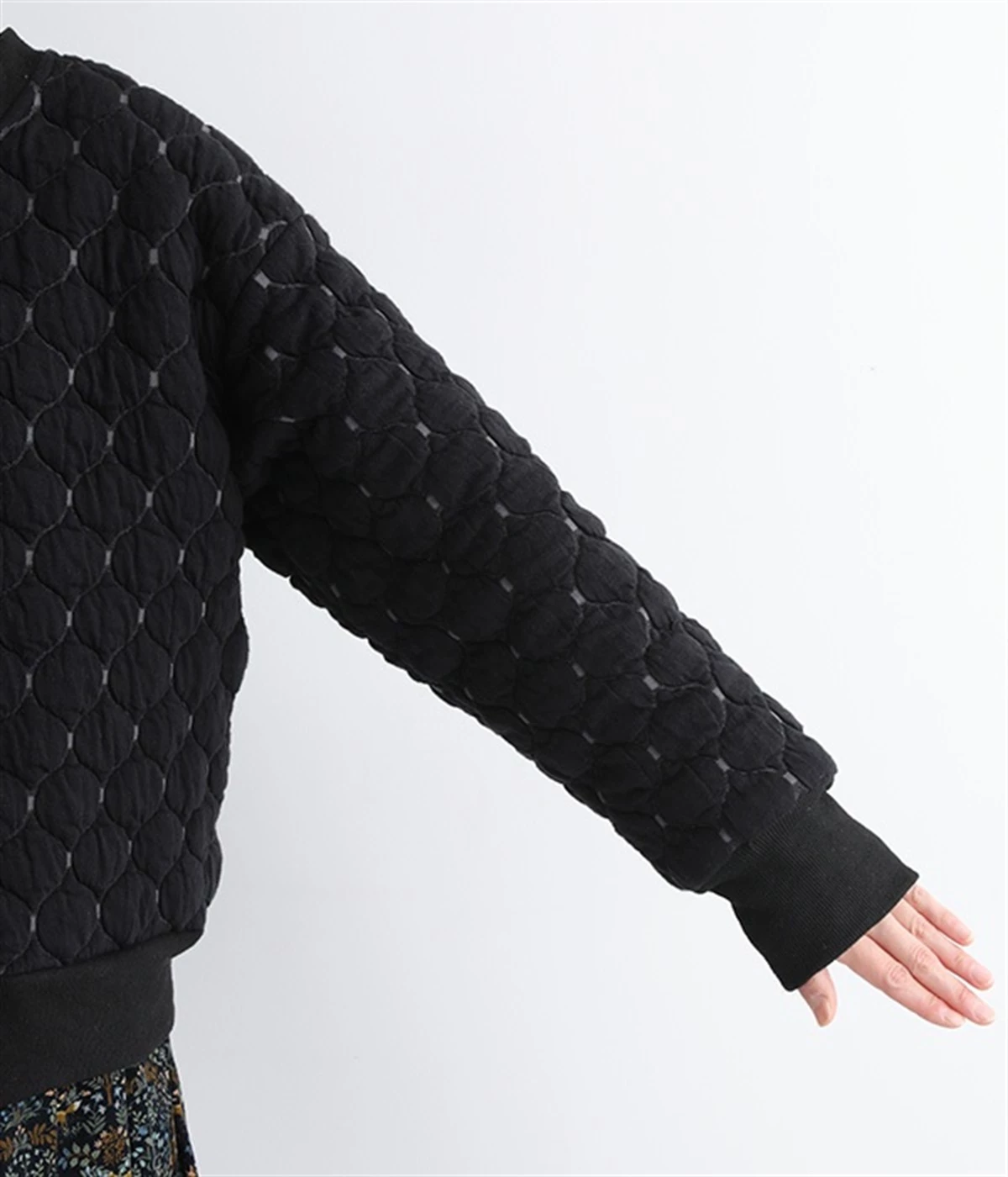 高密度に編み立てたオリジナルのキルト加工を施したジャカードブルゾン。ボタン面とクルーネック面、どちらもフロントにできる2WAYデザインです。着心地はとても軽く、負担がかかりやすい前立てや袖先はリブで仕立てに。開けたり閉めたりの動作が簡単に行えるドットボタン仕様です。ウエストほどのコンパクトな着丈で、ワイドパンツや分量感のあるスカートとの相性も抜群です。