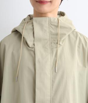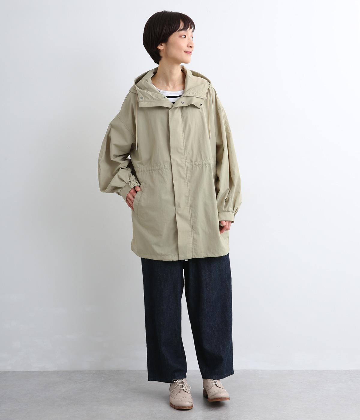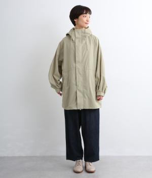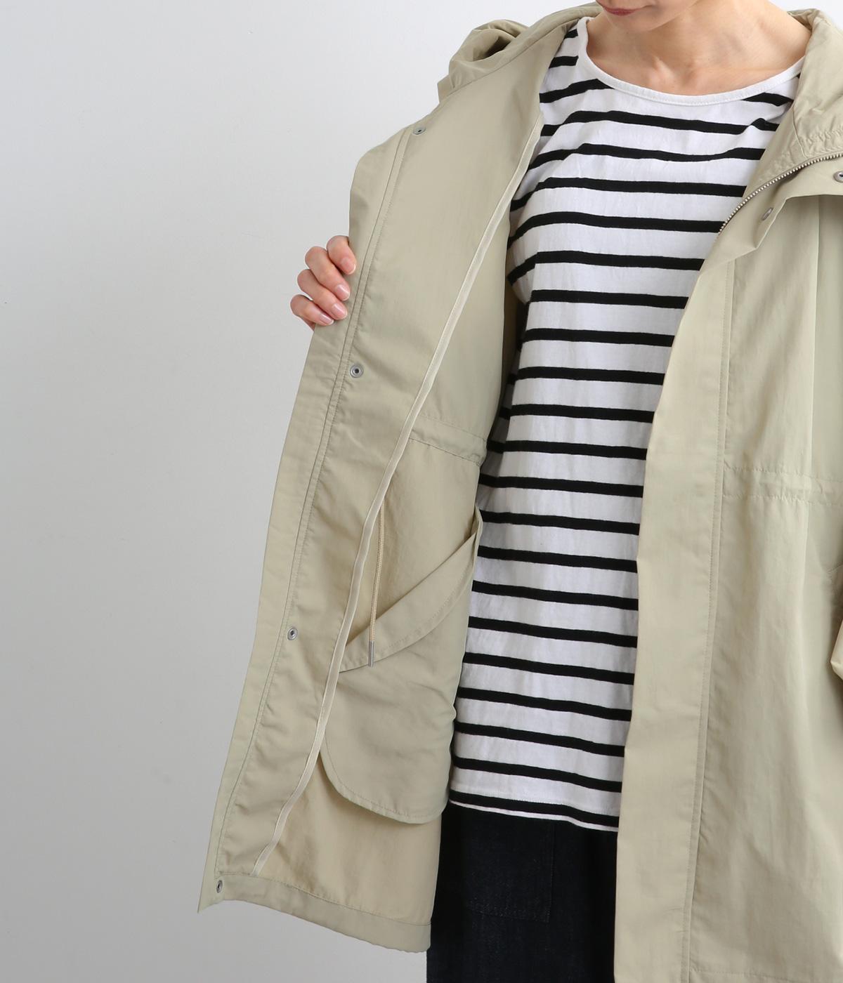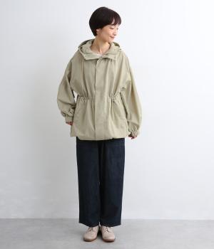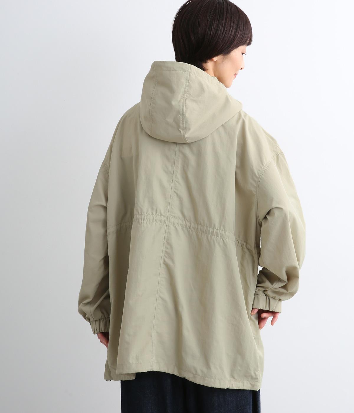花粉がつきにくく落ちやすい加工をほどこした生地を用い、ハイキングなどアクティブなシーンに活躍するフードつきマウンテンパーカー。ヒップがすっぽり収まるミディ丈で、ウエストや裾はアジャスターでギャザー寄せも◎。