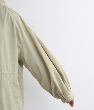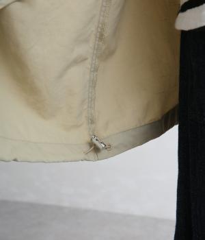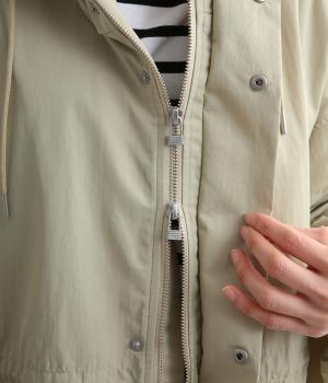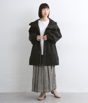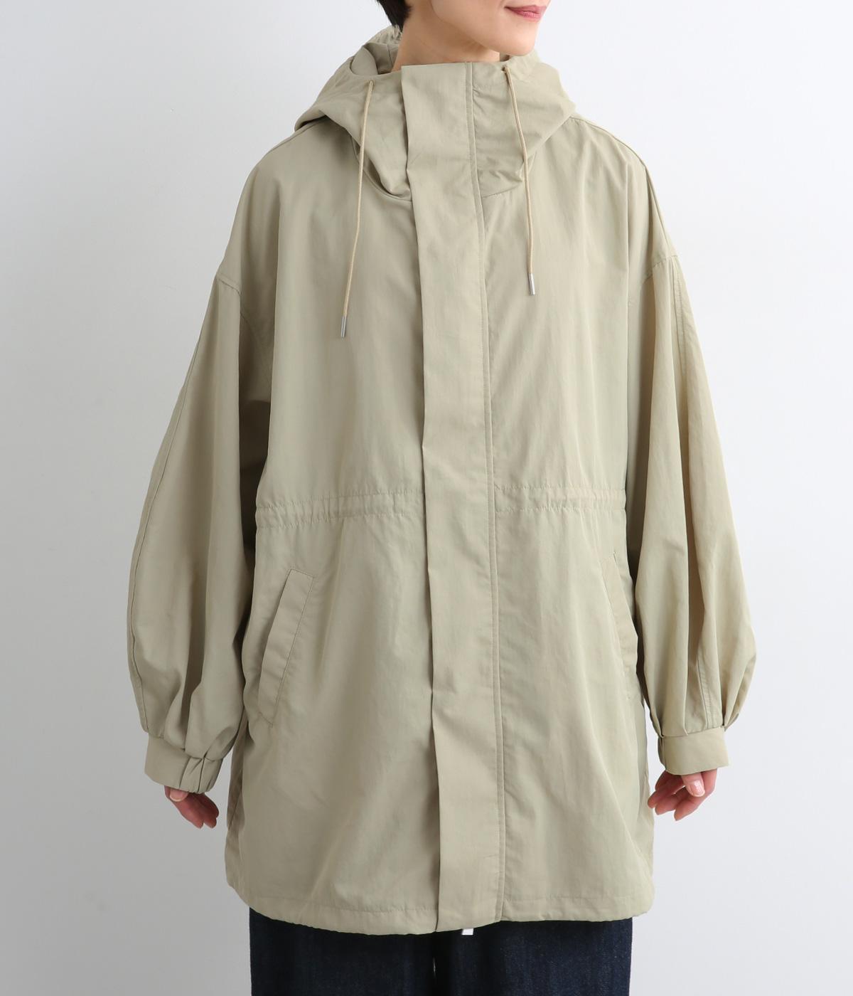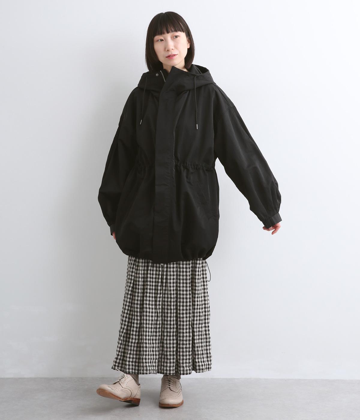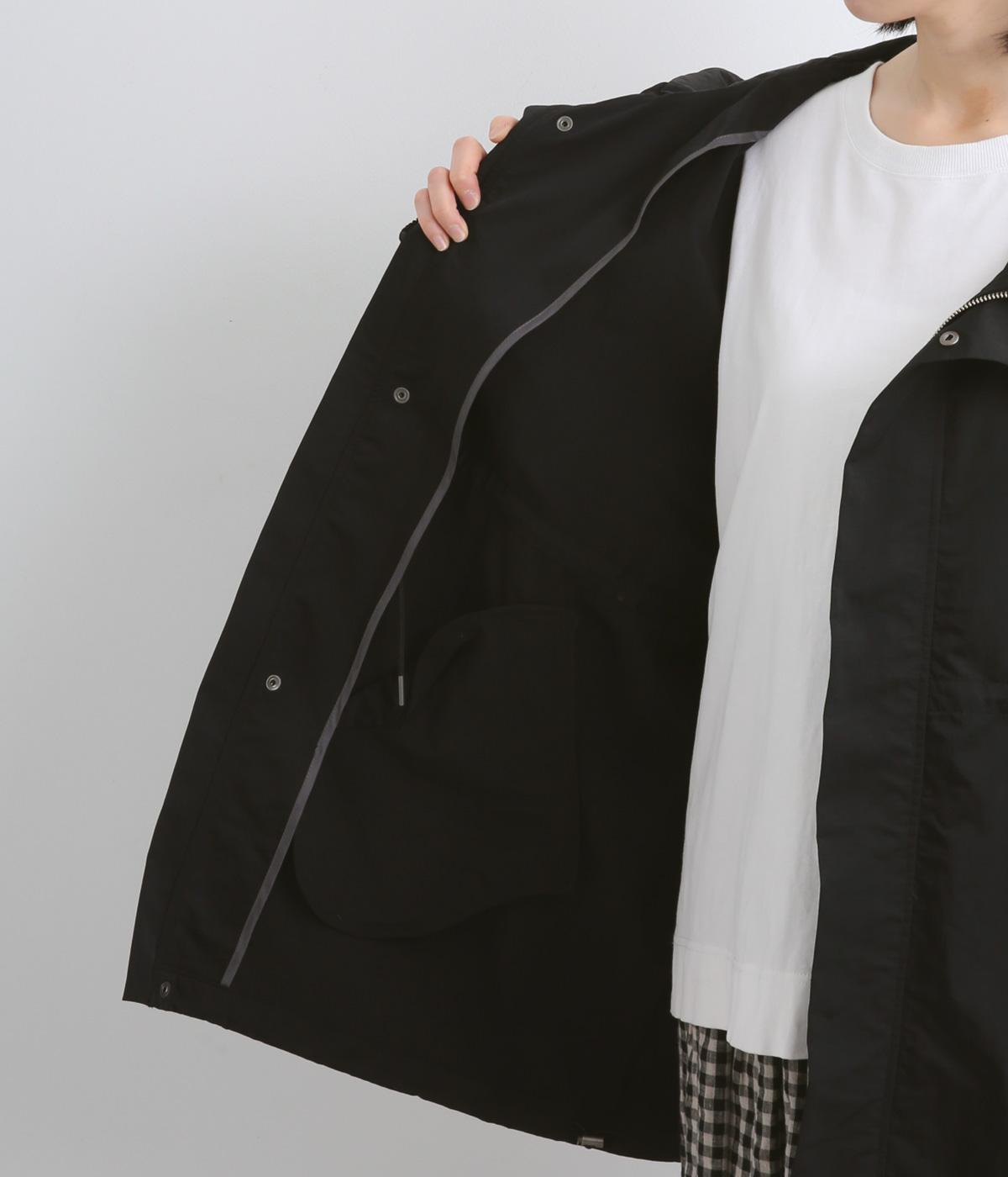 花粉がつきにくく落ちやすい加工をほどこした生地を用い、ハイキングなどアクティブなシーンに活躍するフードつきマウンテンパーカー。ヒップがすっぽり収まるミディ丈で、ウエストや裾はアジャスターでギャザー寄せも◎。