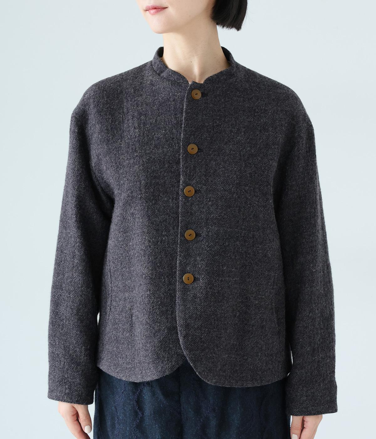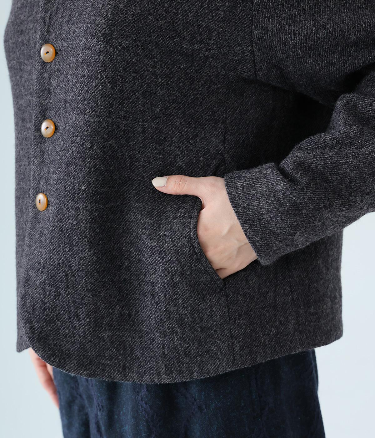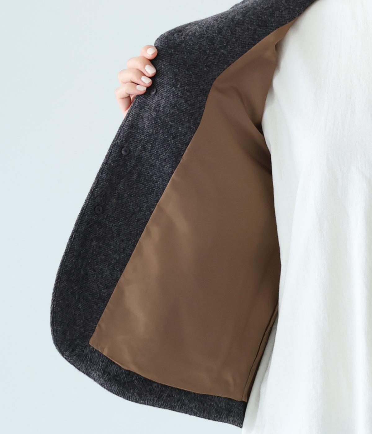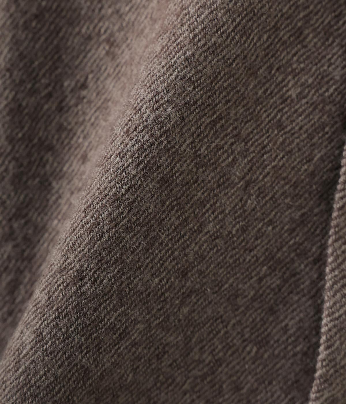 ウールを用いて適度な厚みとあたたかみがありつつ軽やかな風合の綾織り生地に仕立てました。斜めの細かな畝が見える起毛がかった上品な表面が魅力です。さらりとした滑りのよい裏地つき。