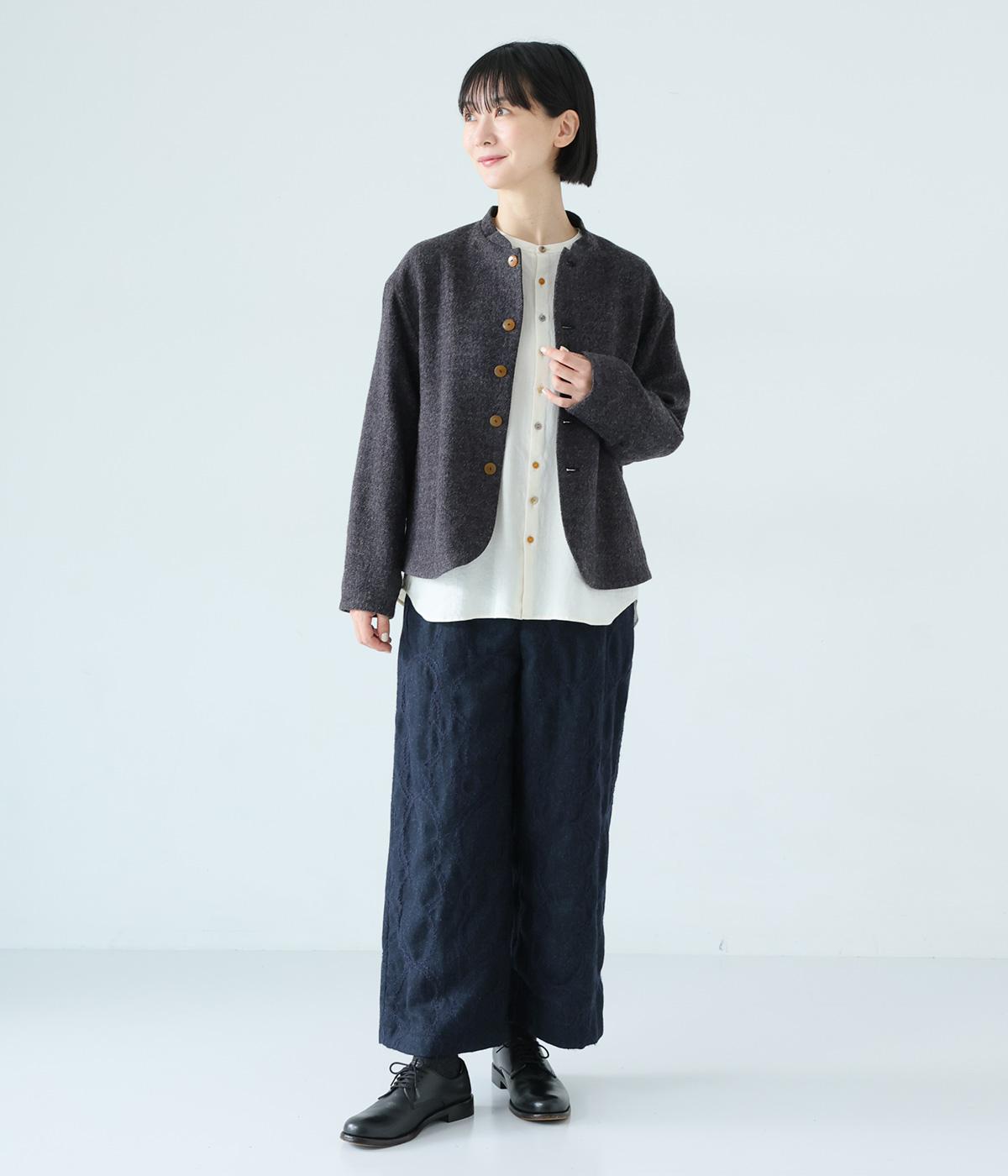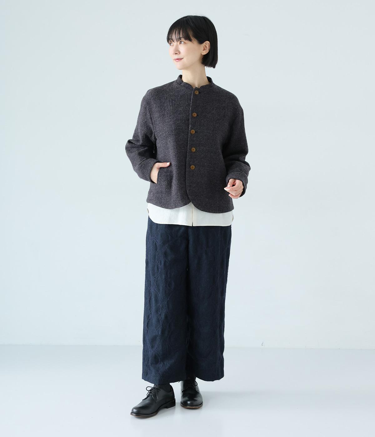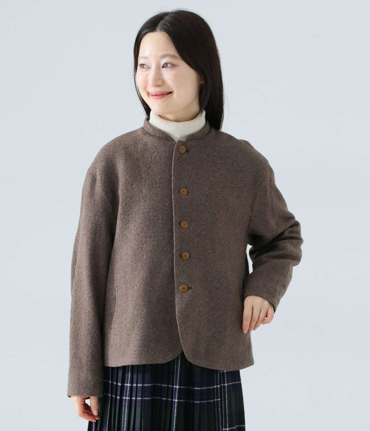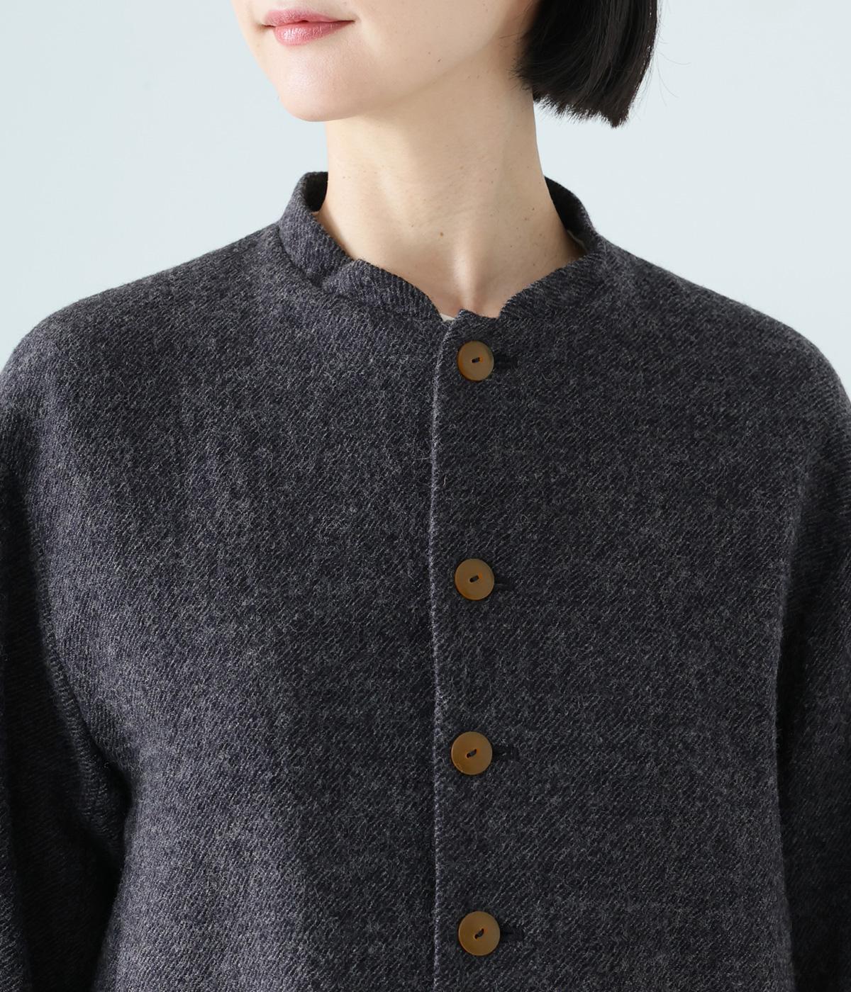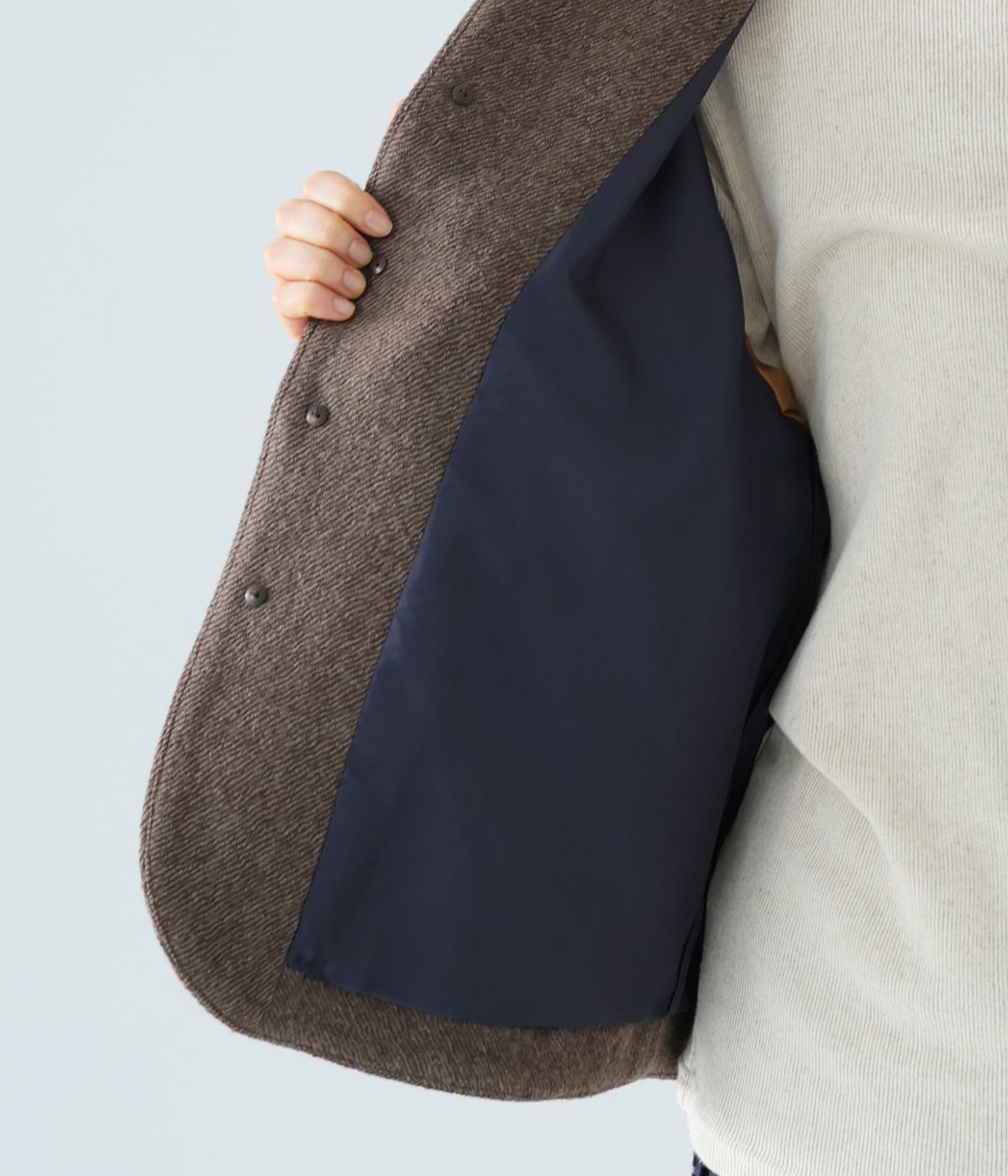 ウールを用いて適度な厚みとあたたかみがありつつ軽やかな風合の綾織り生地に仕立てました。斜めの細かな畝が見える起毛がかった上品な表面が魅力です。さらりとした滑りのよい裏地つき。