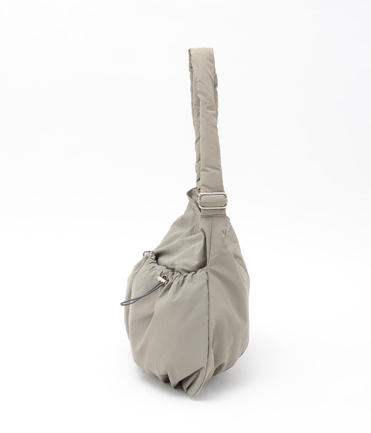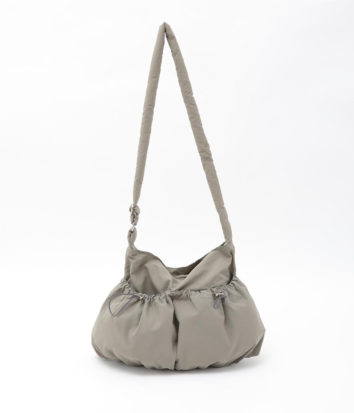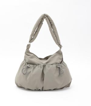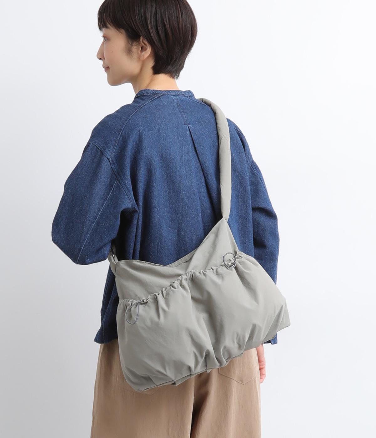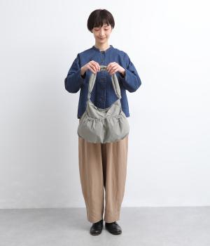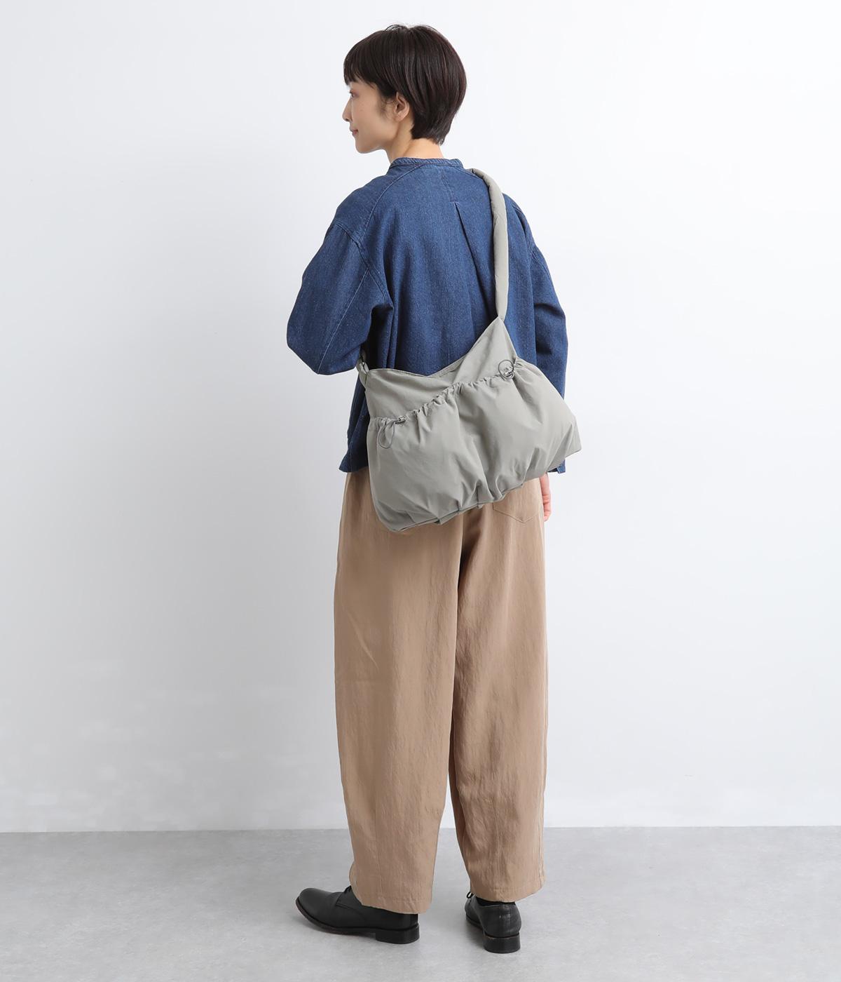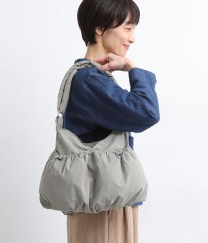 ギャザーを寄せた丸みのあるフォルムが、やさしい印象を与えるショルダーバッグです。ゴム紐でくしゅっと仕上げた外ポケットが、立体感のあるアクセントに。厚みがあるふかふかの持ち手は、肩への負担をやわらげます。内側にも2つのポケットを備え、収納力もばつぐんです。