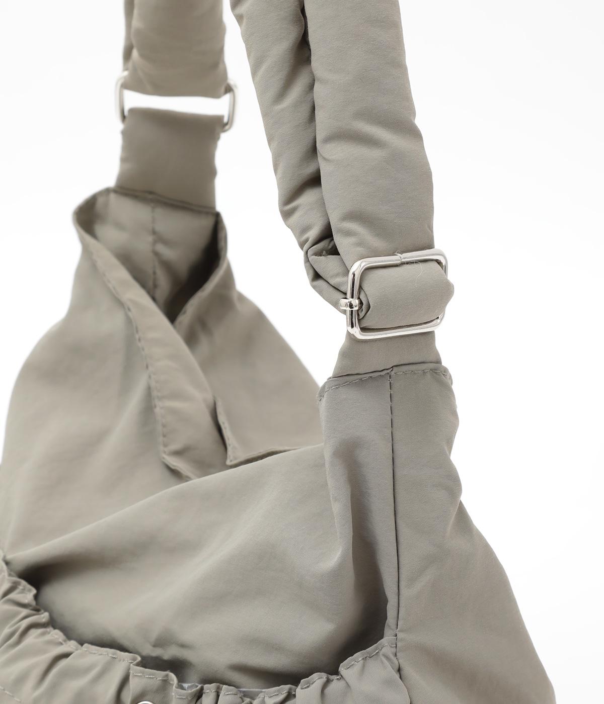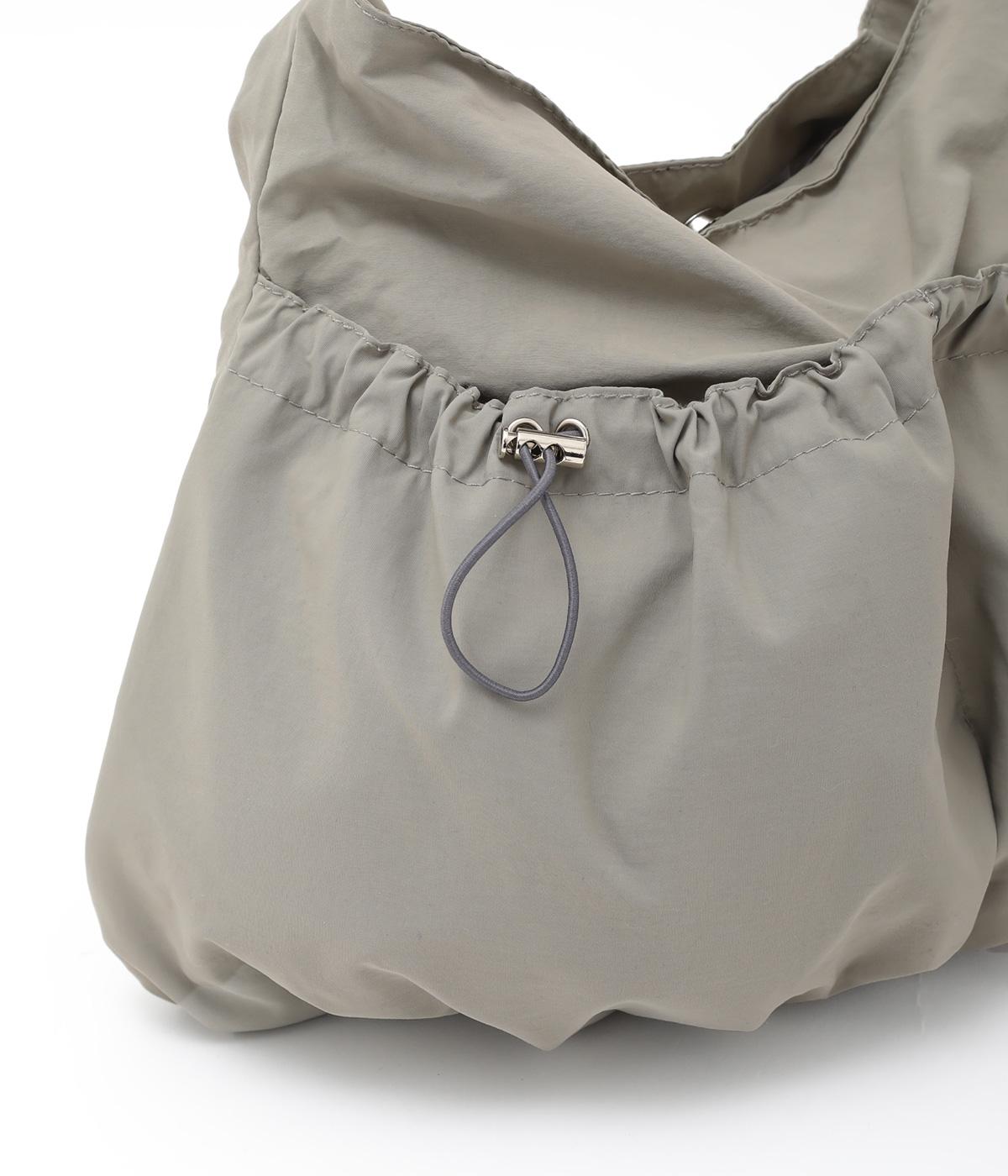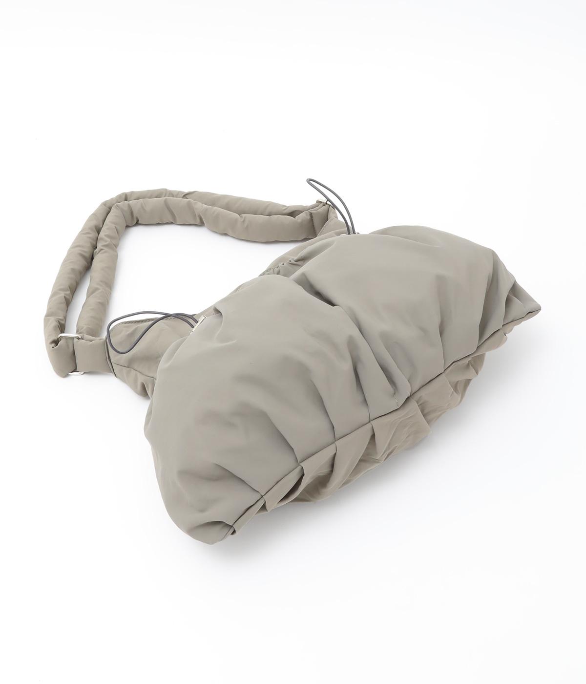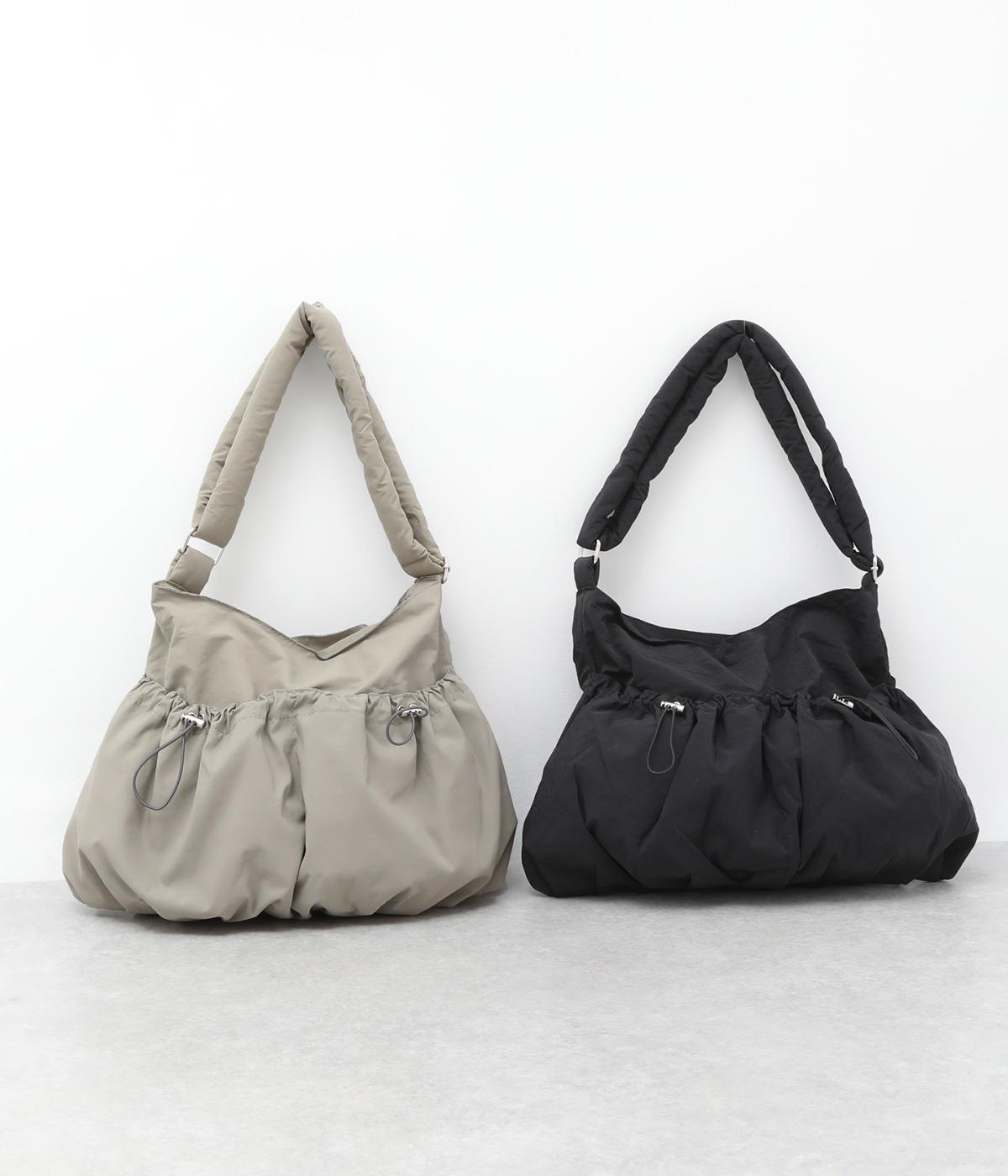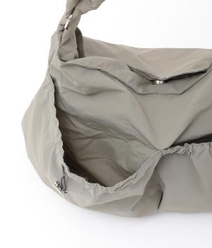 ギャザーを寄せた丸みのあるフォルムが、やさしい印象を与えるショルダーバッグです。ゴム紐でくしゅっと仕上げた外ポケットが、立体感のあるアクセントに。厚みがあるふかふかの持ち手は、肩への負担をやわらげます。内側にも2つのポケットを備え、収納力もばつぐんです。