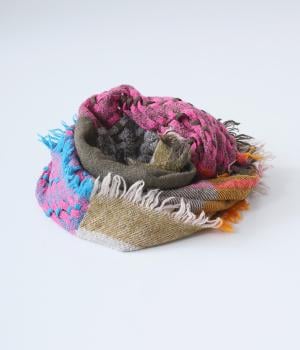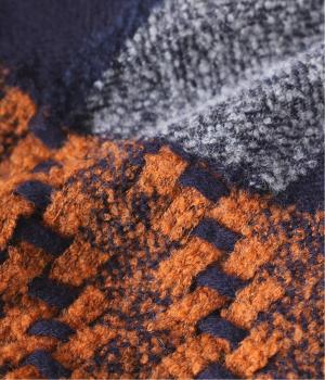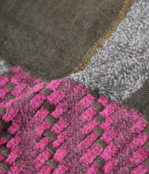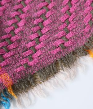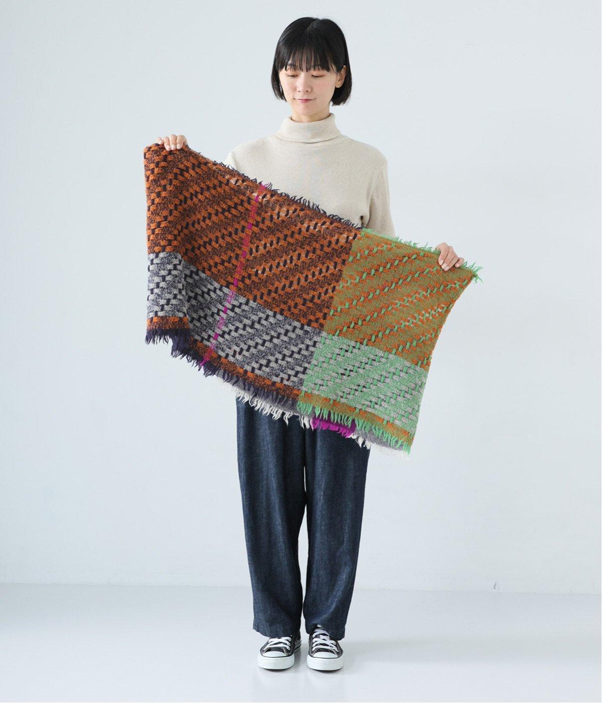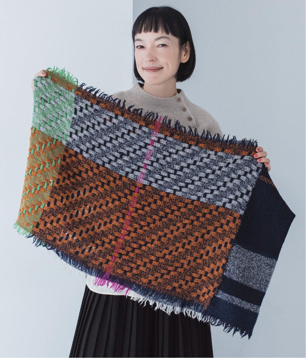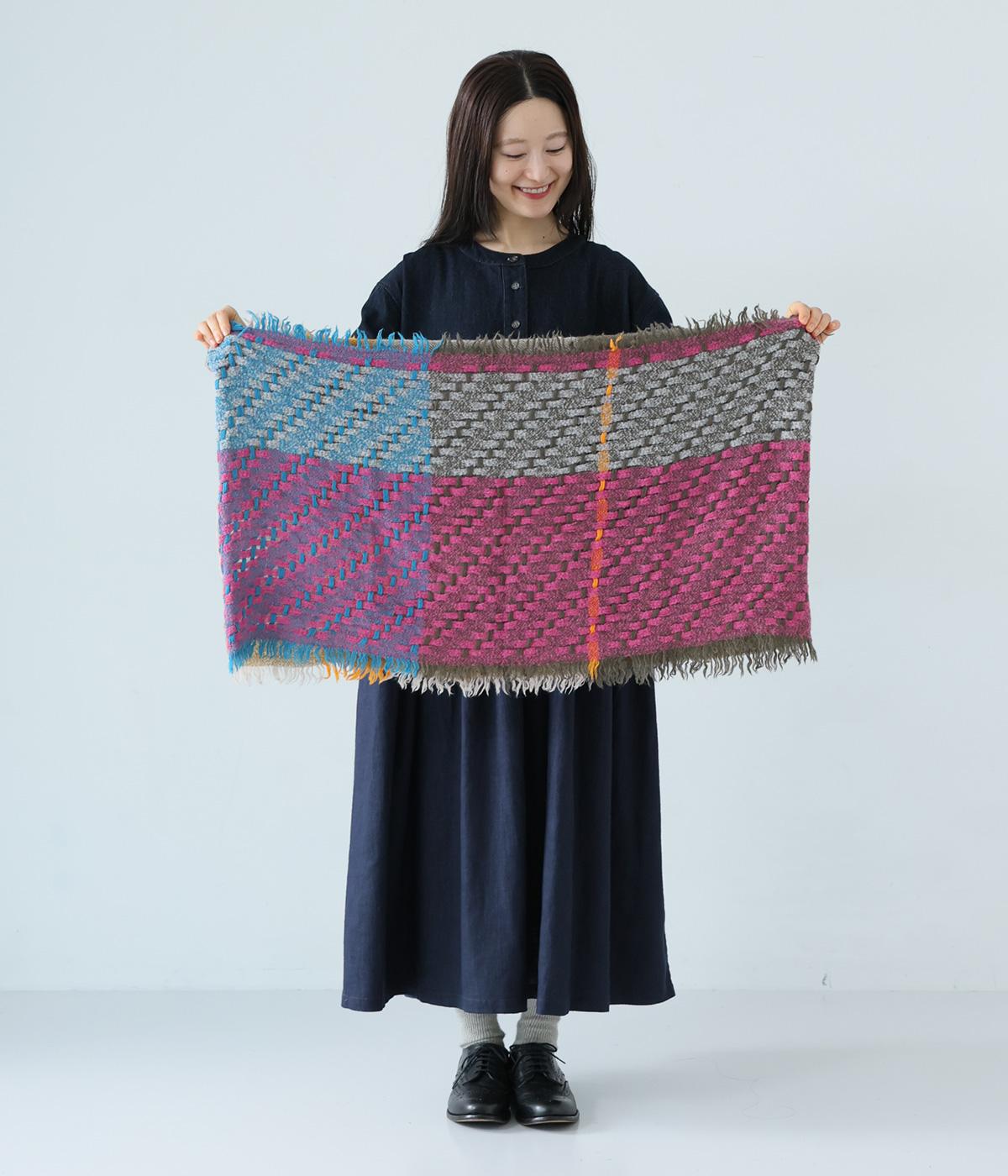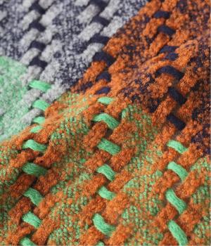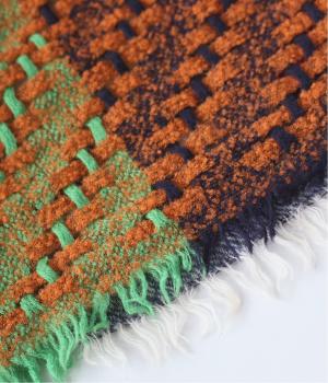 さまざまな色味と異なる織りをミックスした表情豊かな生地です。織り目がはっきりと見える立体的なバスケット織りがアクセントに。ウール混素材であたたかみがあります。