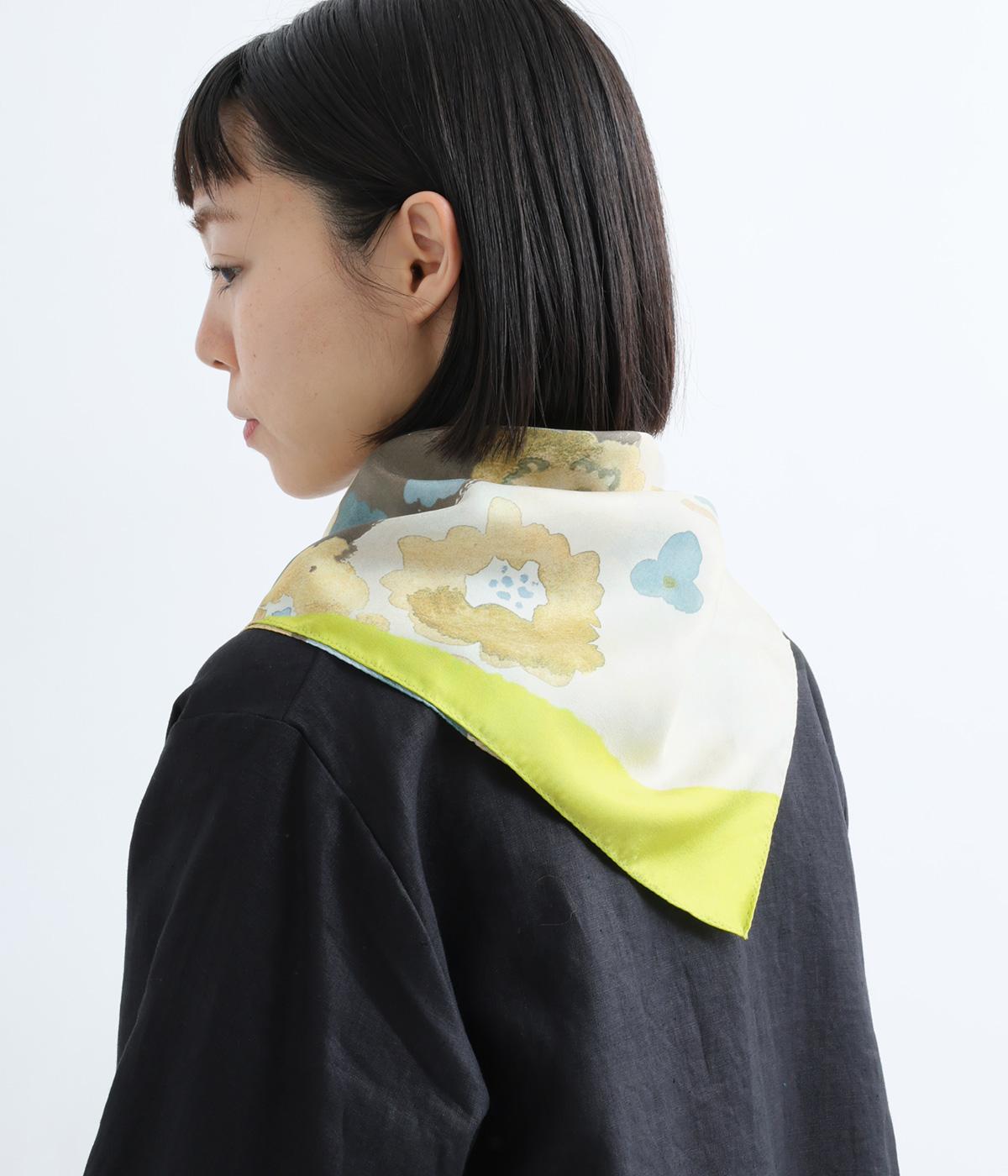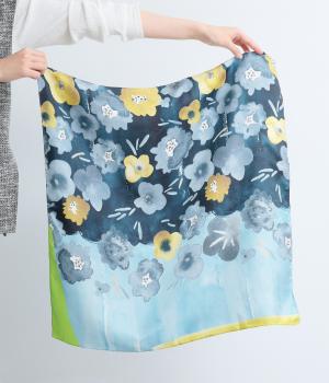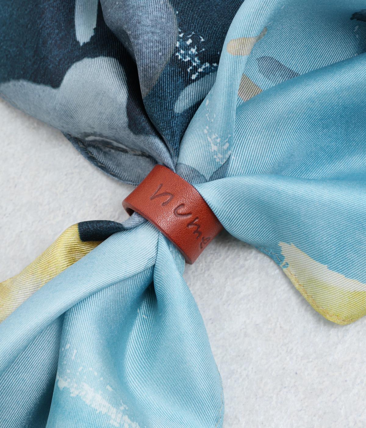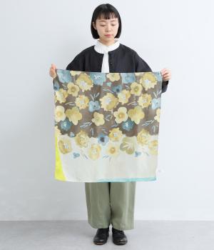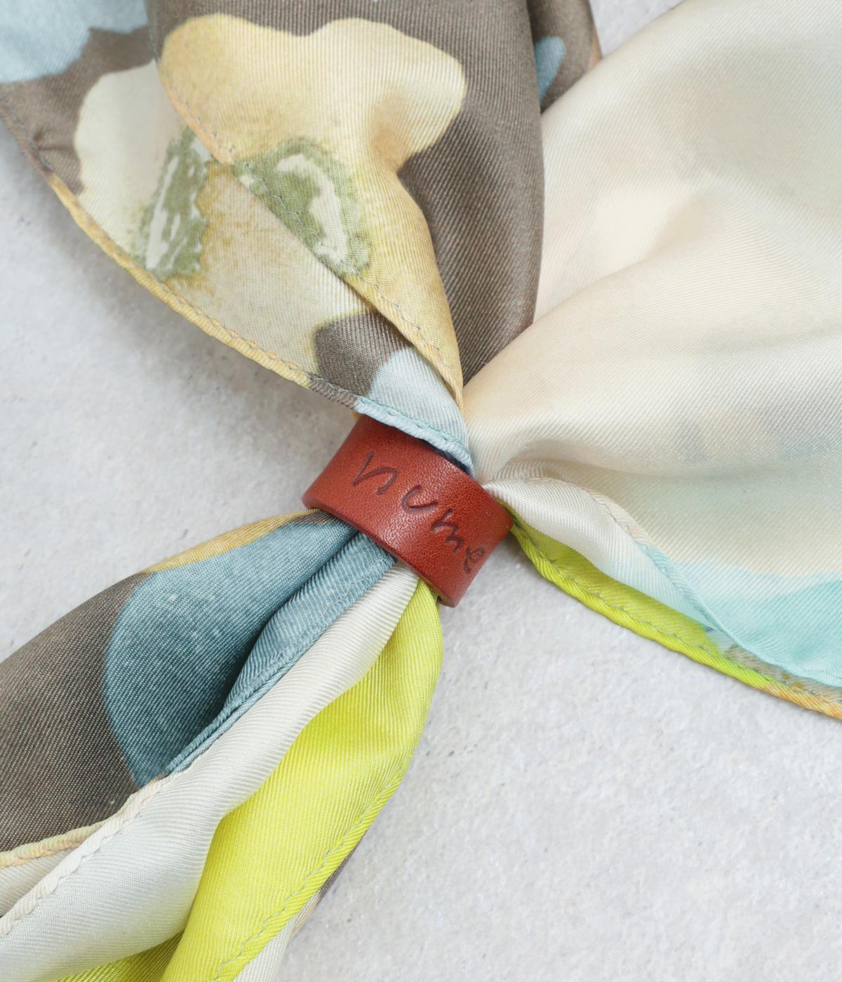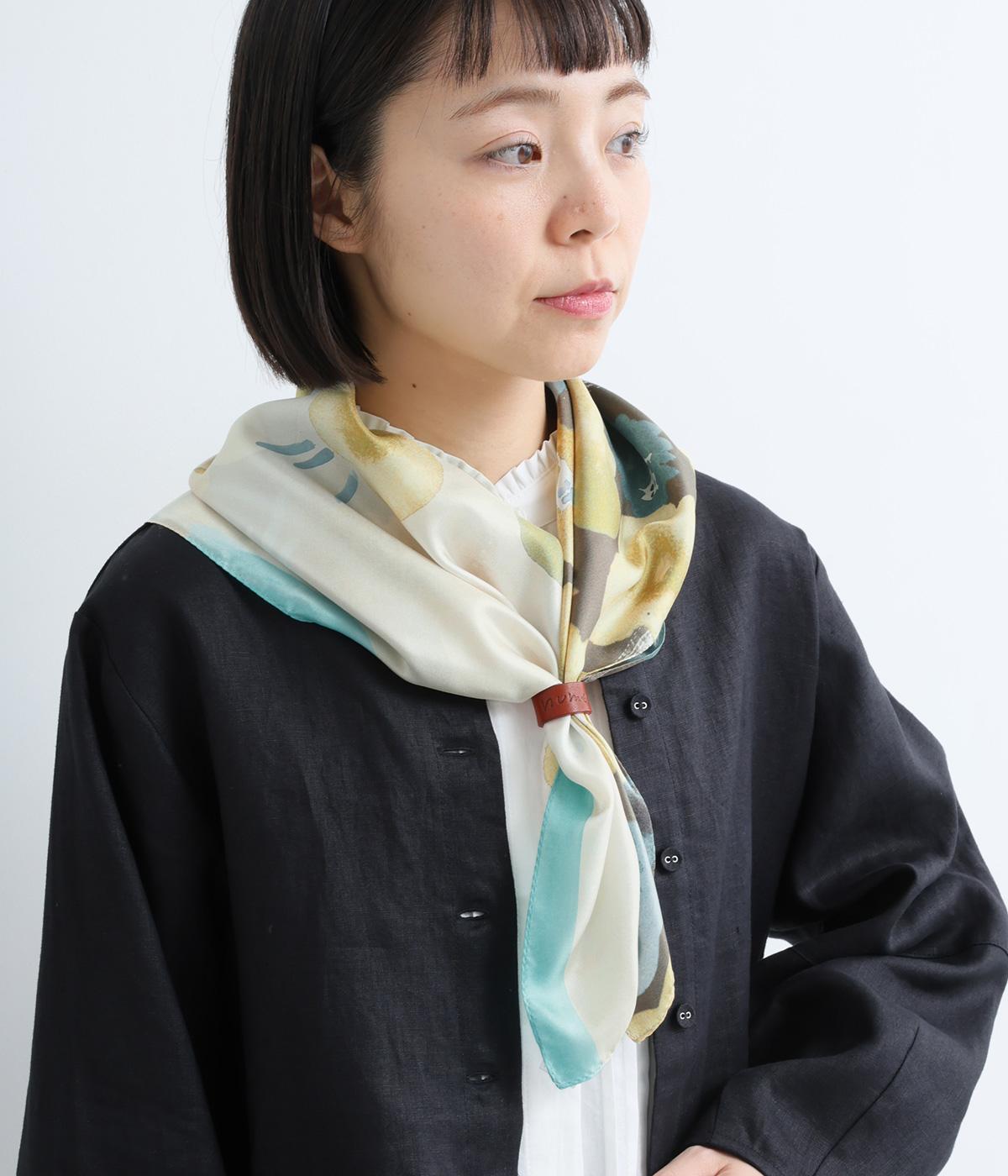 水彩画のようにやわらかなタッチで描かれたフラワー柄が印象的な、大判のスカーフです。にじむような色合いが、奥行きのある表情を生み出します。アクセントとなる差し色が入り、結び方や角度によって表情が変化。レザーリングつきなので、さっと通すだけでこなれたスタイルが完成します。