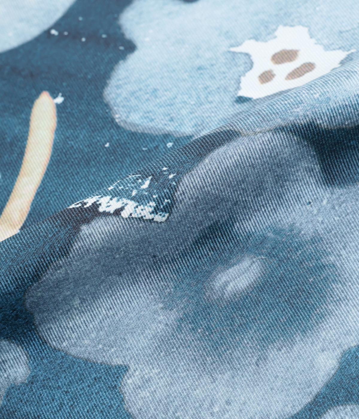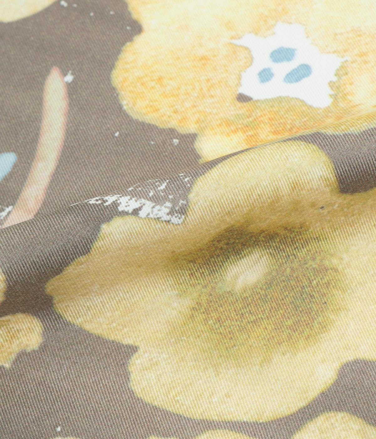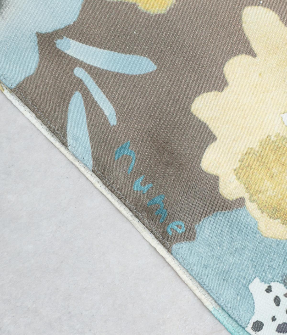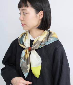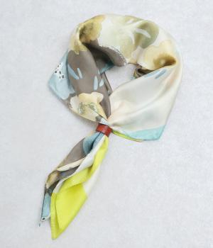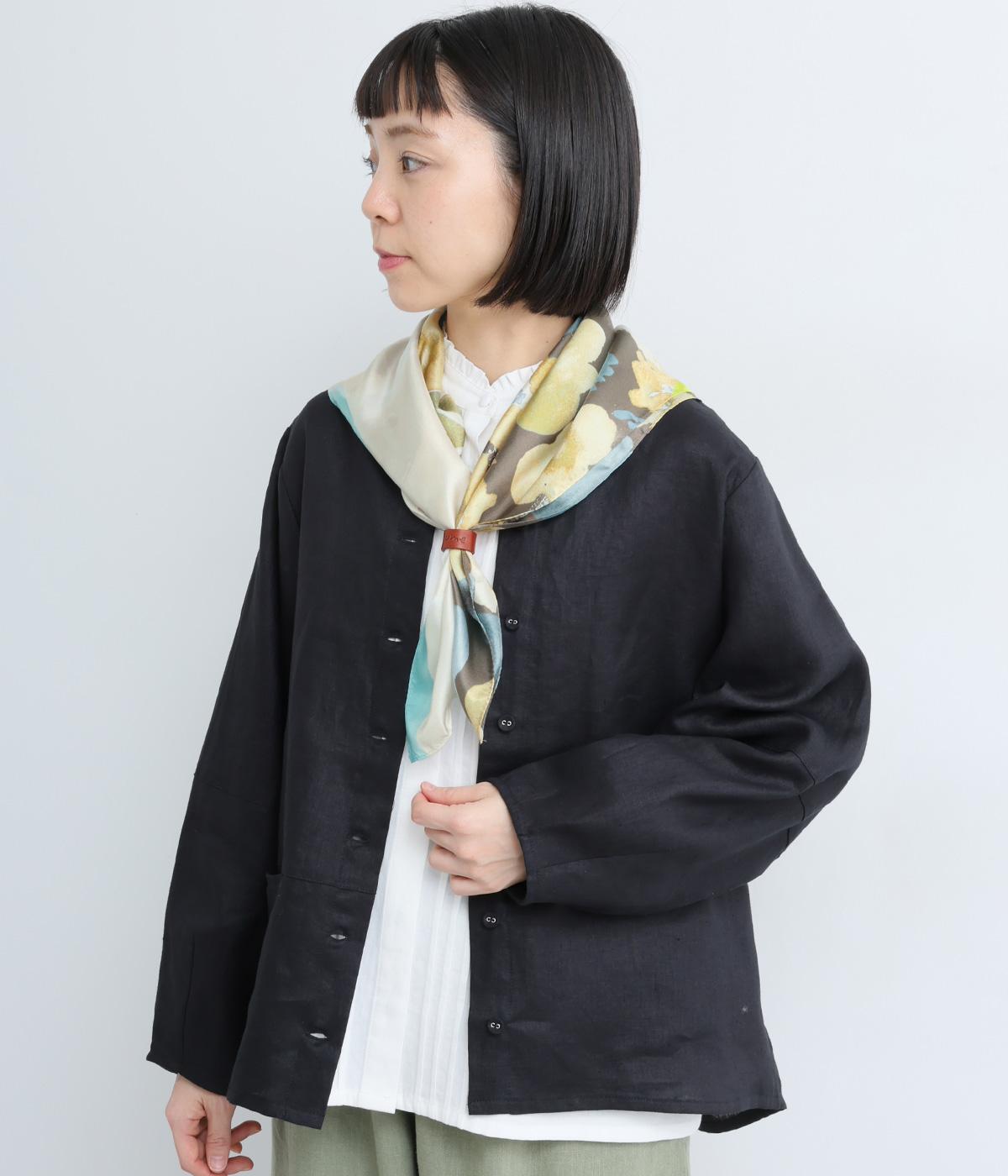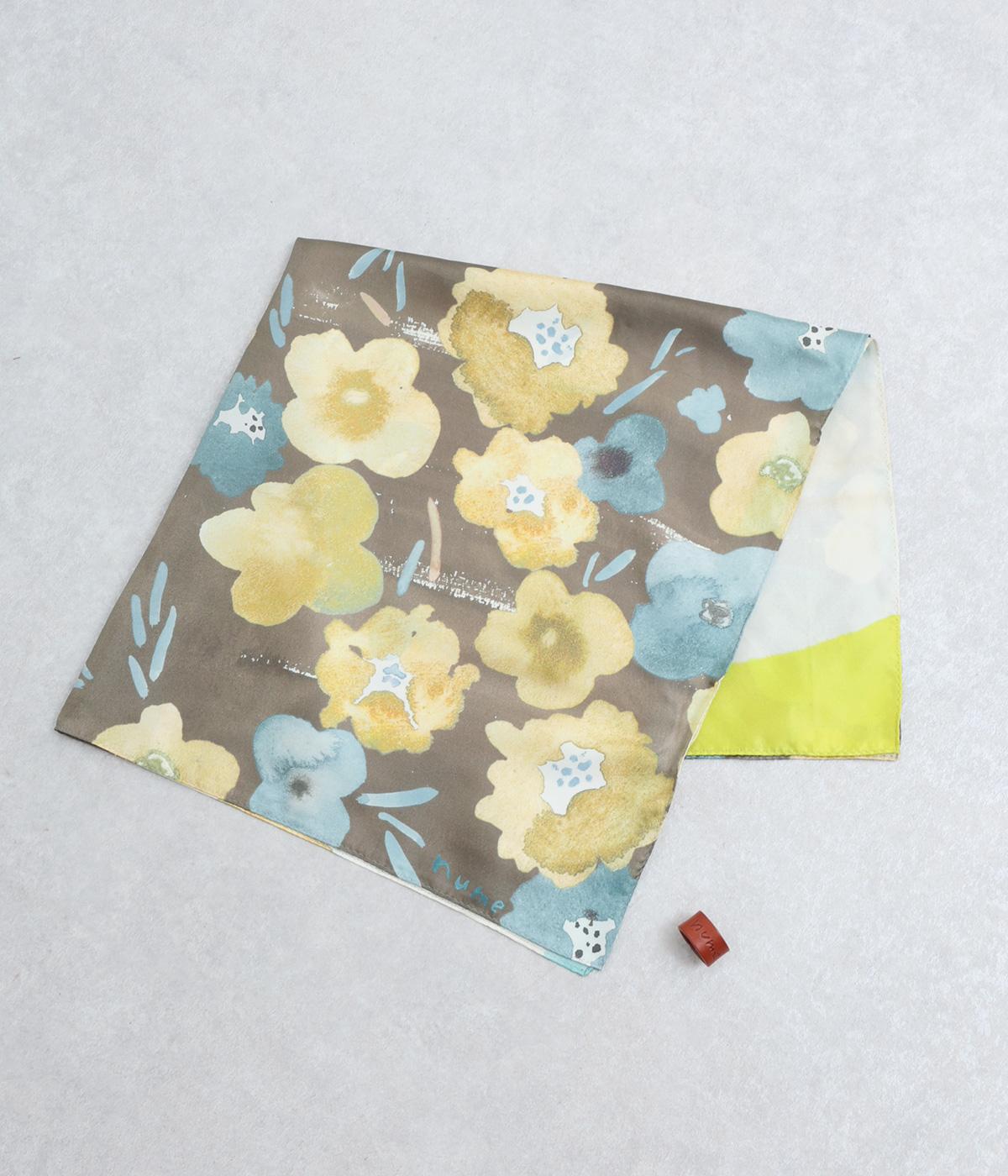 水彩画のようにやわらかなタッチで描かれたフラワー柄が印象的な、大判のスカーフです。にじむような色合いが、奥行きのある表情を生み出します。アクセントとなる差し色が入り、結び方や角度によって表情が変化。レザーリングつきなので、さっと通すだけでこなれたスタイルが完成します。