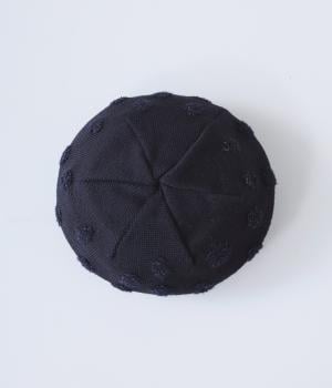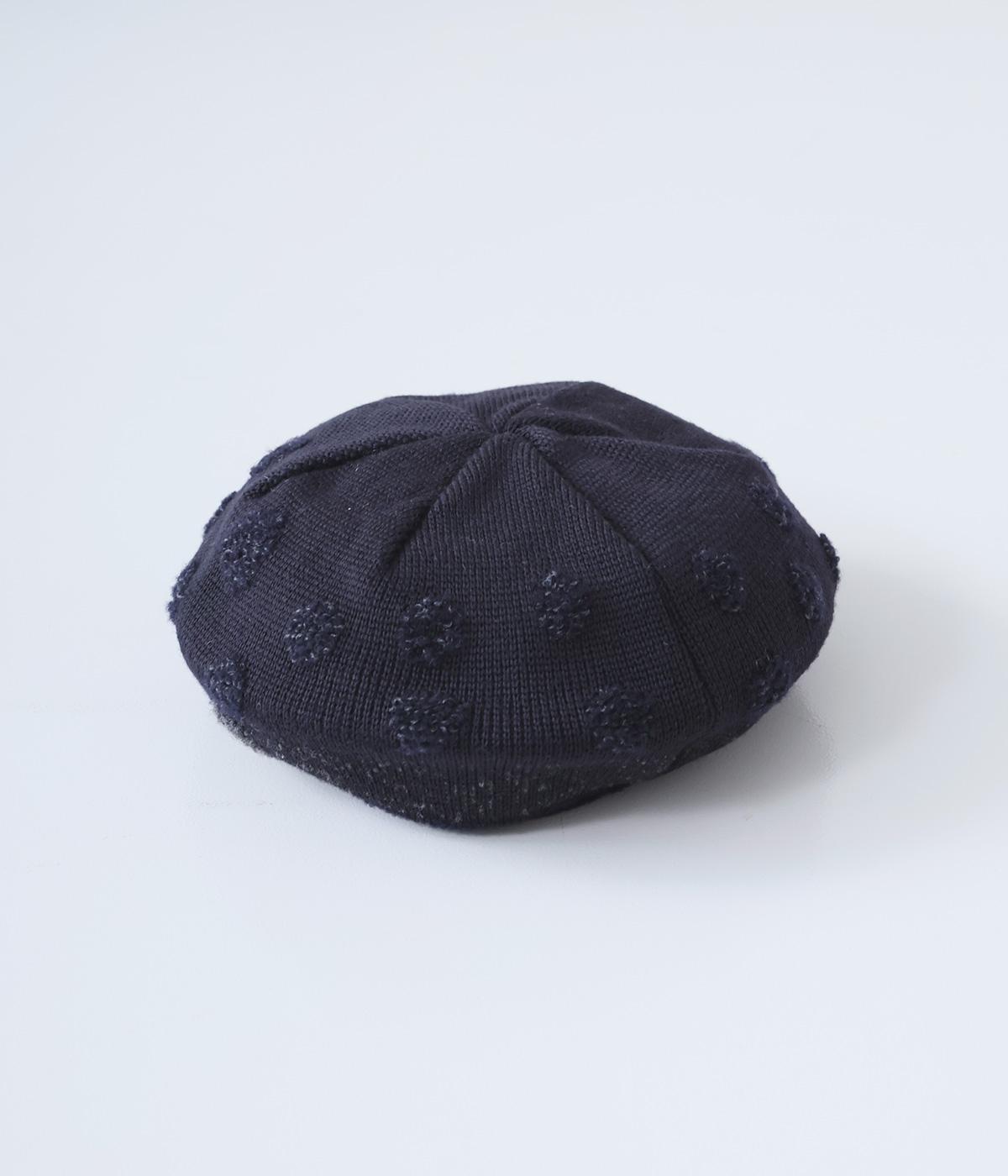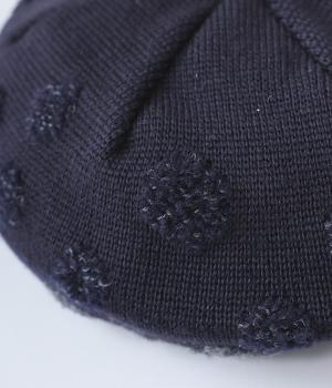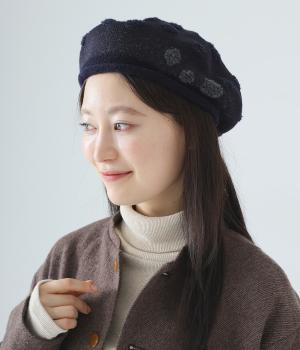 ベースカラーと同色のドット模様をあしらった、さりげない遊び心を感じさせるニットベレー。左脇には配色のドットをデザインしてアクセントにしました。ニット生地なので頭の形になじみやすく快適な着用感です。