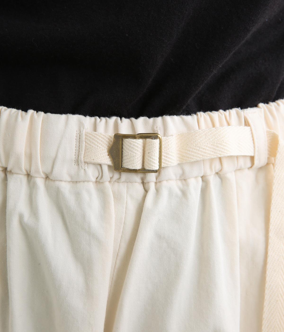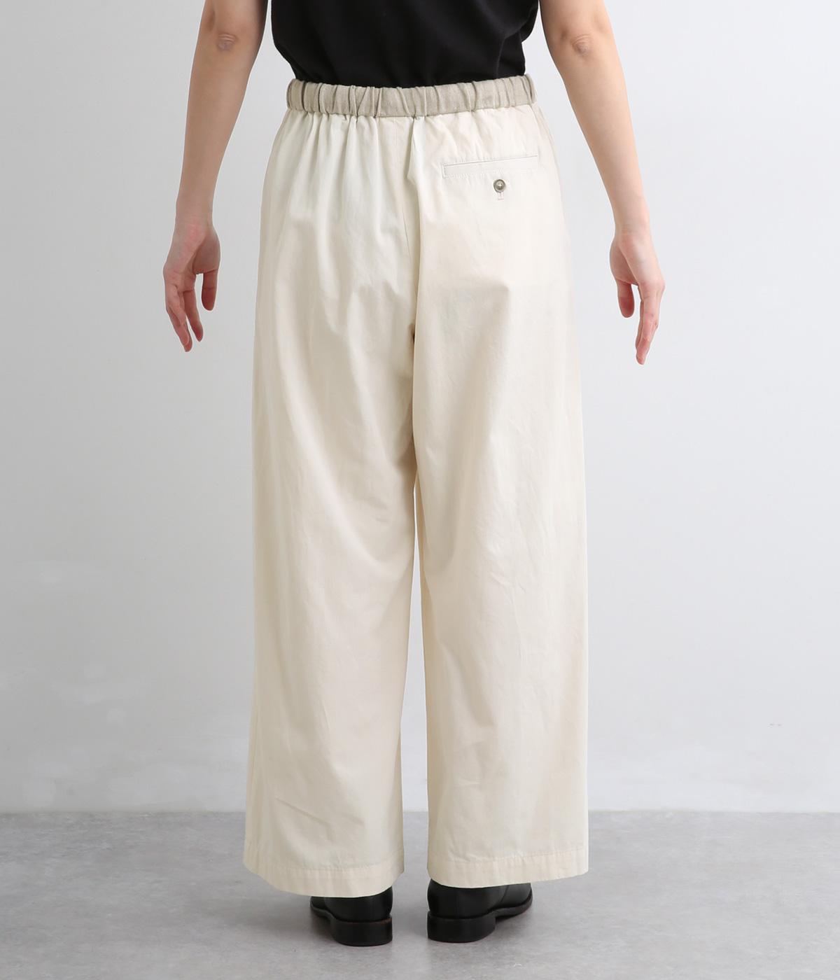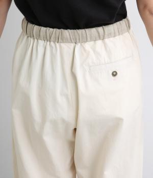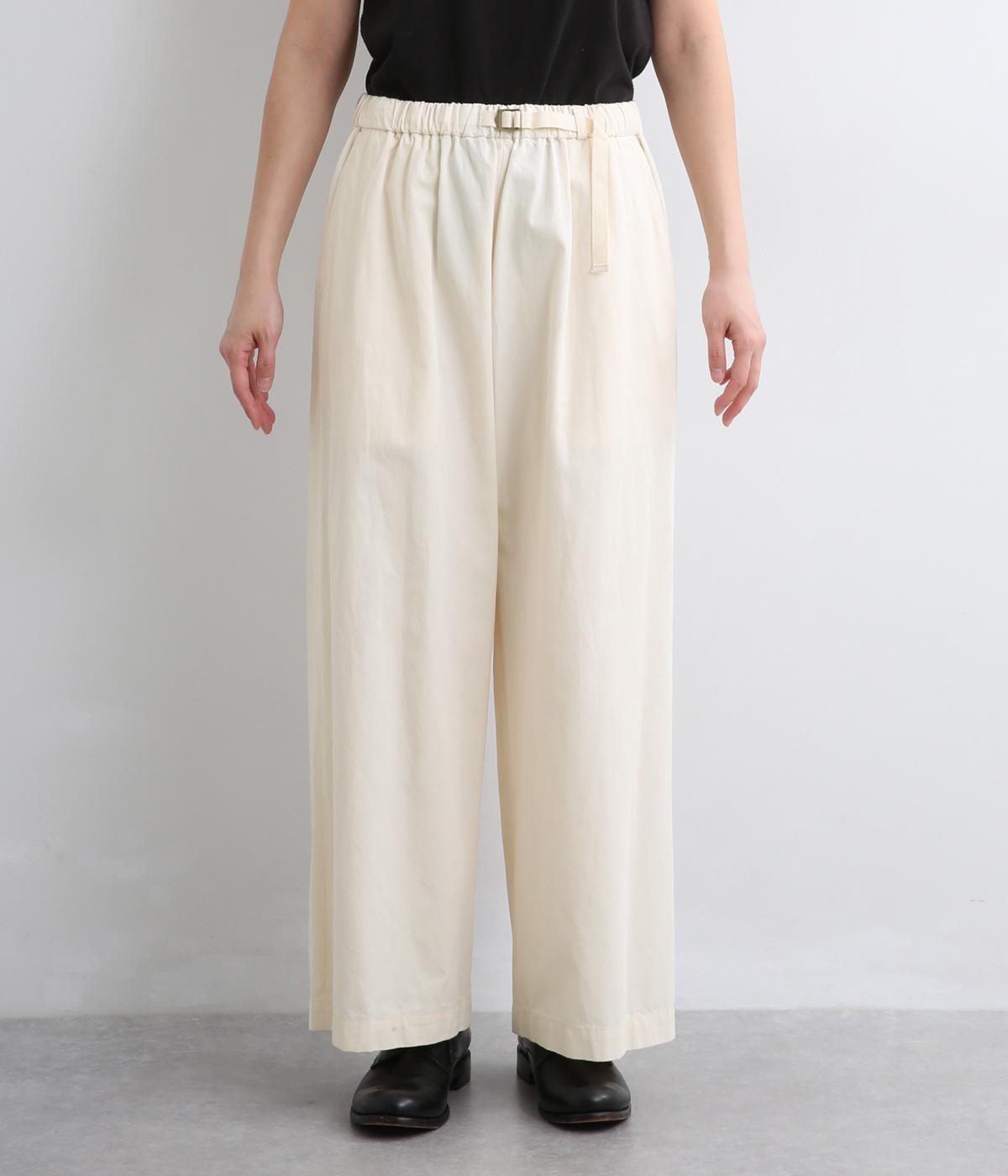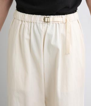 ゆとりを持たせたストレートシルエットで、体のラインを拾いにくく、すっきりとした印象に。ウエストにはテープベルトのようなアジャスターを配し、さりげないアクセントを添えています。ボタンつきのヒップポケットなど、ディテールにもこだわりました。幅広いコーディネートに合わせやすい一本です。