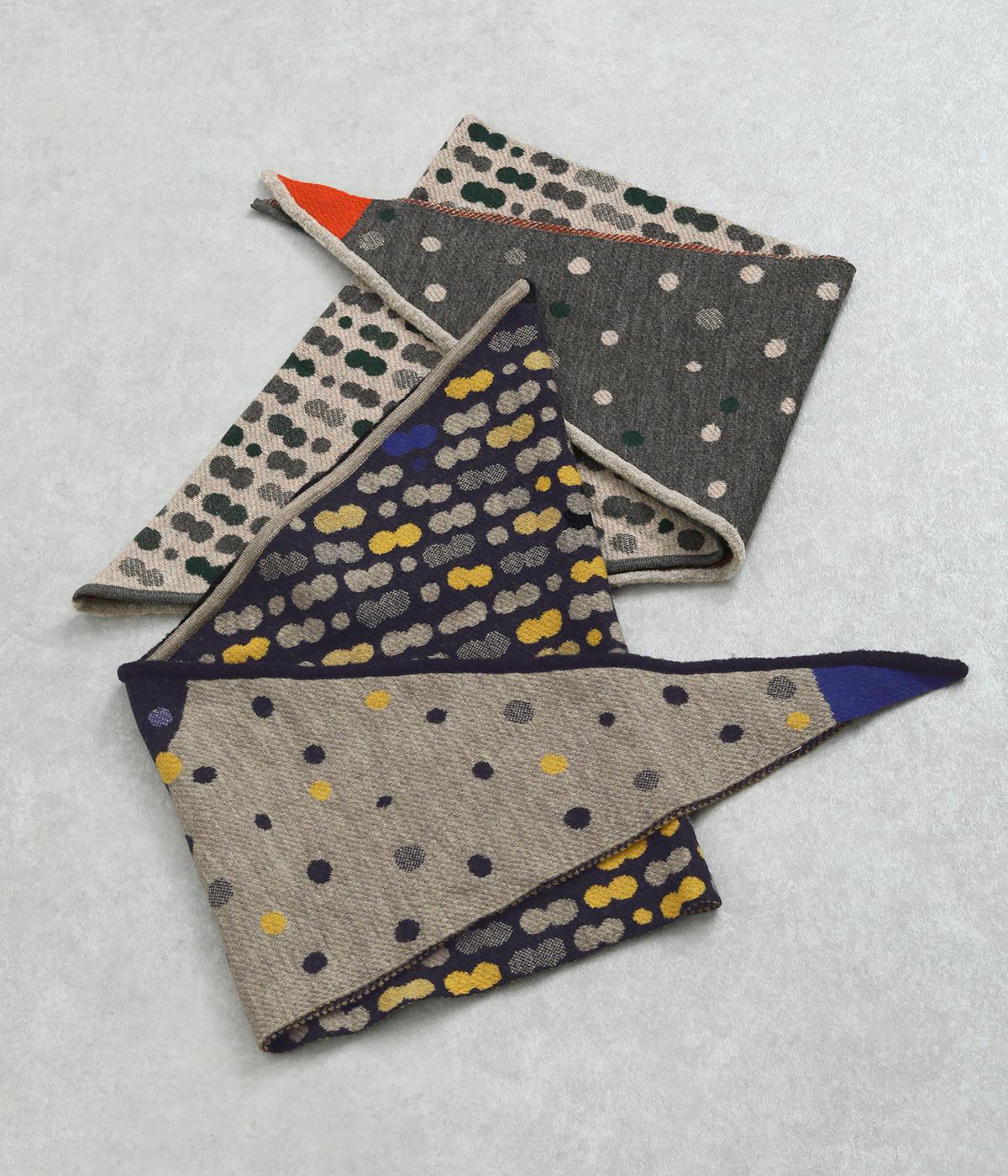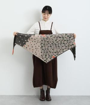 ピーナッツ柄とドットを組み合わせたユニークな一枚。ちょうどいいサイズ感の三角形で、首に巻いたり、肩にラフにかけたりとアレンジもききます。あたたみがありながらも毛足はあまり長くないので、季節の変わり目にも活躍するアイテムです。