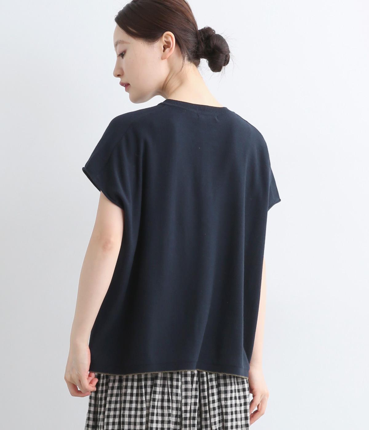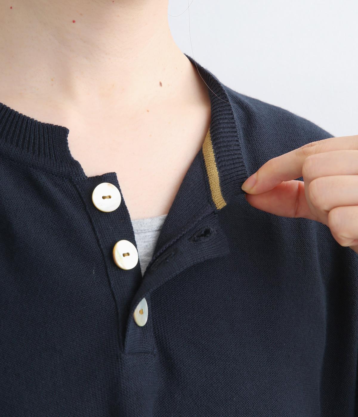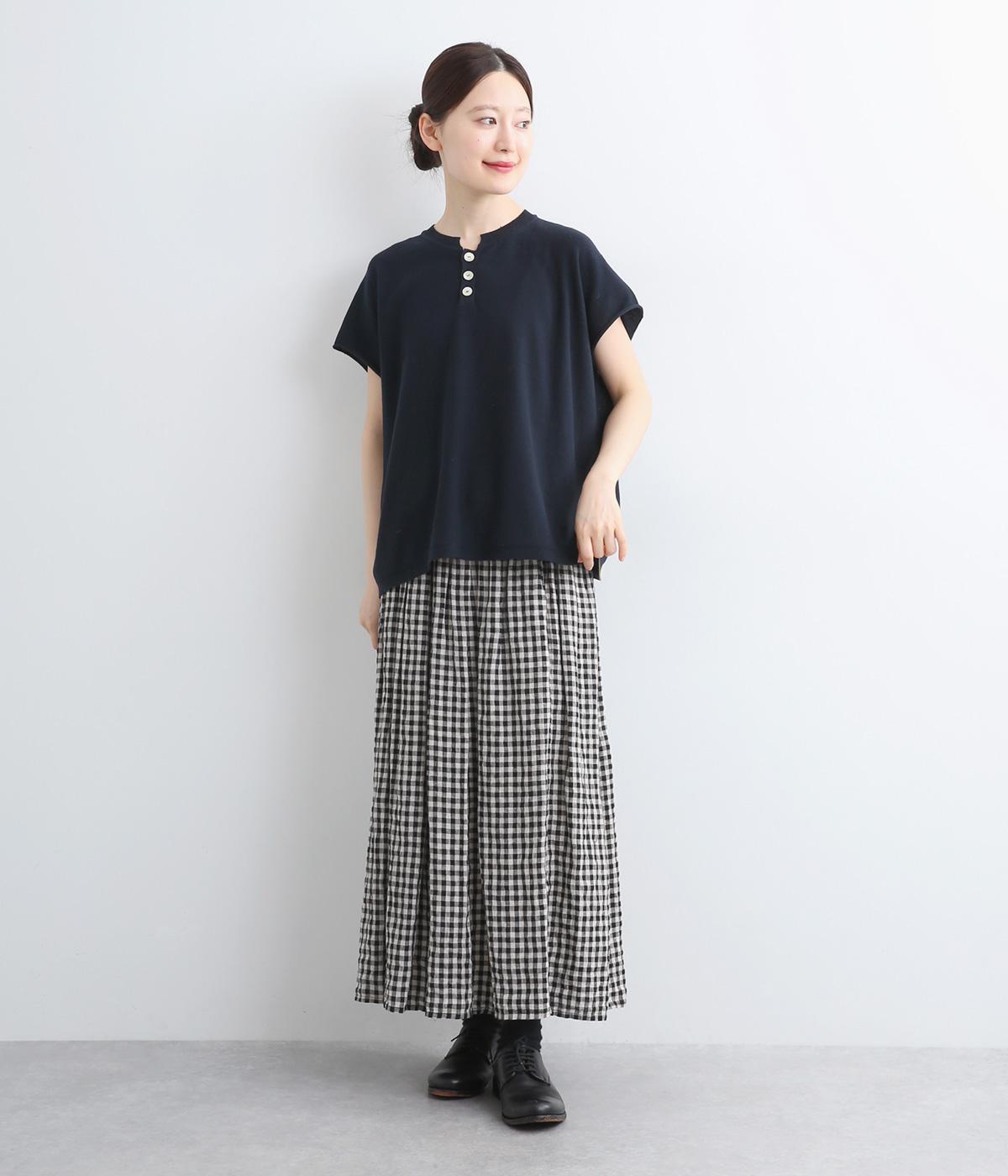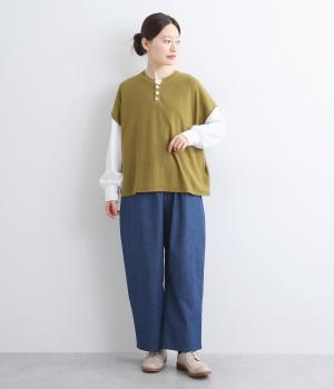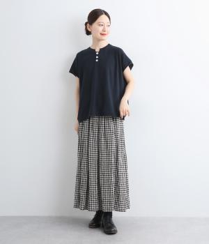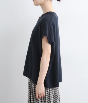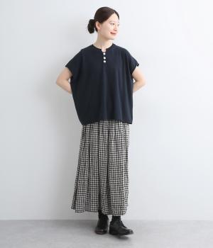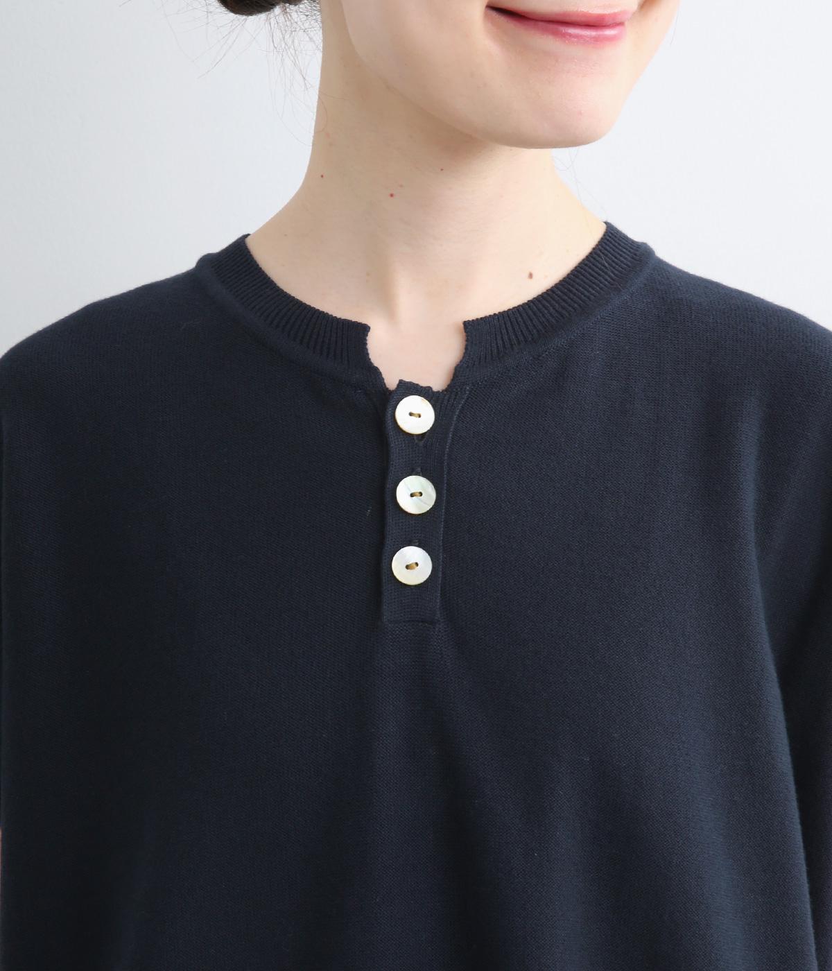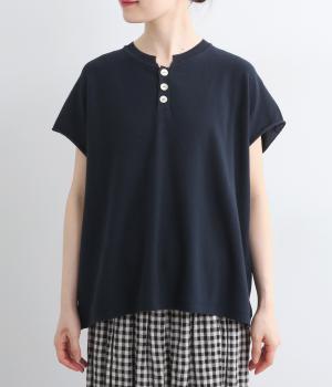 フレンチ袖のポロシャツ風プルオーバーです。胸元には大きめの貝ボタンが3つ並んでいて、品のよさが際立ちます。襟の小さなスタンドカラーが、顔まわりをすっきりと見せてくれるポイントに。