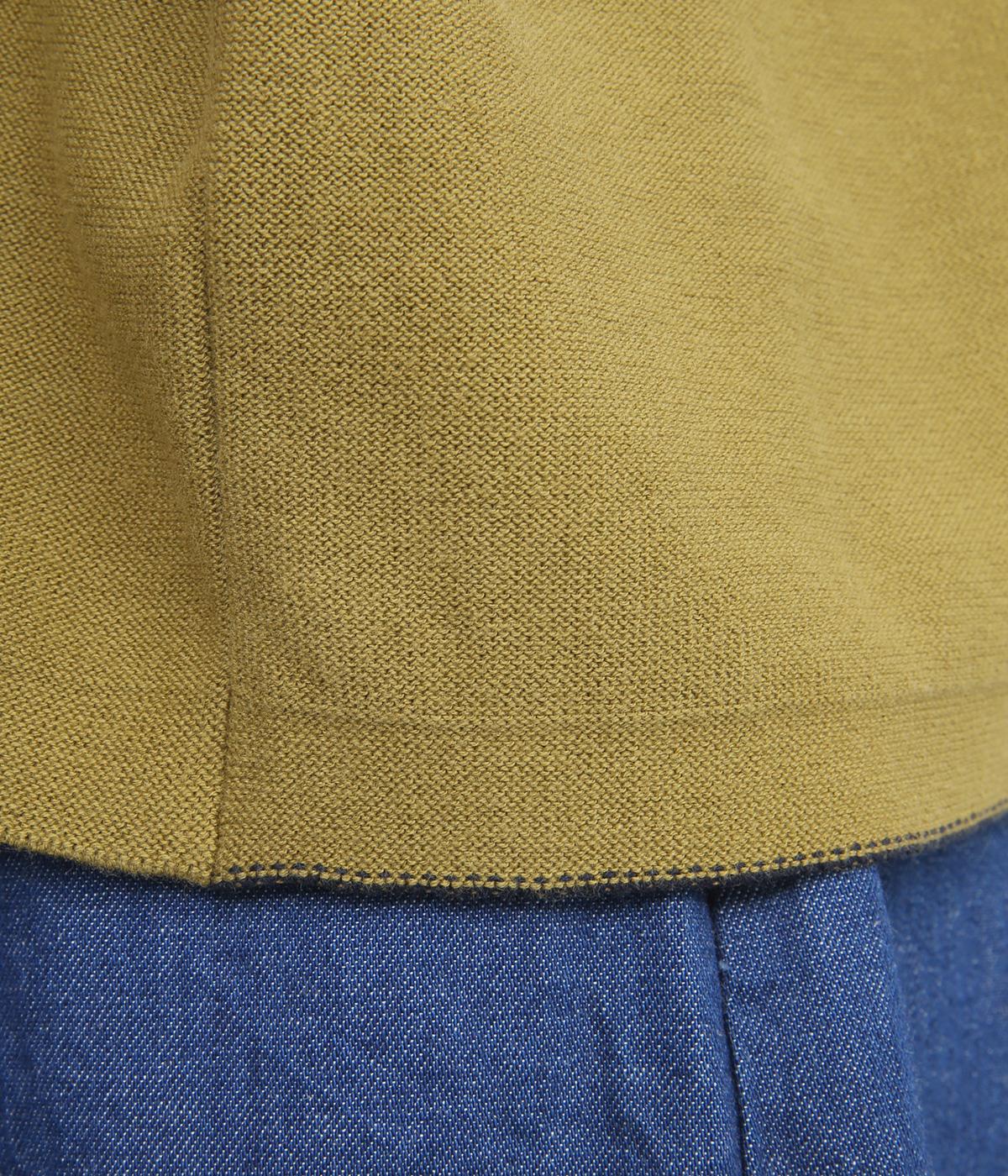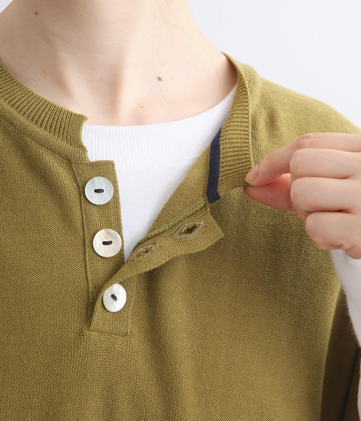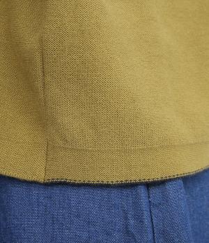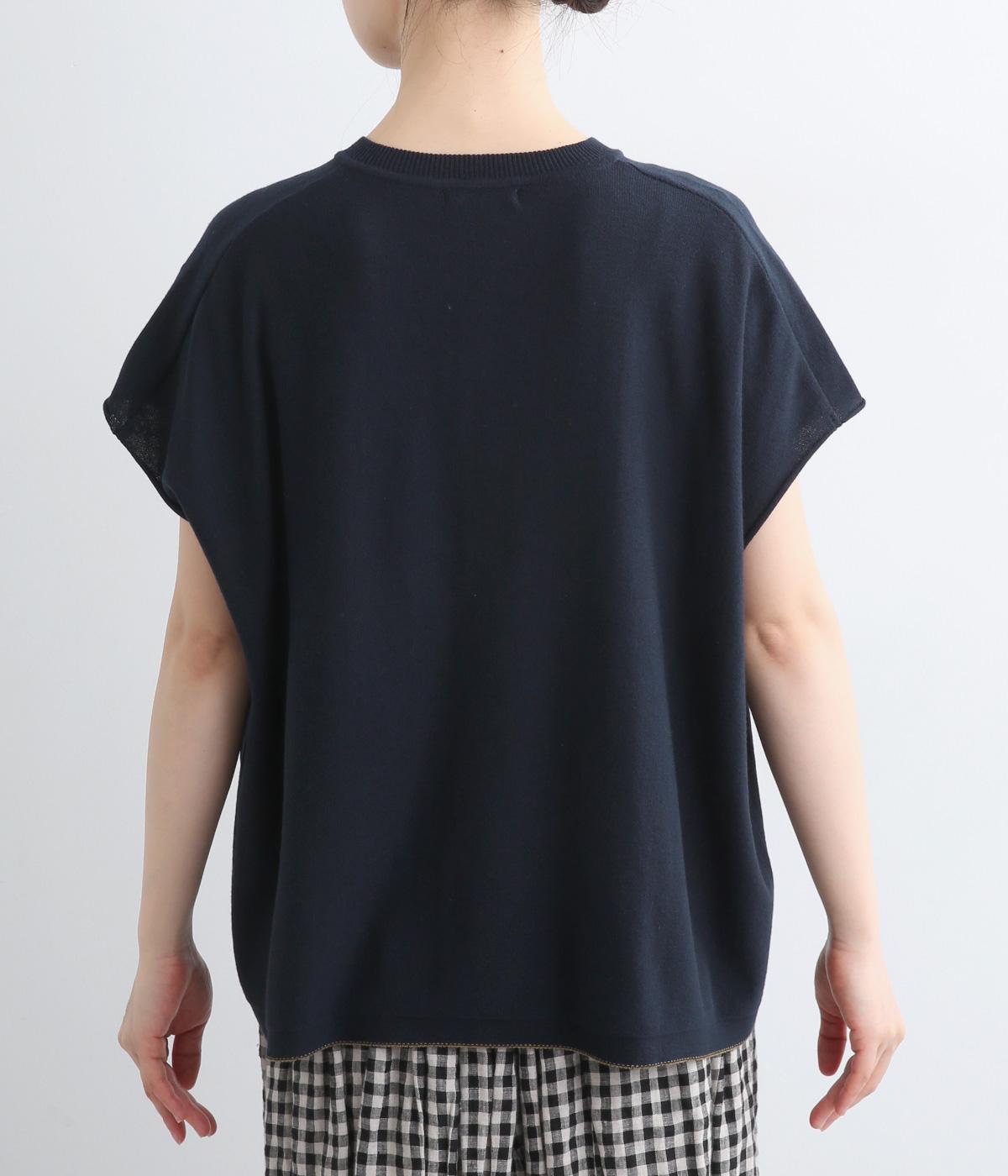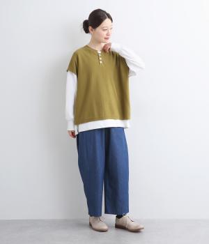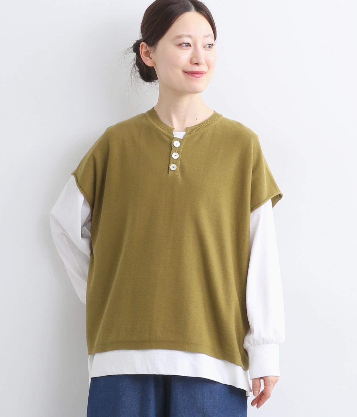 フレンチ袖のポロシャツ風プルオーバーです。胸元には大きめの貝ボタンが3つ並んでいて、品のよさが際立ちます。襟の小さなスタンドカラーが、顔まわりをすっきりと見せてくれるポイントに。
