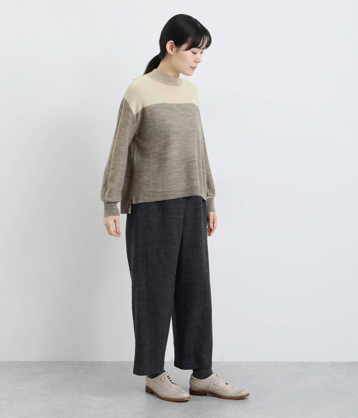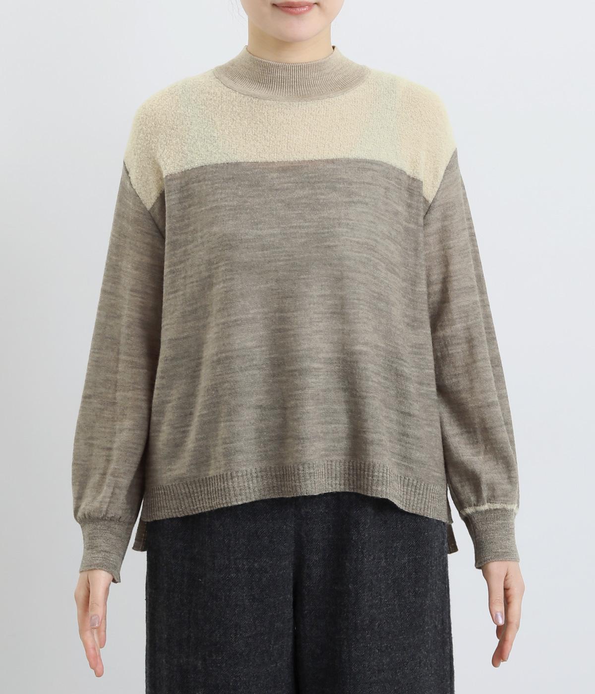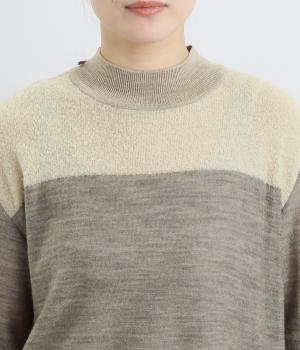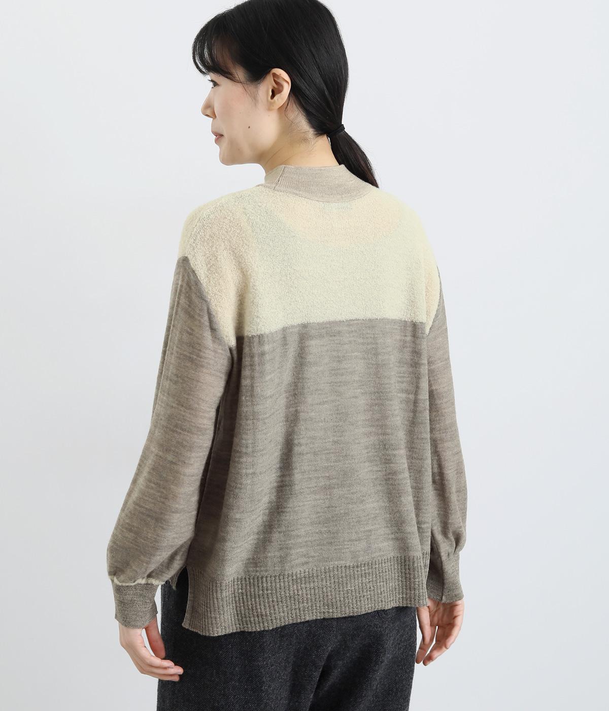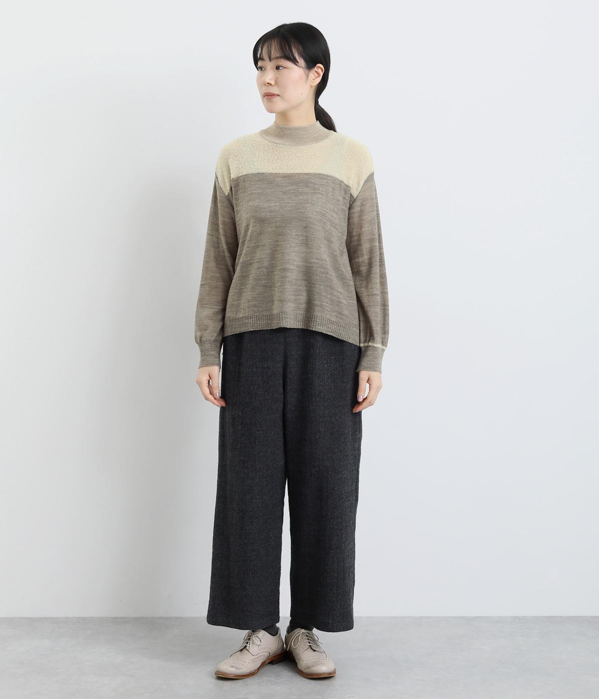 異素材と配色でシンプルながらもアクセントをきかせた一枚。身頃はフィット感をおさえて着心地よく、モックネックや袖口のリブですっきりとまとめました。着丈はすこし前後差をつけてスリットを入れているので、ラフなトップスアウトもさまになります。