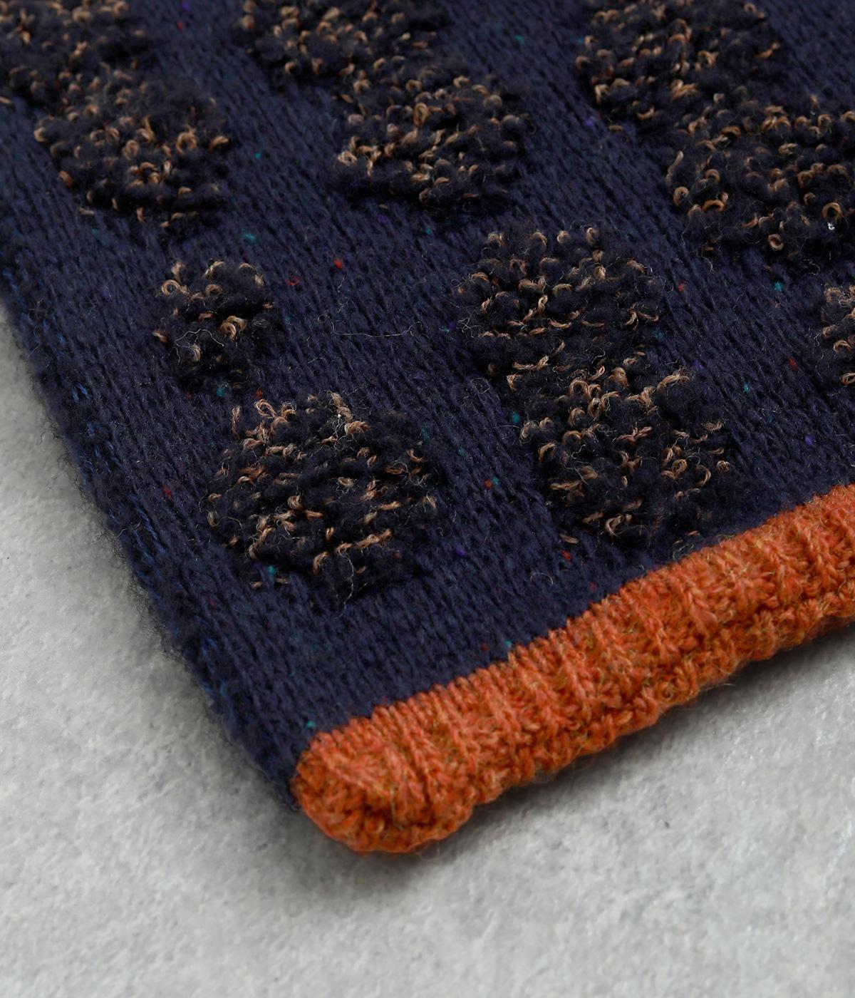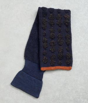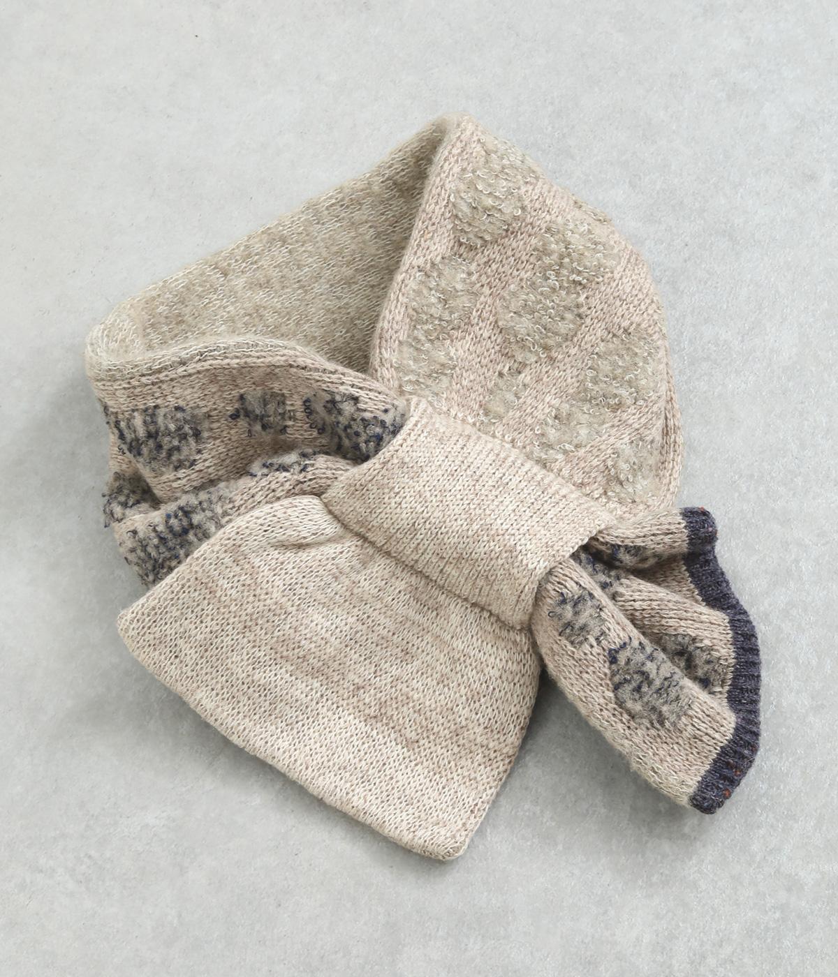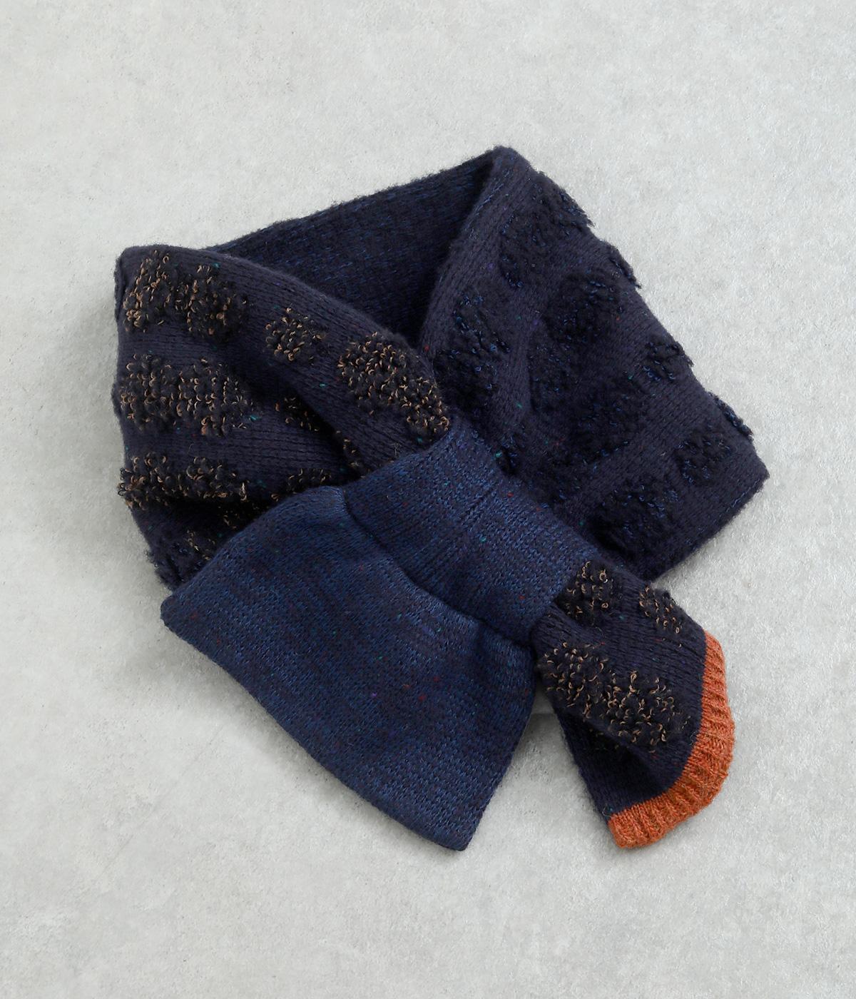 リブ編み部分のホールにさし込む便利な長方形ストール。首元をあたため、適度にボリューム感をプラス。ほどけて落ちてしまう心配もなく、デザイン性も利便性も◎。ブークレーのさり気ないピーナッツ柄や配色ラインのポイントもきいています。