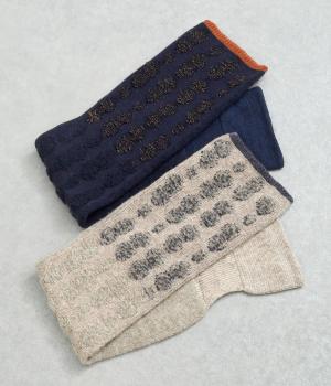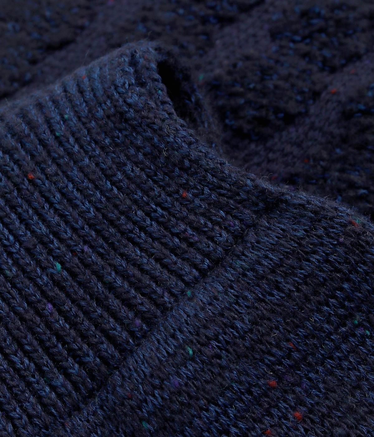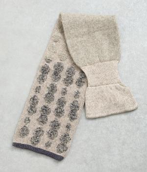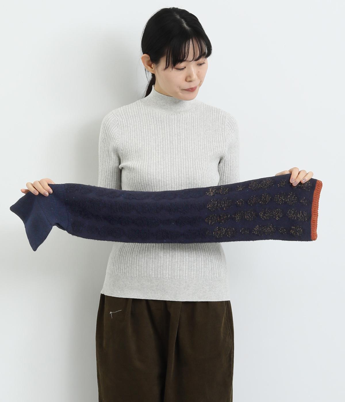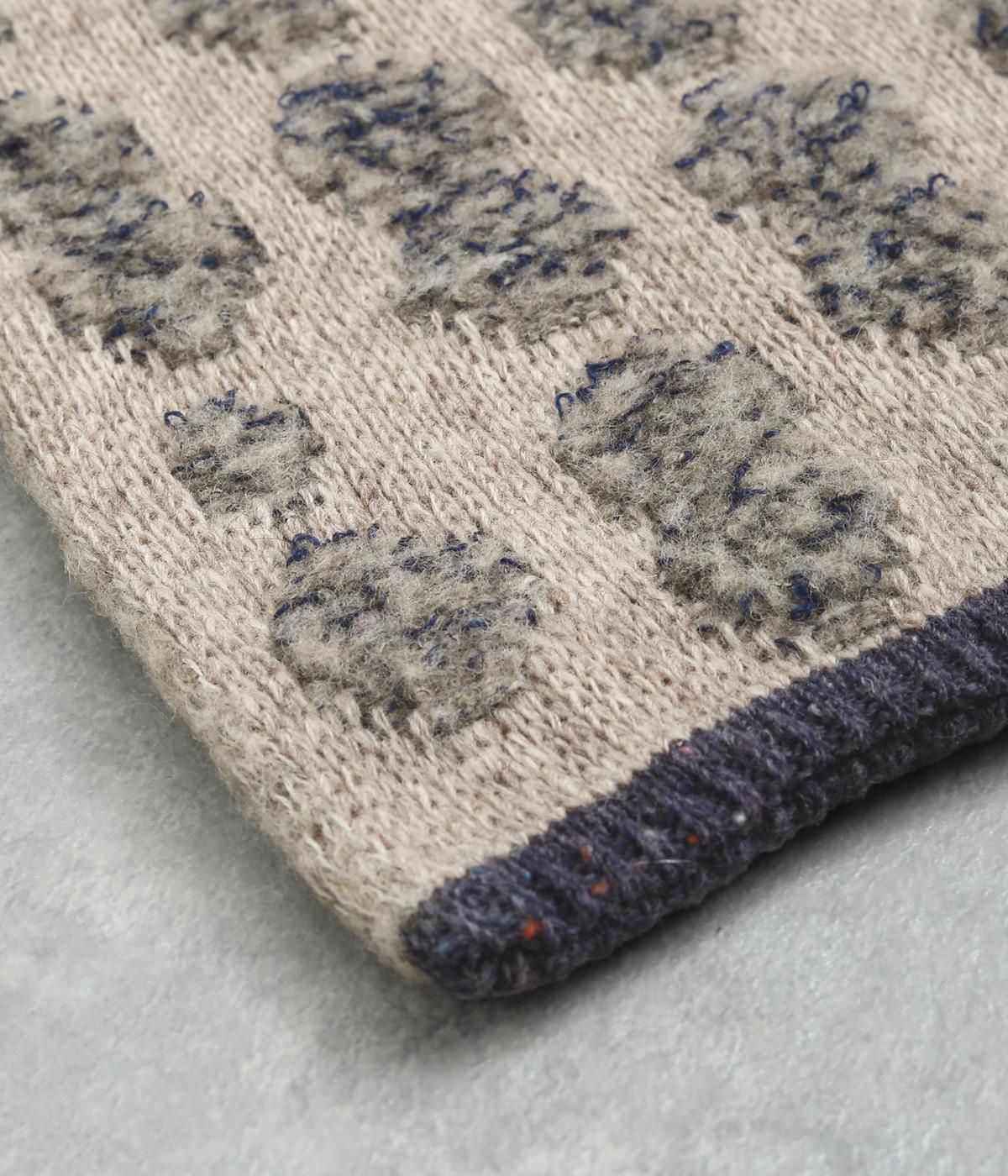 リブ編み部分のホールにさし込む便利な長方形ストール。首元をあたため、適度にボリューム感をプラス。ほどけて落ちてしまう心配もなく、デザイン性も利便性も◎。ブークレーのさり気ないピーナッツ柄や配色ラインのポイントもきいています。