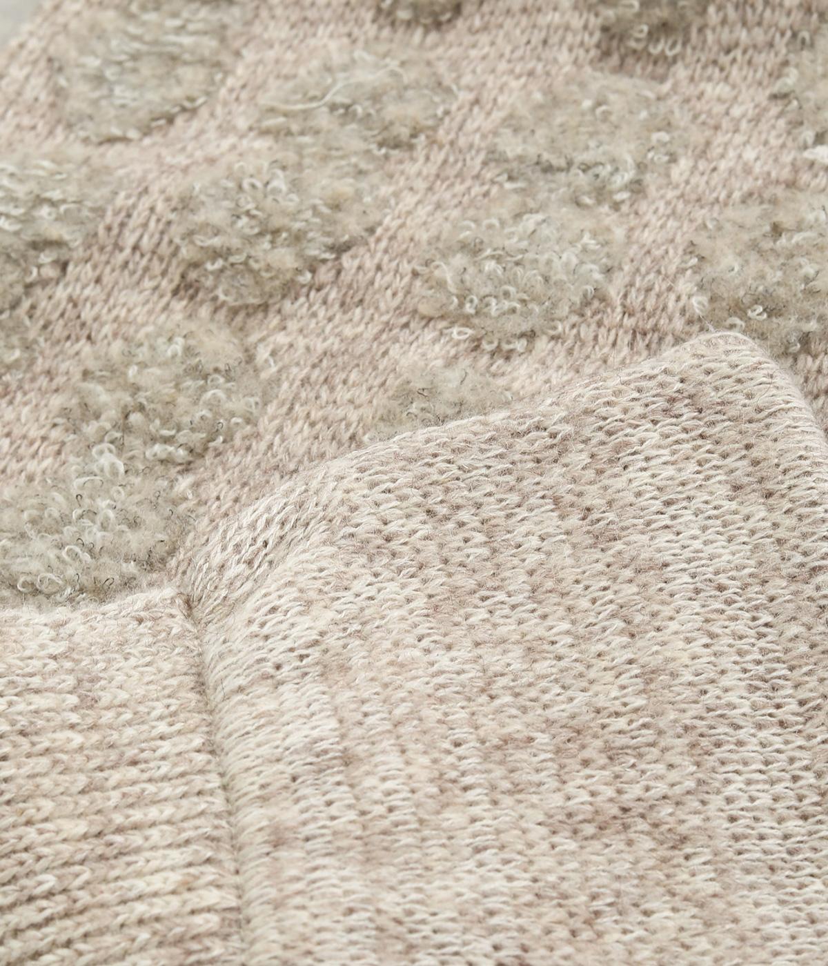 ウールとナイロンをミックスさせて、あたたかみをしっかり出しながらも適度に軽く仕上げました。ぽこぽことした表面感が特徴的なブークレーでメリハリをつけています。