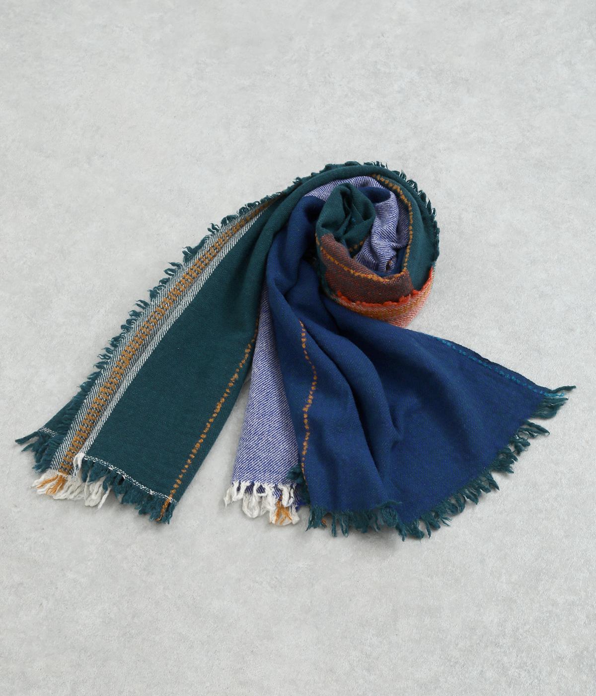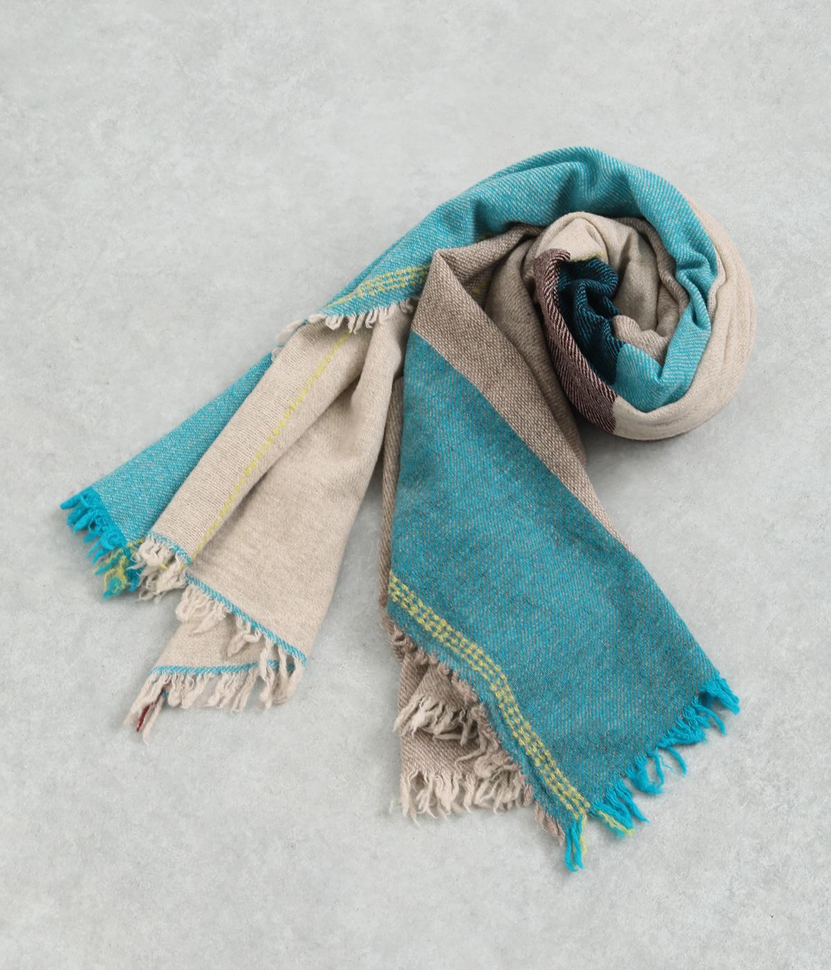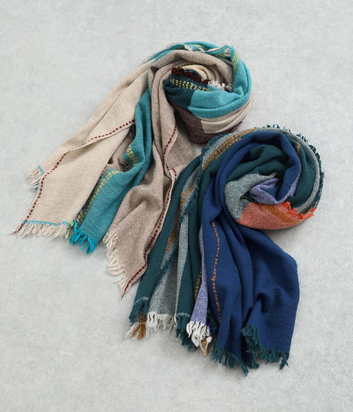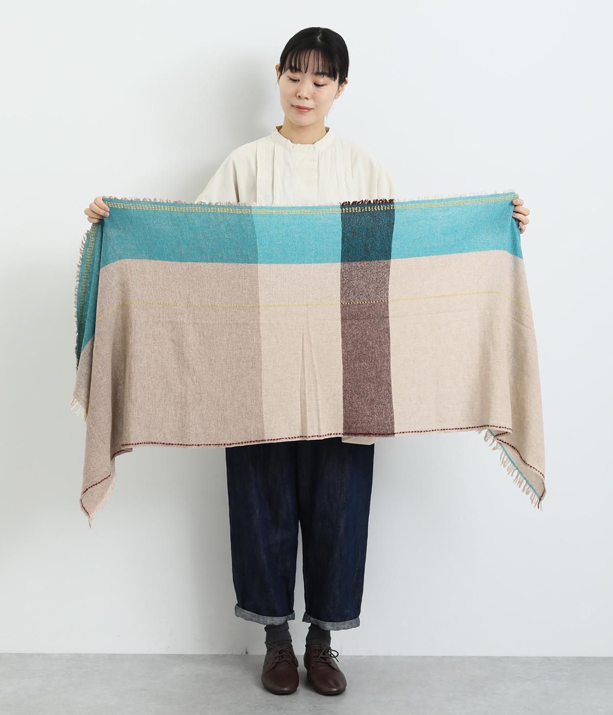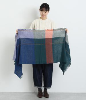 印象的な配色のチェック柄や細かなフリンジ、ステッチなどディテールにこだわったストールです。大判の長方形で使い勝手も良く、さっと肩にかけるだけでもスタイリングのポイントになります。巻き方によって色の出方も変わり、印象もチェンジ。