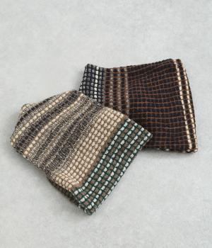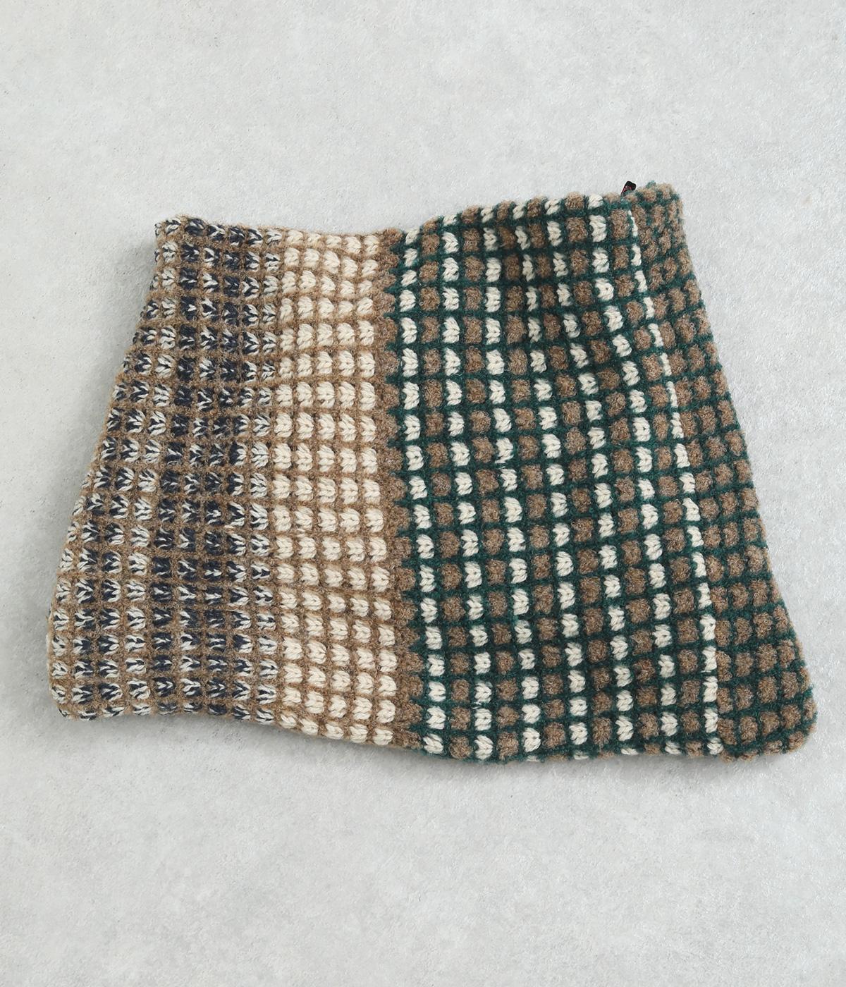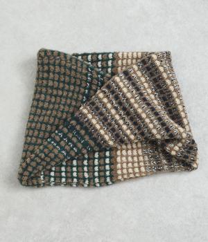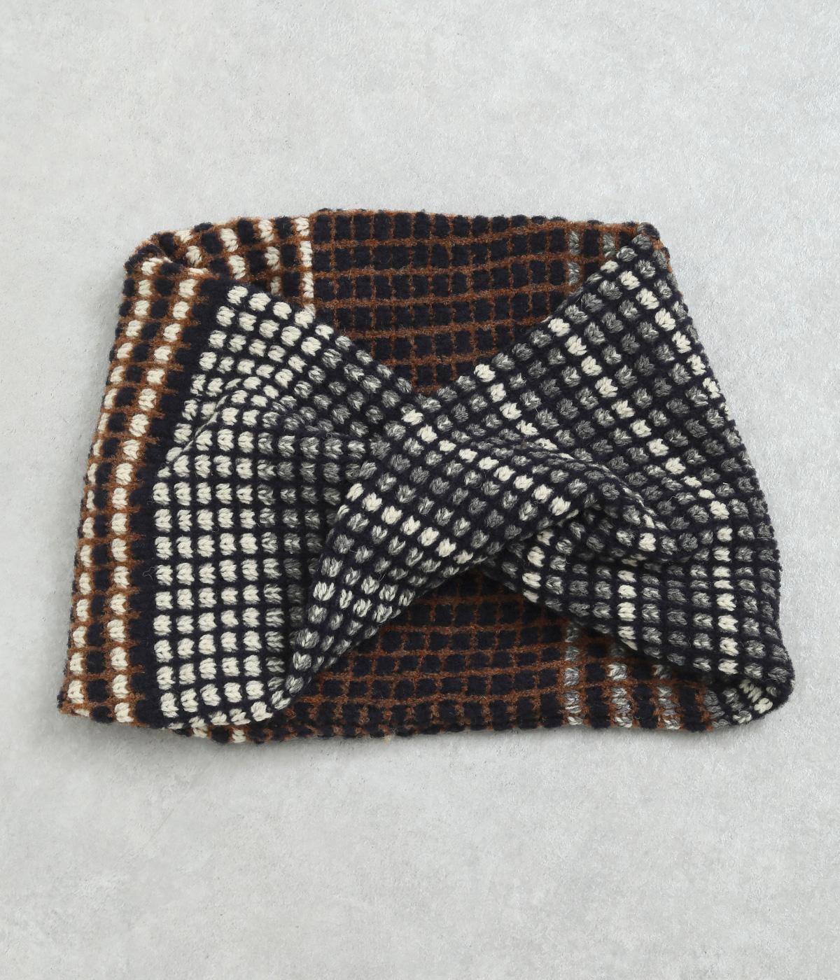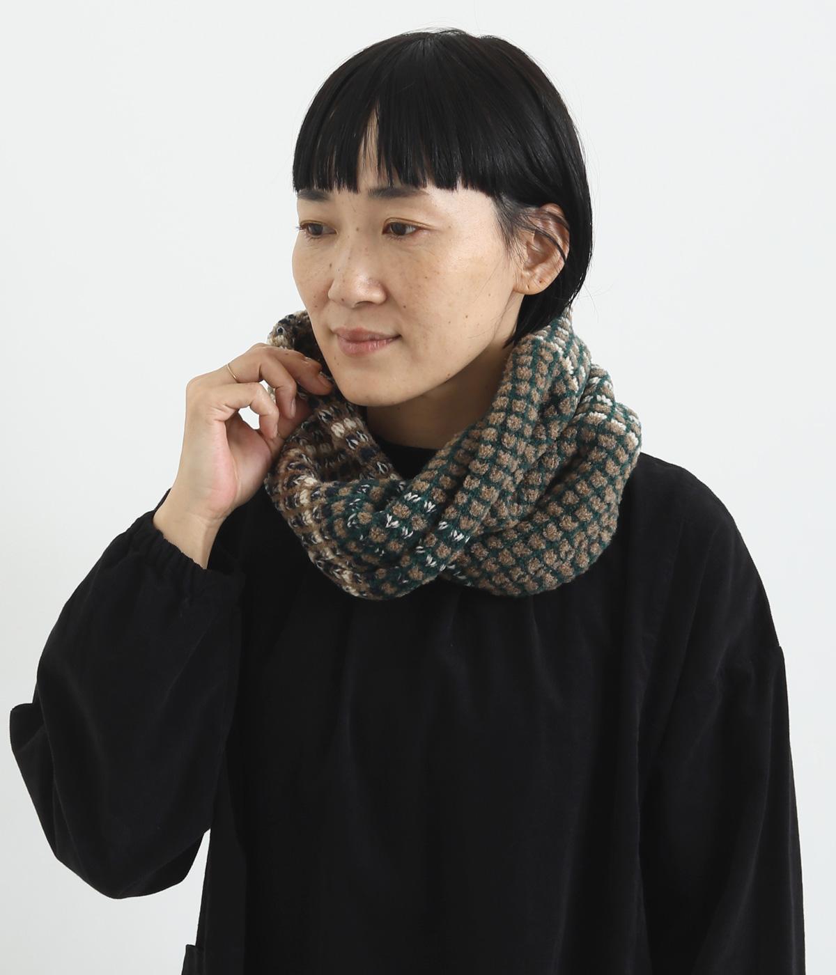 すっぽり被るだけで顔まわりにニュアンスをつけてくれる、ねじりタイプのニットスヌード。ほどよいボリューム感と絶妙な配色のチェック柄でスタイリングのポイントにもなります。首にフィットしすぎない適度な抜け感も好ポイント。