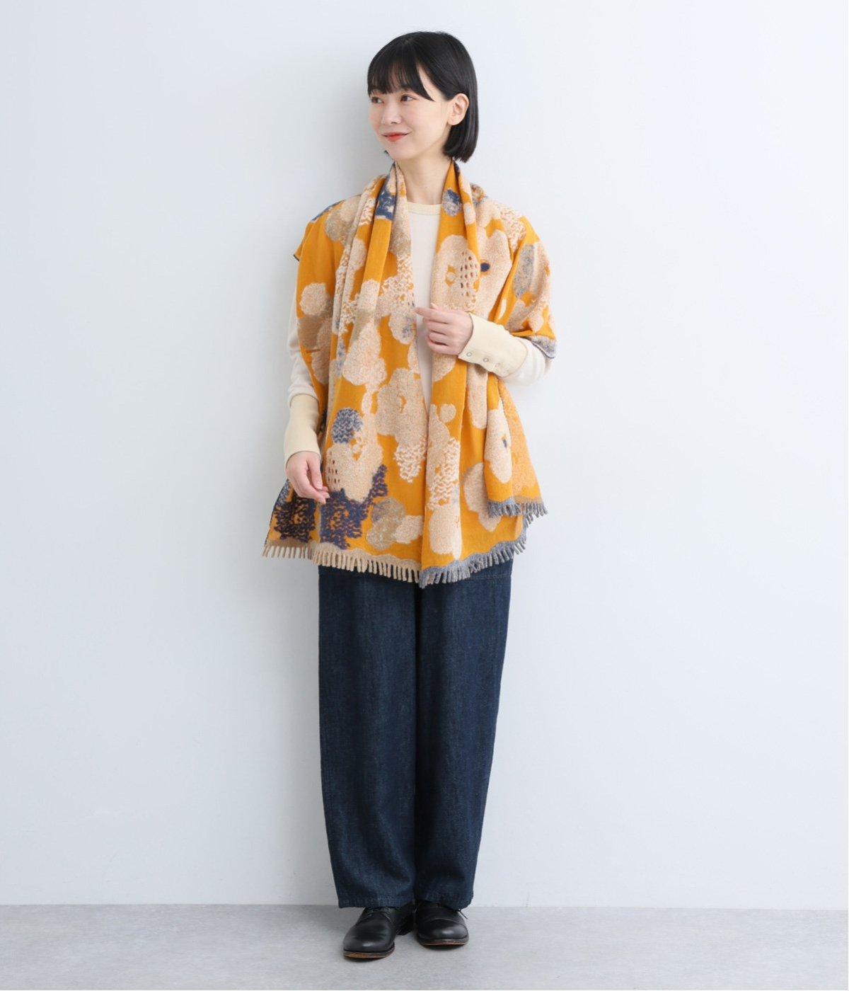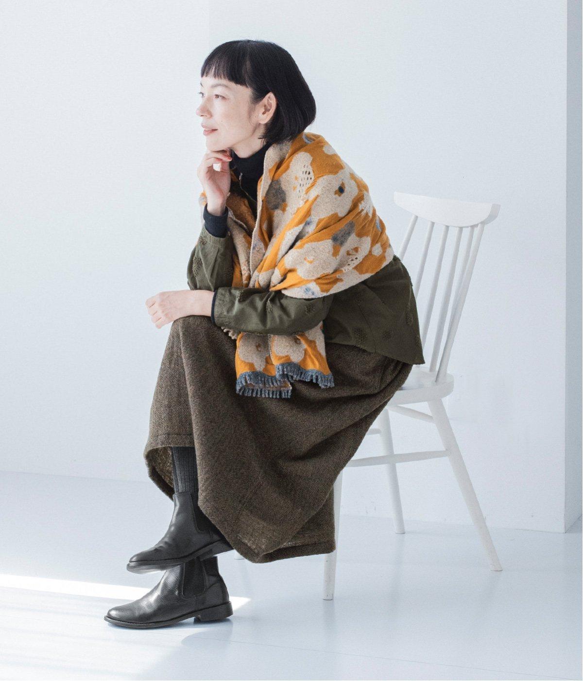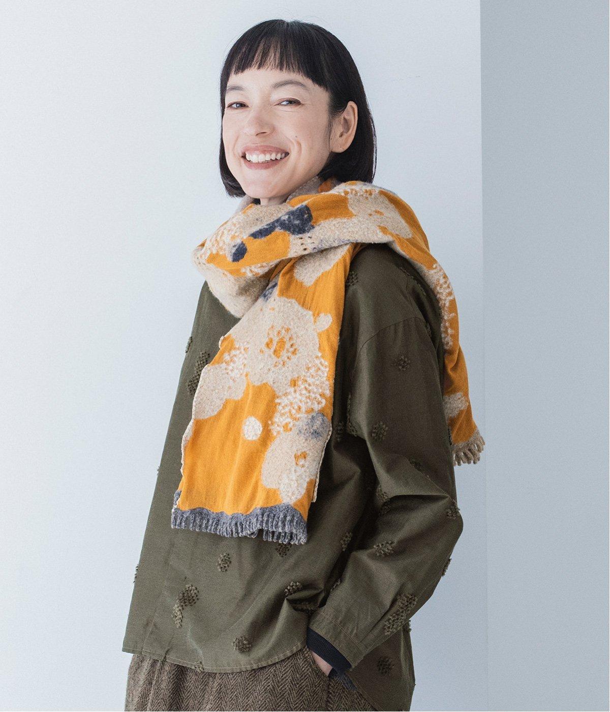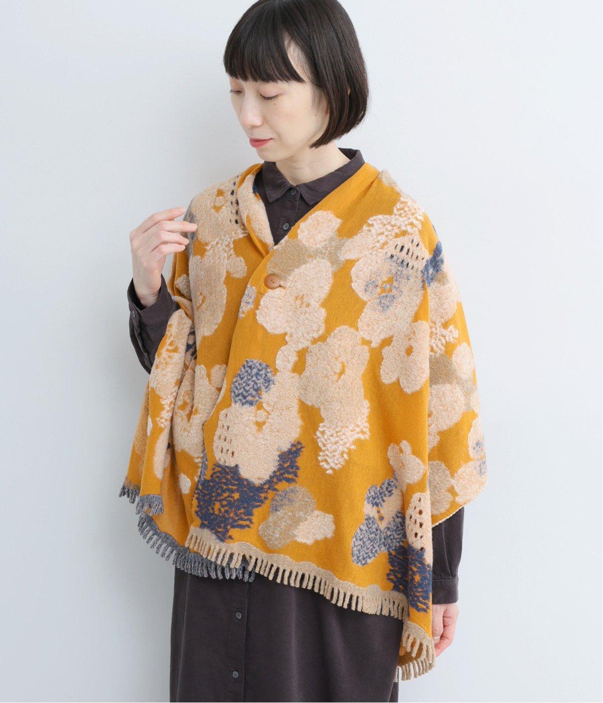 大判サイズながらも首元にすっきりと巻くことができる長方形ストール。肩にかけたときに前でボタンで留めできる仕様なので防寒対策しながらコーディネートを楽しめます。