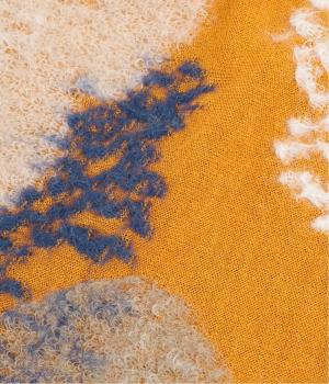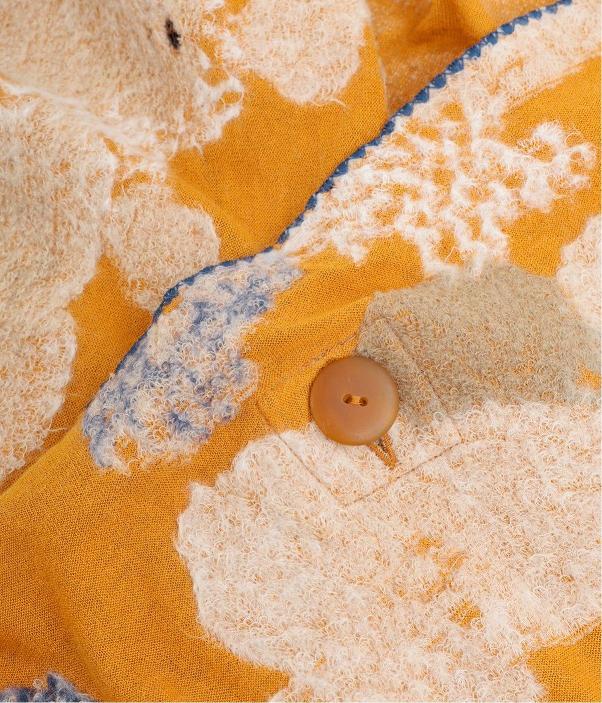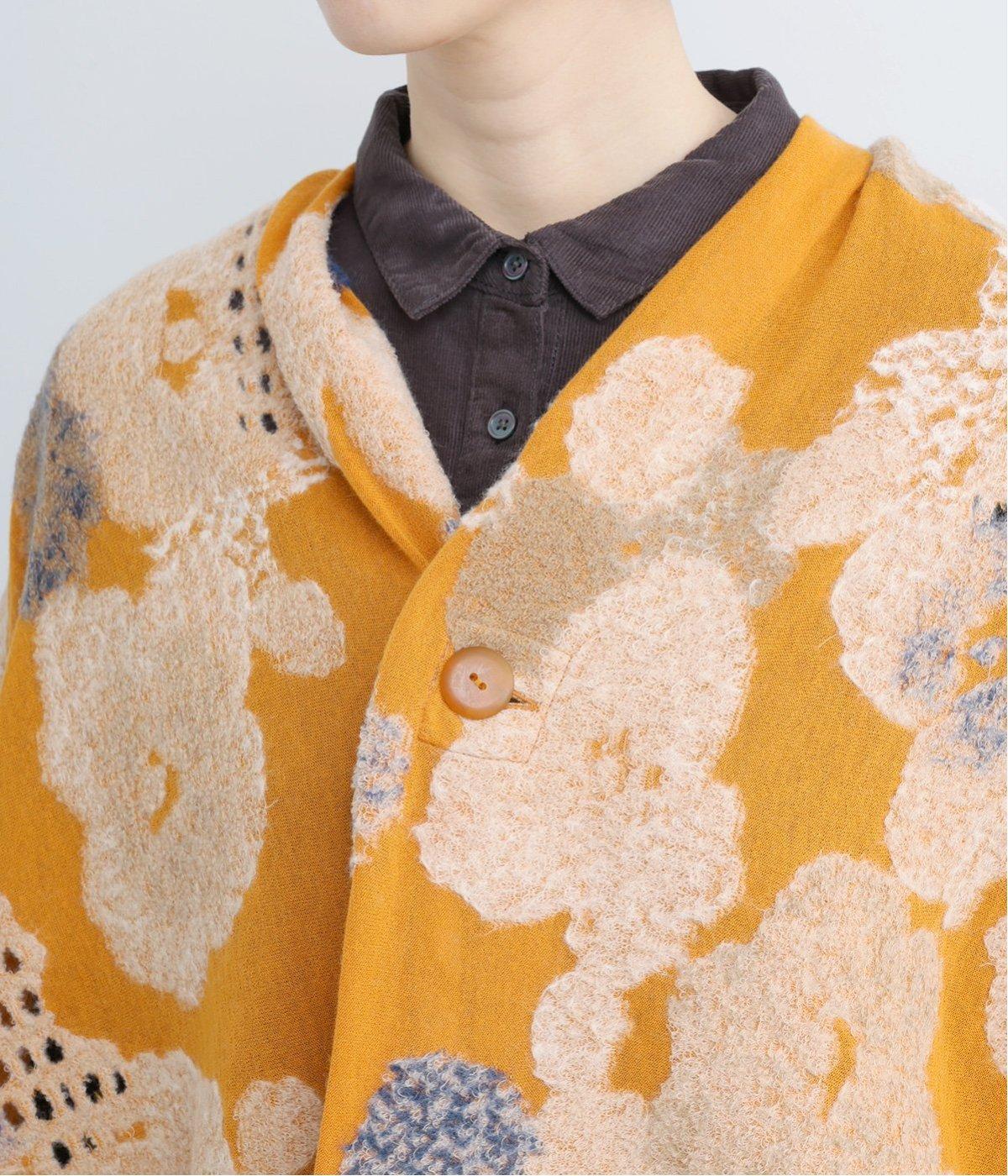 透け感のあるさらりとした手ざわりのコットンウール生地に、ふっくらやわらかな花柄を編み込んだジャカードニットです。