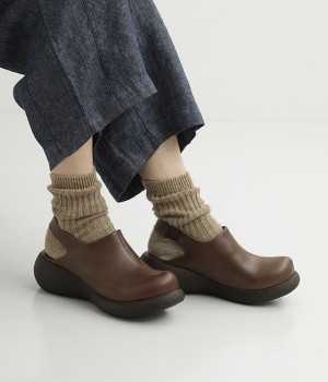 ころんとかわいらしい丸みのあるソールが特徴的なサボです。木型は日本で作成して、日本人の足にぴったりな履き心地に仕上げています。見た目より軽いウレタンソールや、柔らかなインソール、アウトソールに滑り止めラバーが付いているので歩きやすく安心です。甲部分はゴム付きのバックバンド仕様にして、足にフィットするように仕立てました。