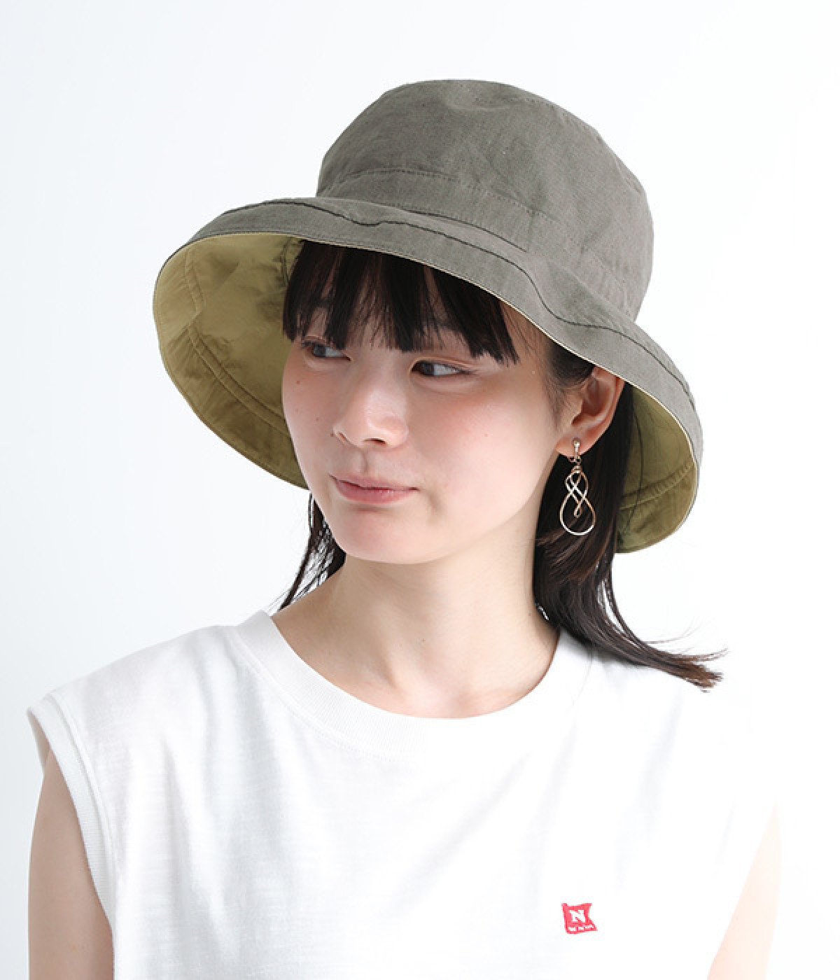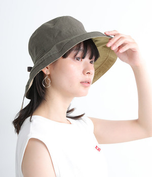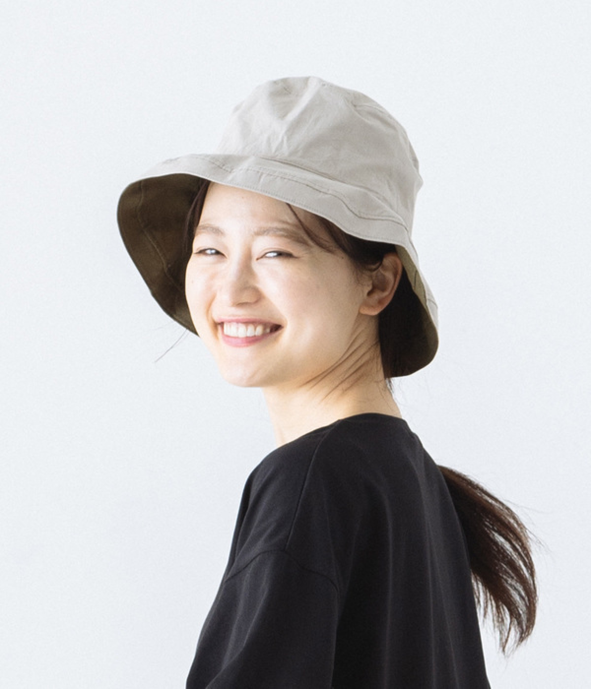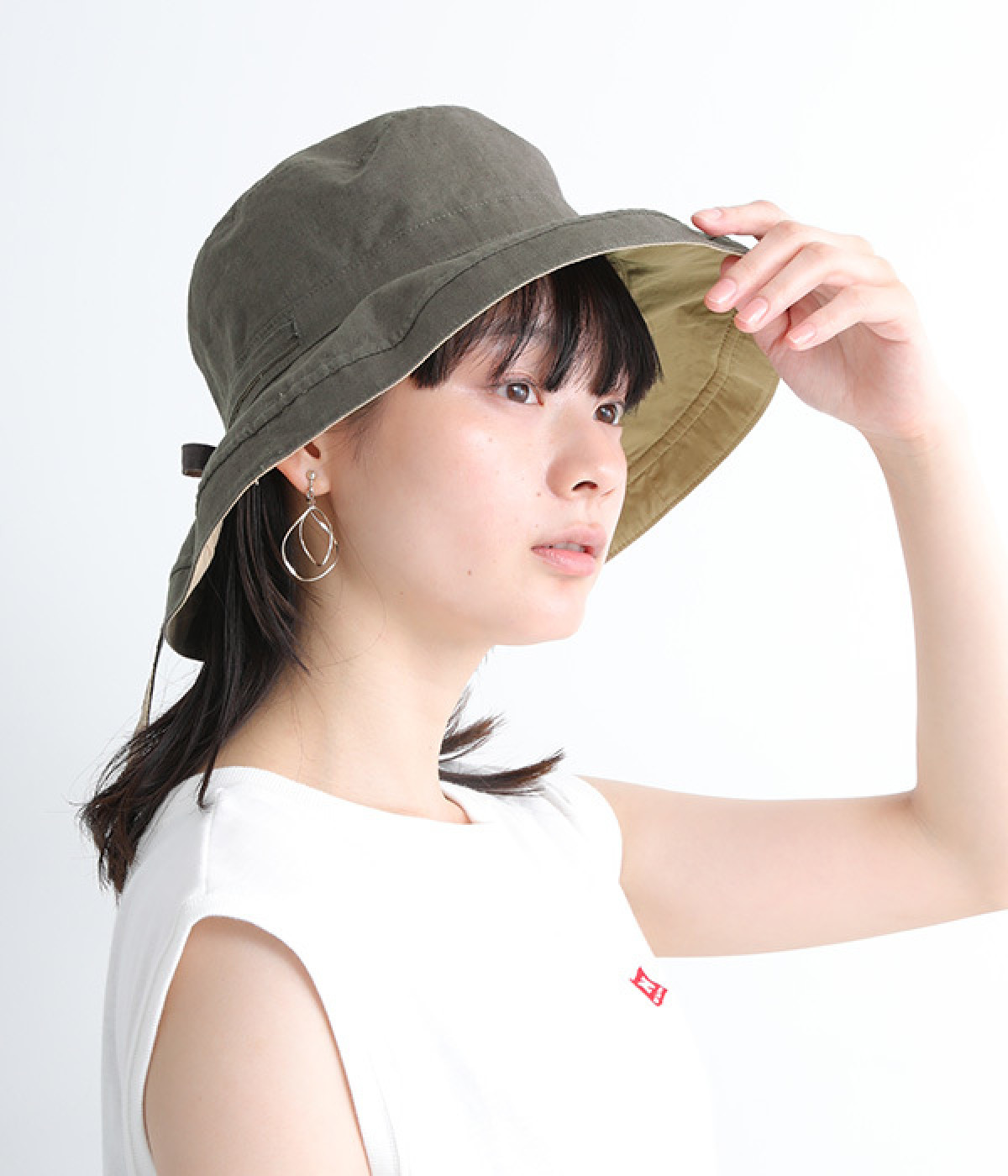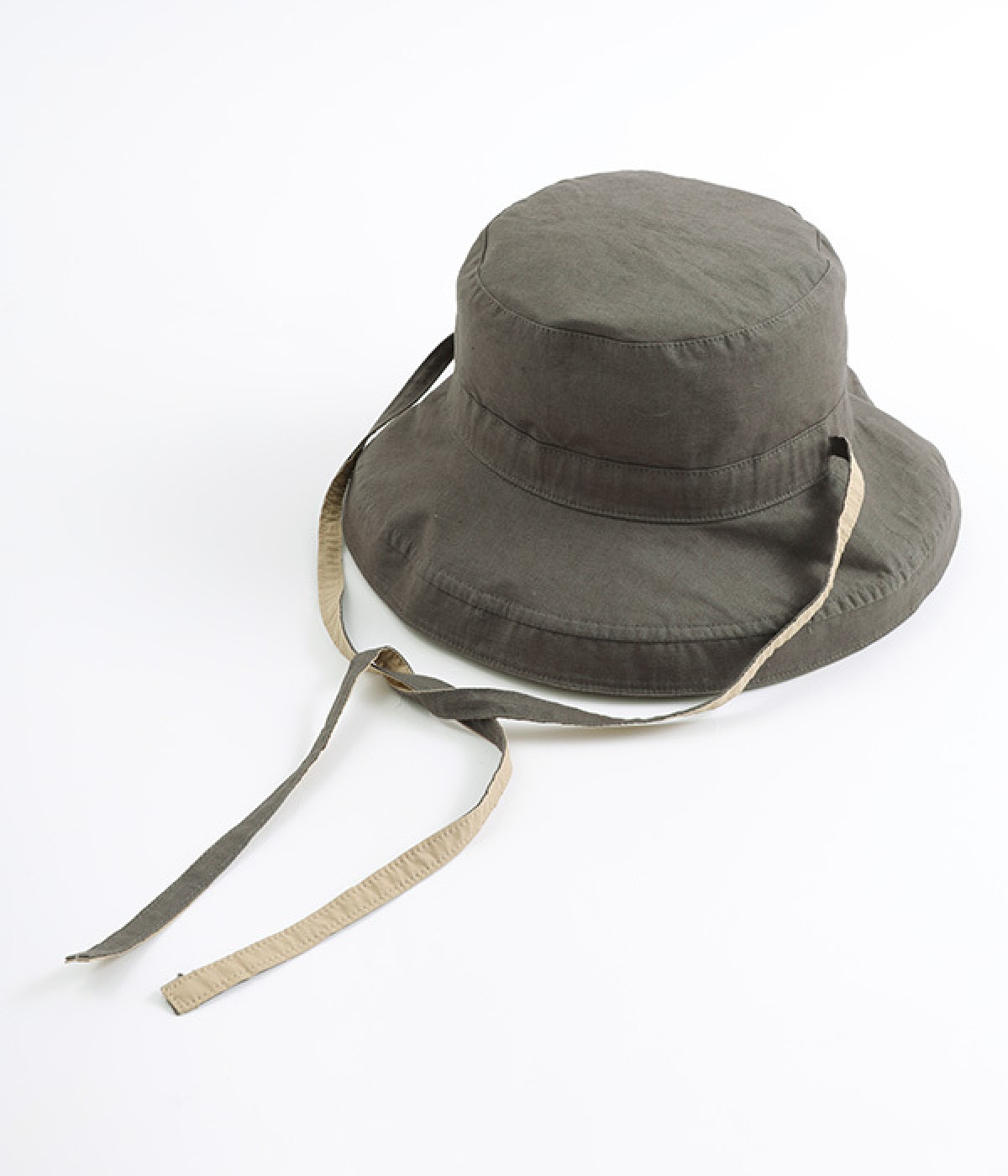 通気性の良いコットン&リネンを使用したリバーシブルタイプのハット。風の強い日や自転車に乗るときは首元でヒモを結んだり、ヒモを後ろで結んでかわいらしいワンポイントにしたりと裏表で使い分けが可能です。幅広のつばは折り返しもでき、日よけしたいときや視界を確保したいときは形を変えることも◎。普段の装いに合わせやすいよう、両面とも落ち着いたカラーをセレクトしています。