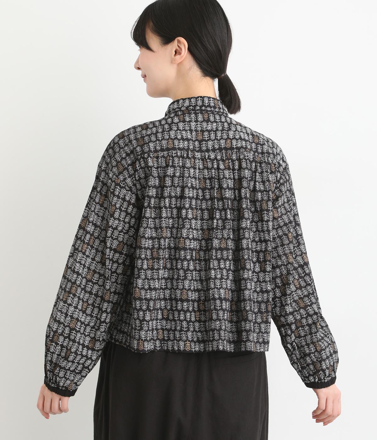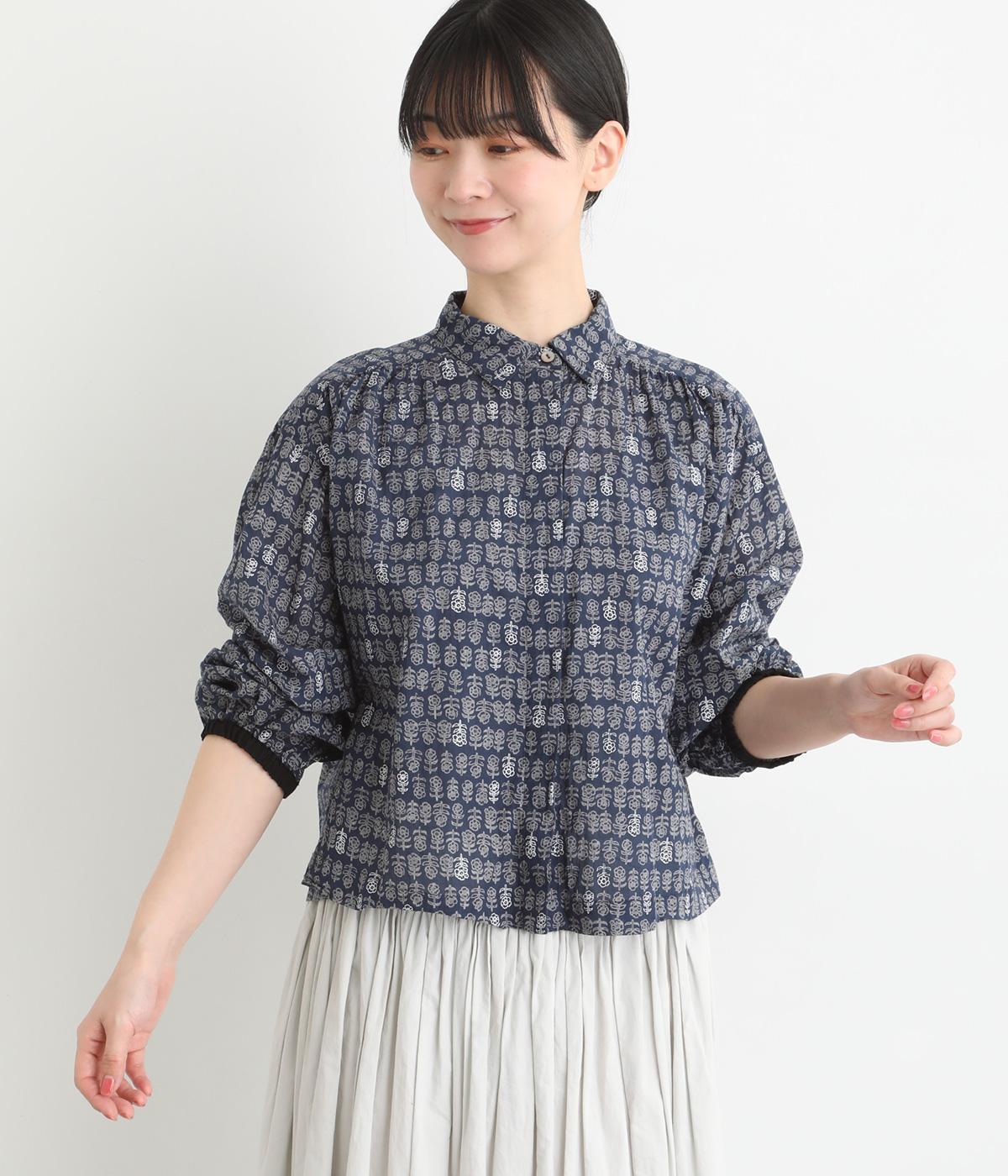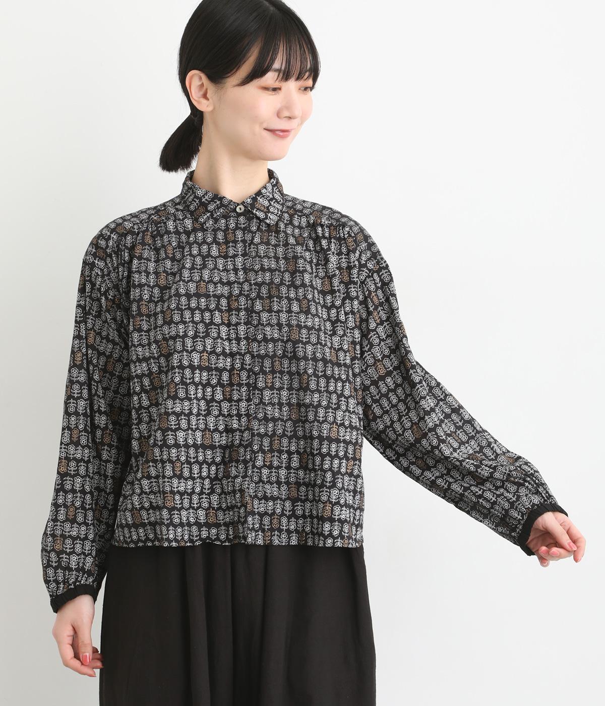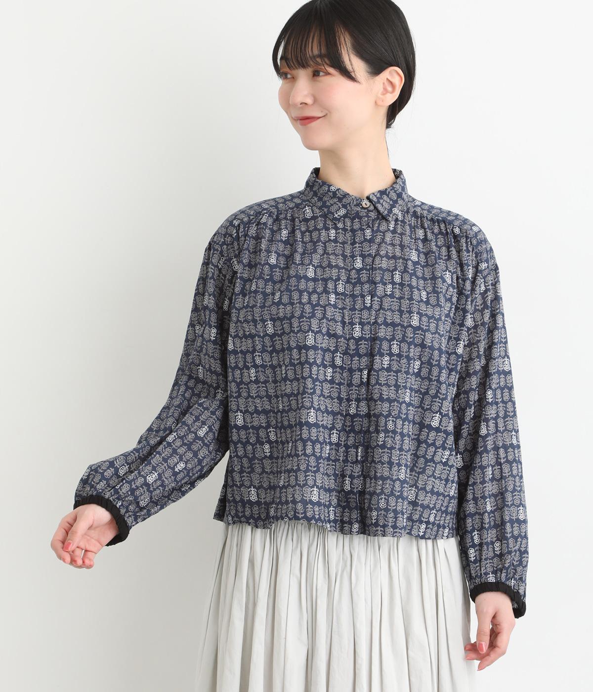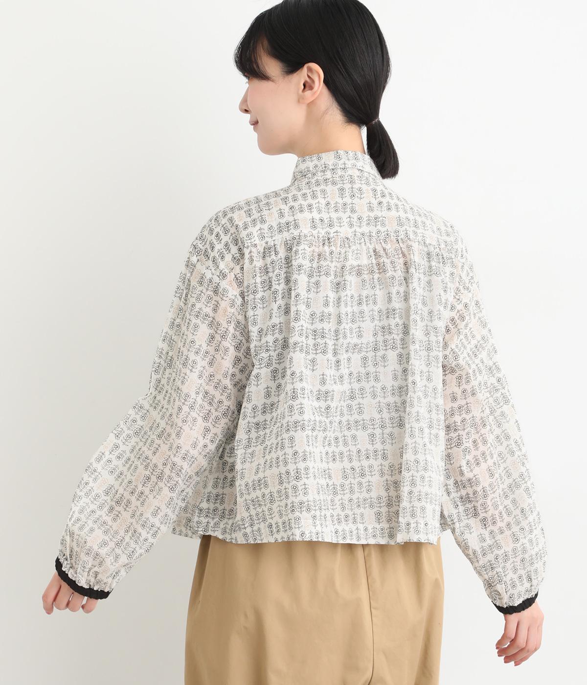 手刷りの味わい深い花柄がナチュラルなムードを運ぶブラウスです。袖口に配色ゴムをあしらいアクセントに。すっきりとしたショート丈で、トップスインしたようなバランスのスタイリングが楽しめます。