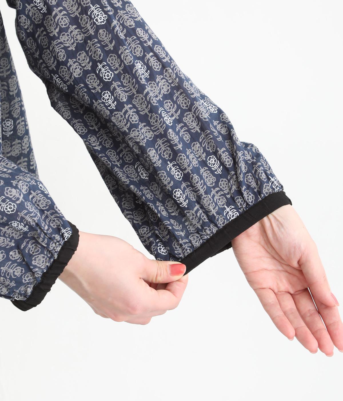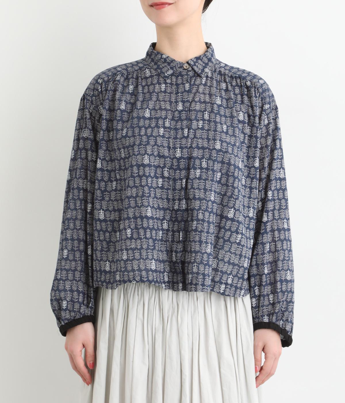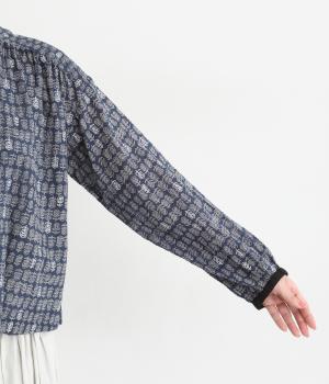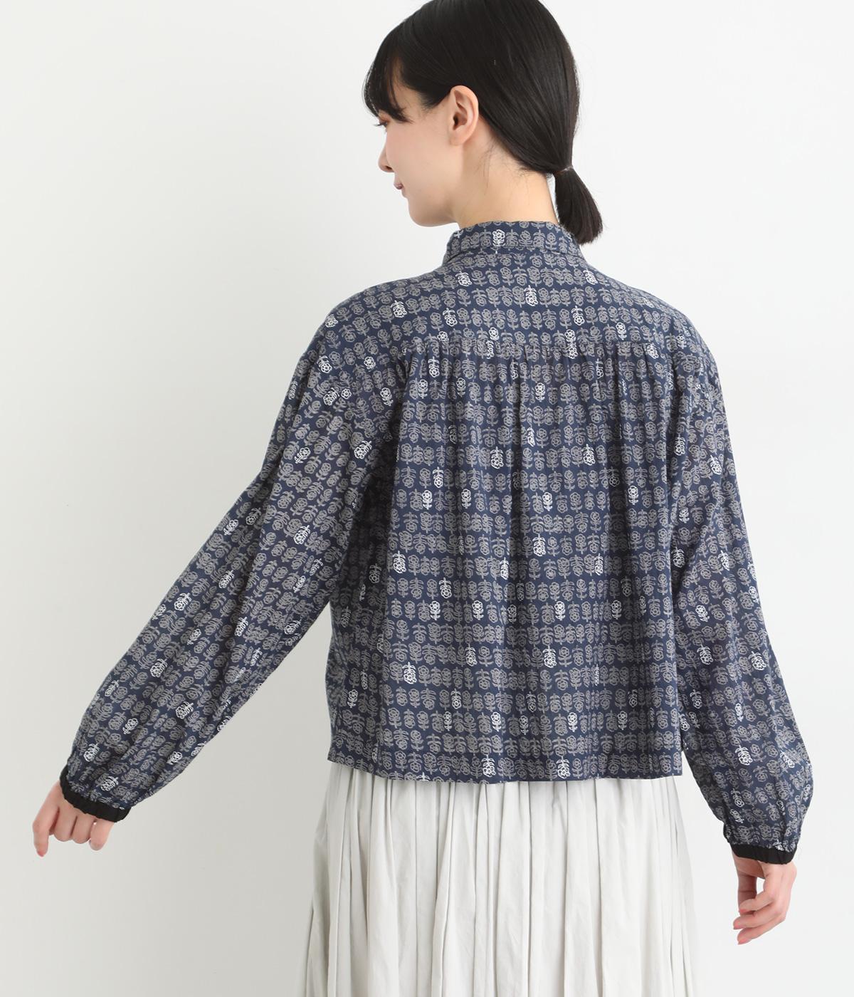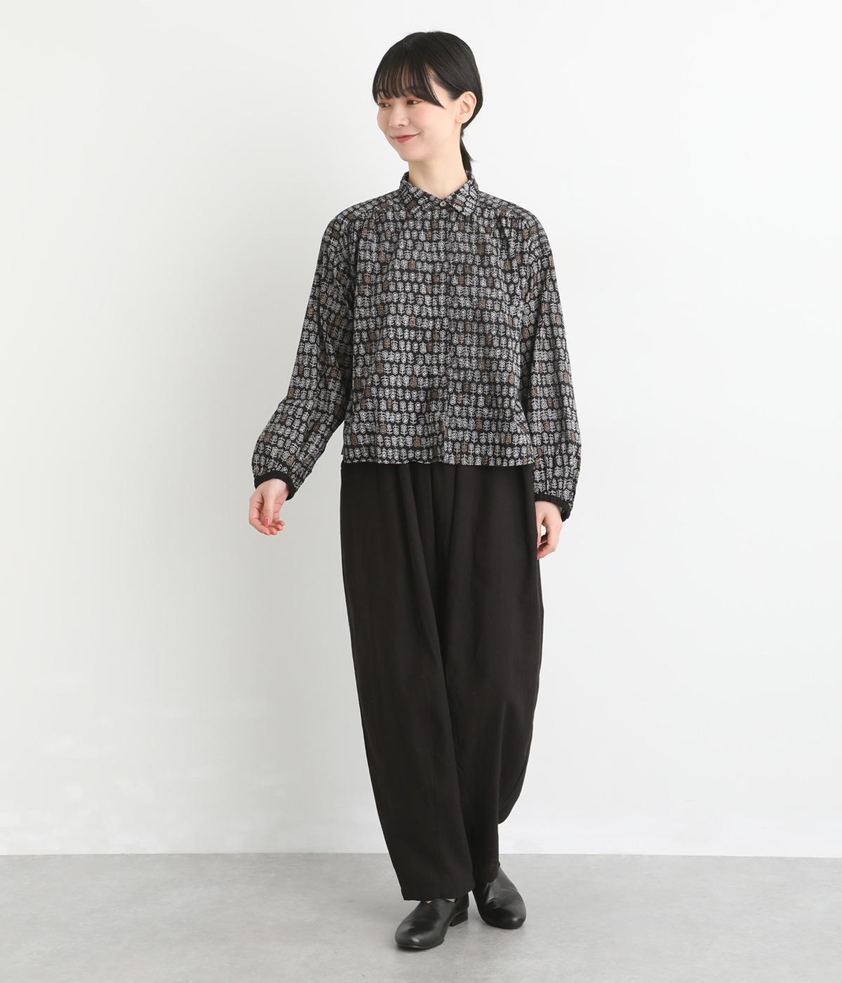 手刷りの味わい深い花柄がナチュラルなムードを運ぶブラウスです。袖口に配色ゴムをあしらいアクセントに。すっきりとしたショート丈で、トップスインしたようなバランスのスタイリングが楽しめます。