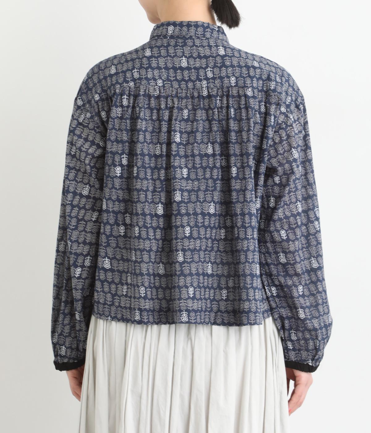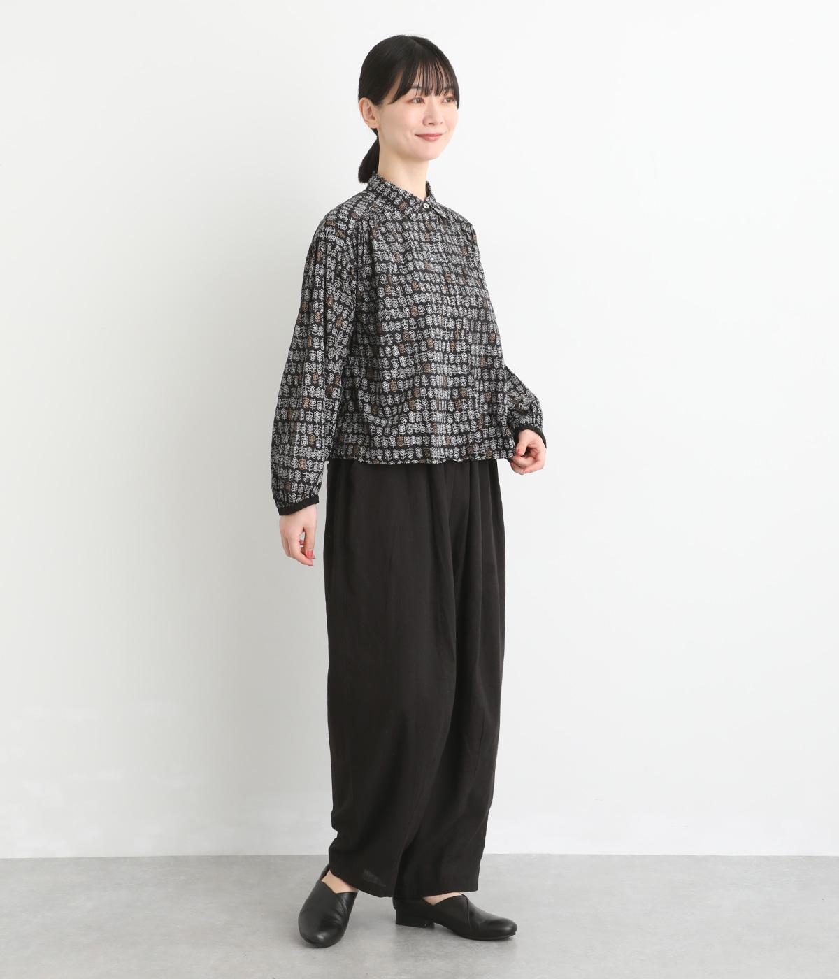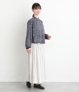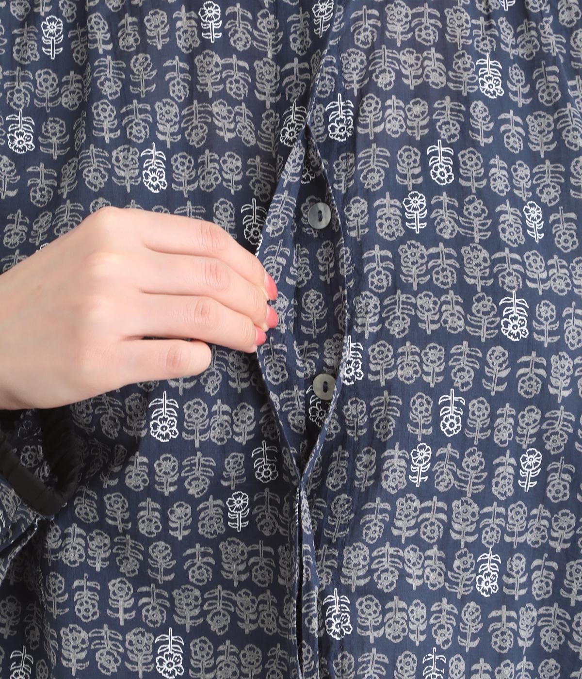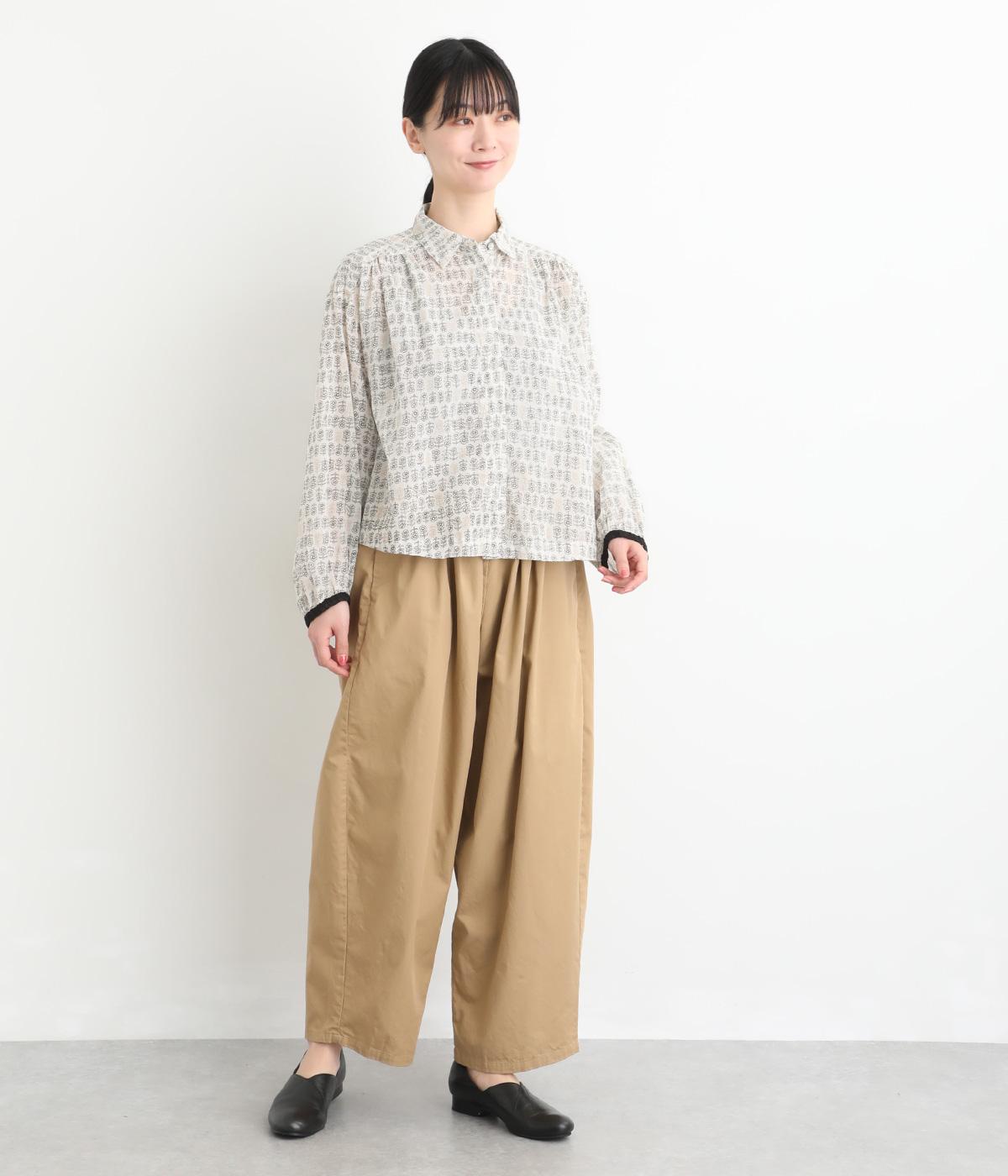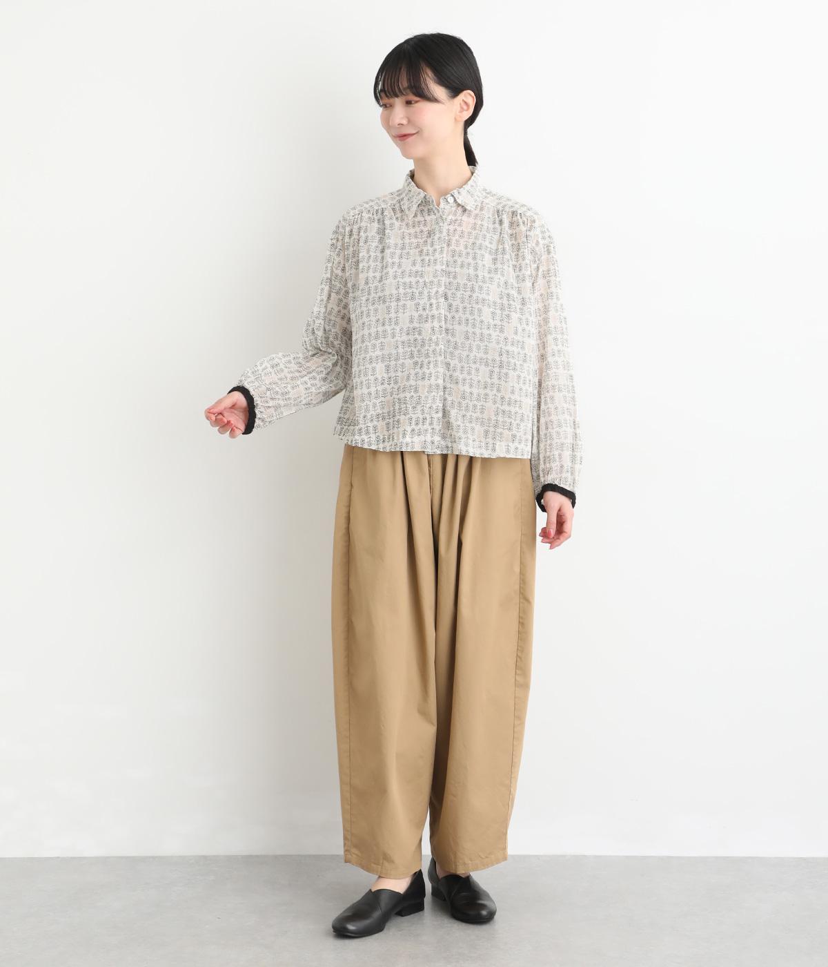 手刷りの味わい深い花柄がナチュラルなムードを運ぶブラウスです。袖口に配色ゴムをあしらいアクセントに。すっきりとしたショート丈で、トップスインしたようなバランスのスタイリングが楽しめます。