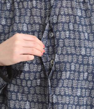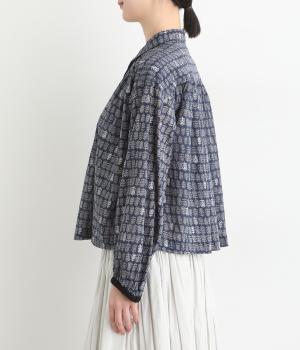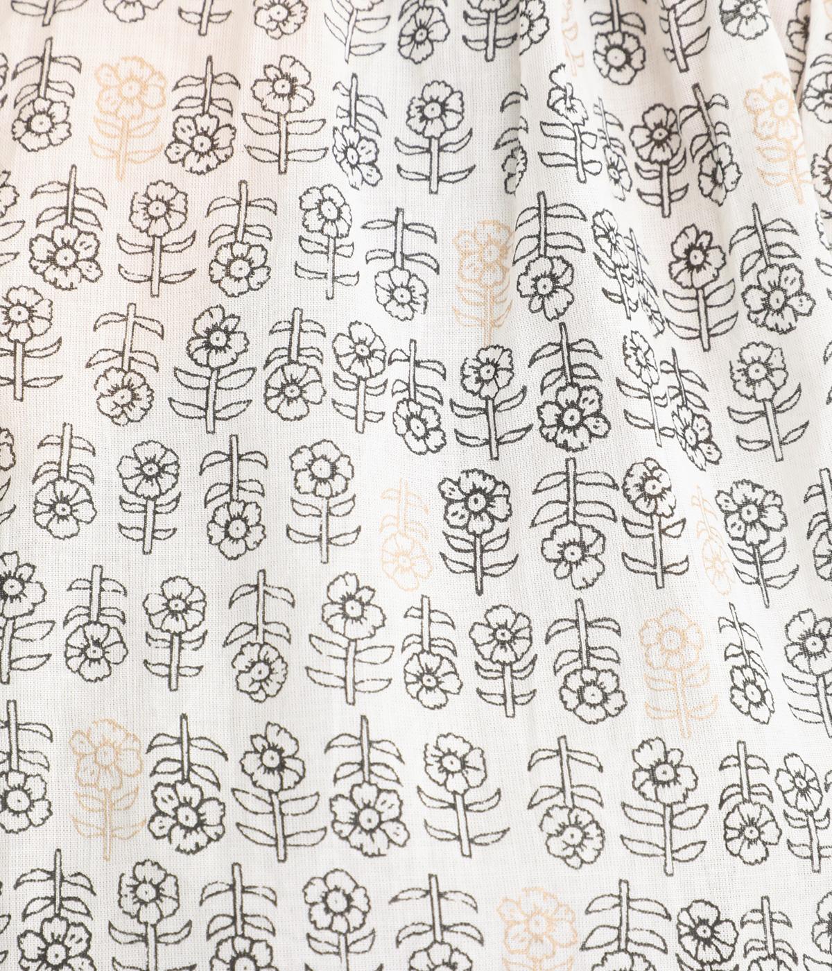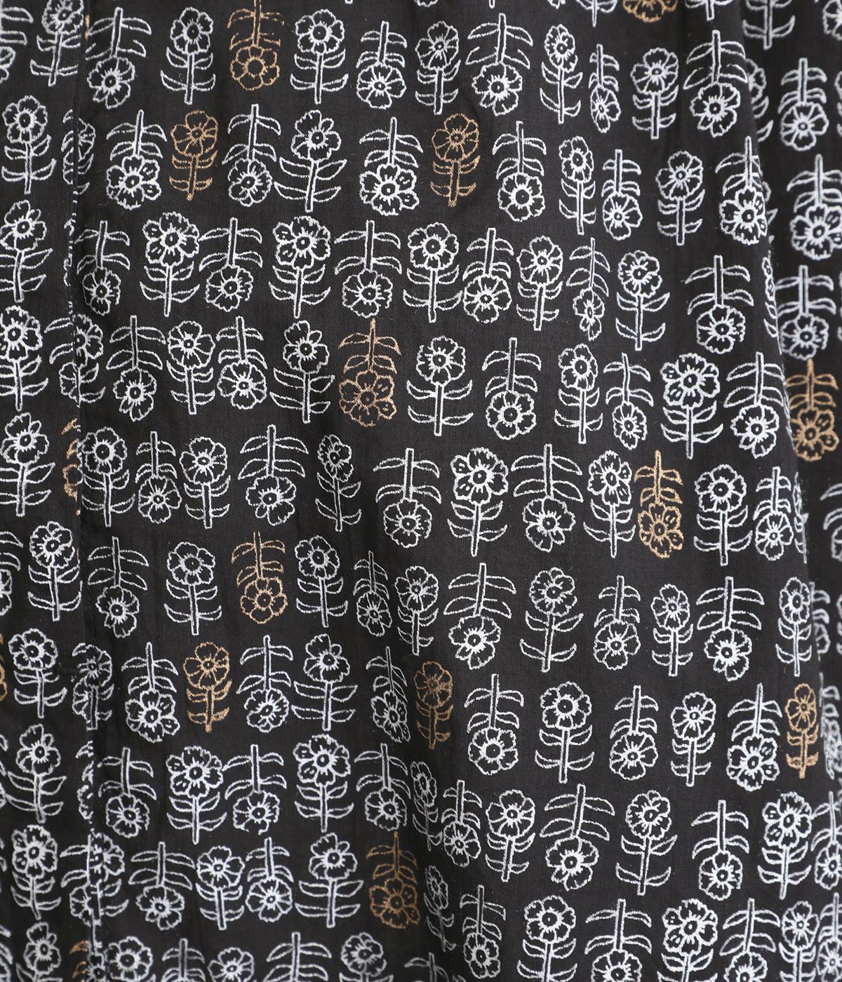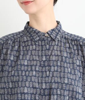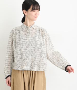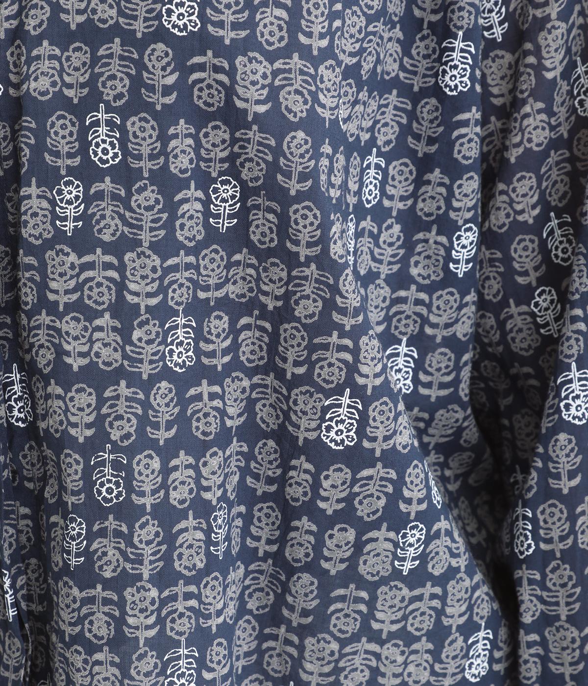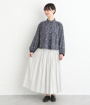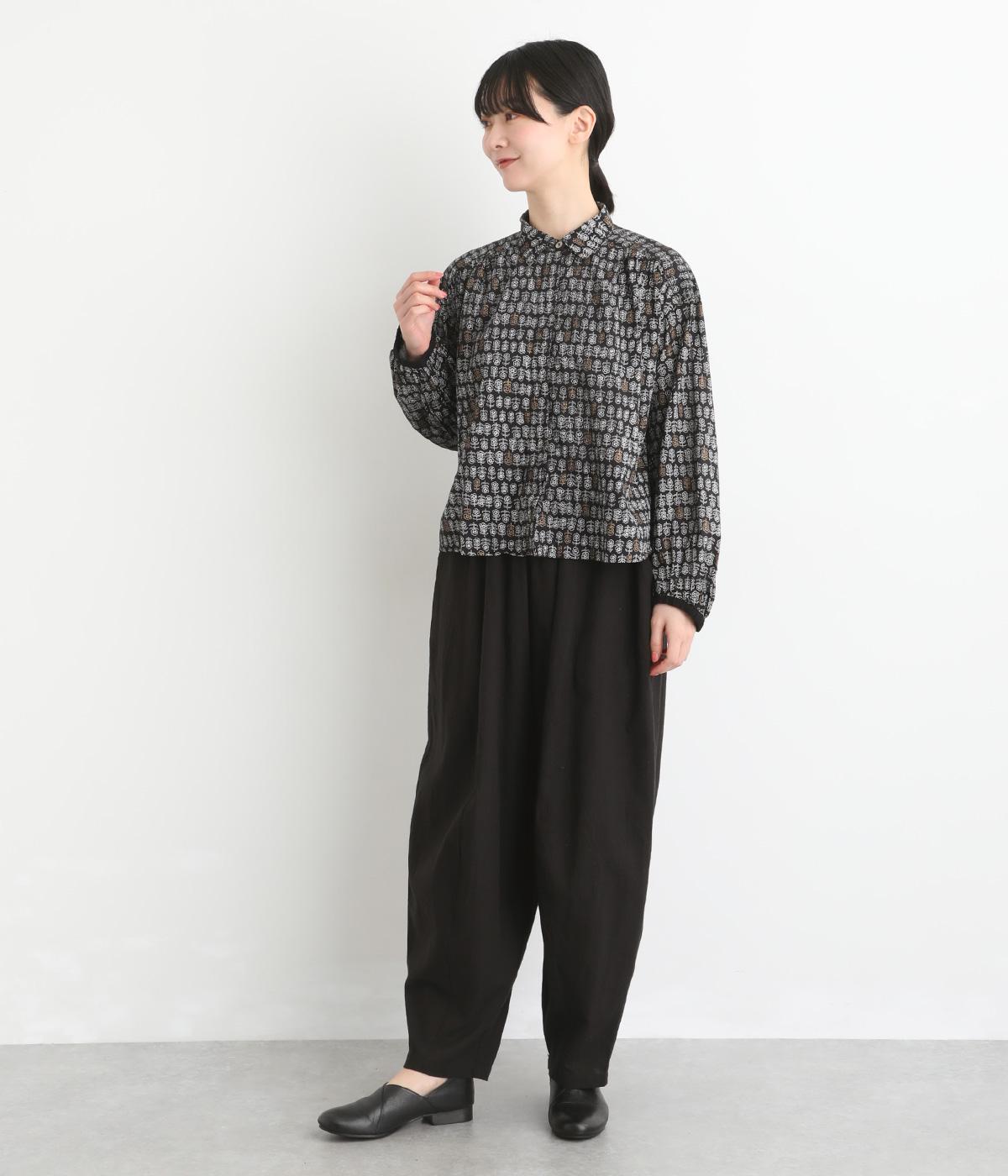 手刷りの味わい深い花柄がナチュラルなムードを運ぶブラウスです。袖口に配色ゴムをあしらいアクセントに。すっきりとしたショート丈で、トップスインしたようなバランスのスタイリングが楽しめます。