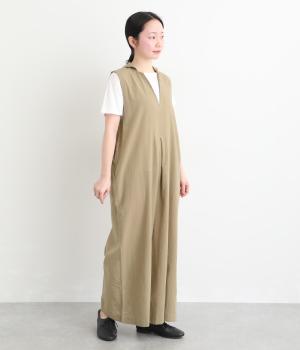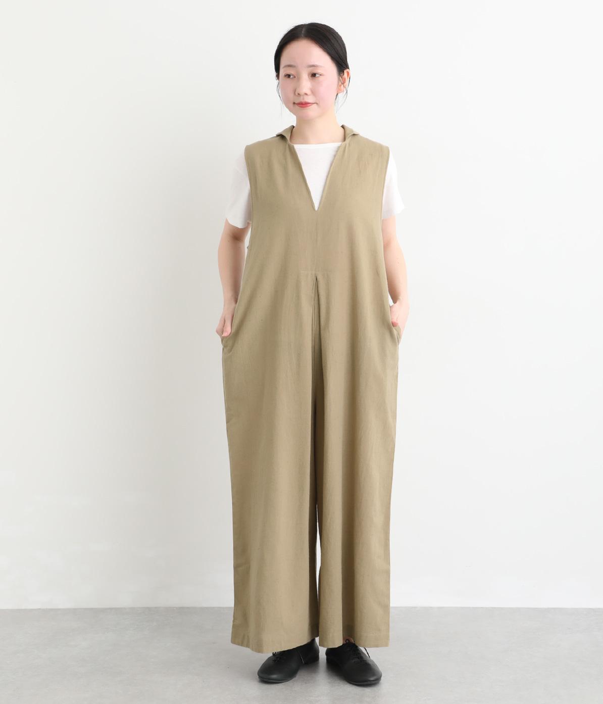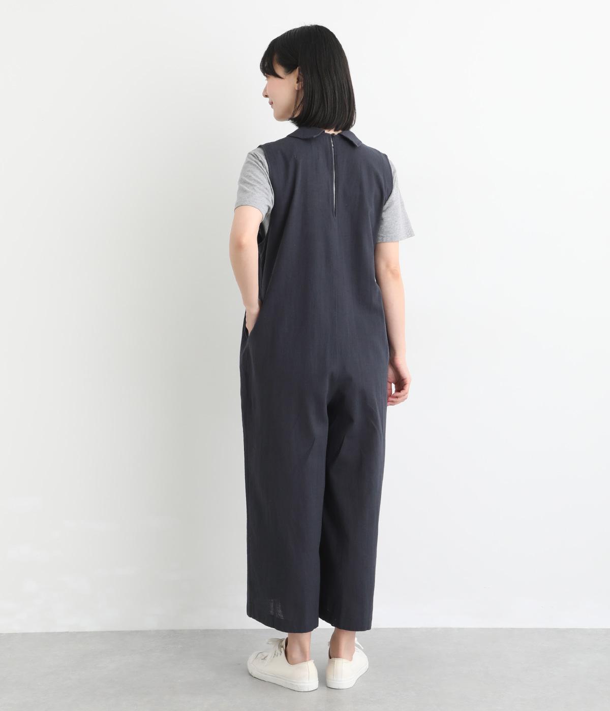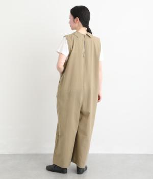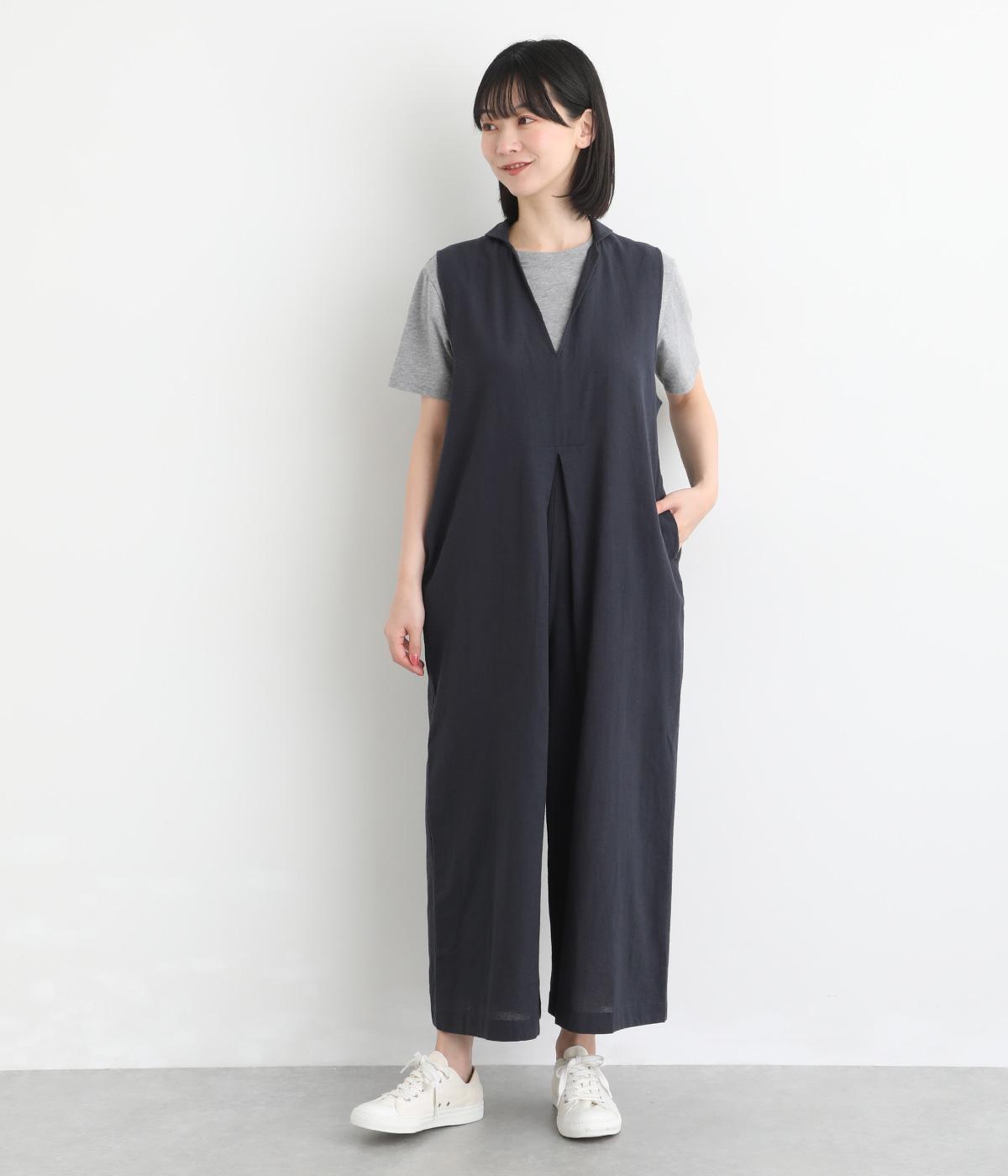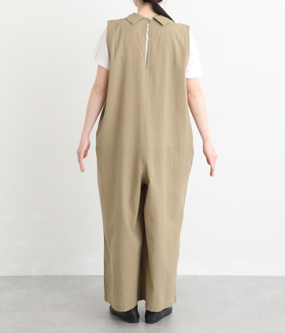 フロントにタックをあしらい、ほどよくゆとりをもたせたオールインワン。小さな襟がさりげないアクセントになり、ナチュラルな装いにきちんと感を添えます。背中の開きが、うしろ姿に軽やかな抜け感を添えます。