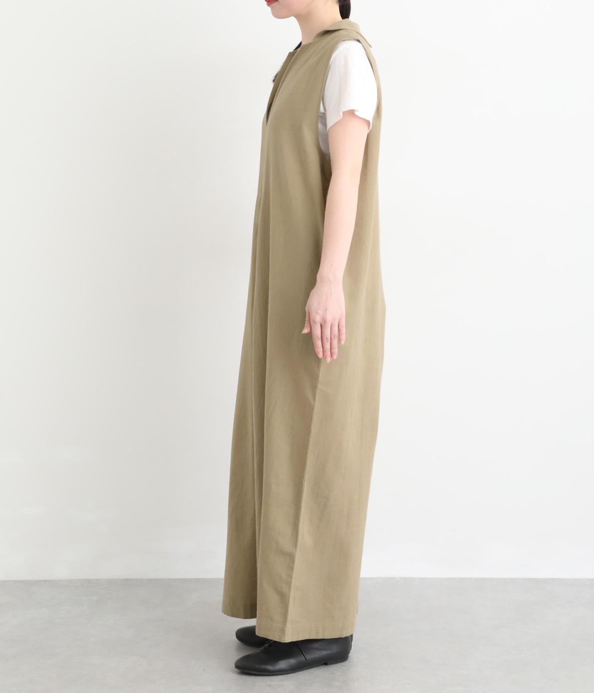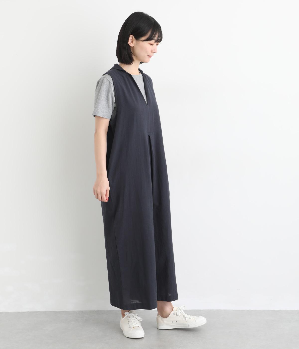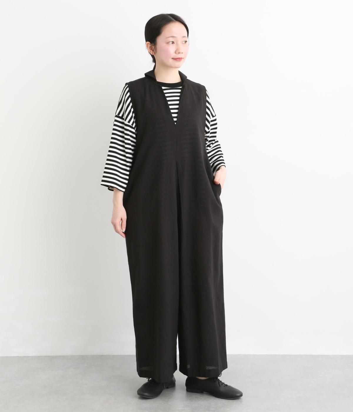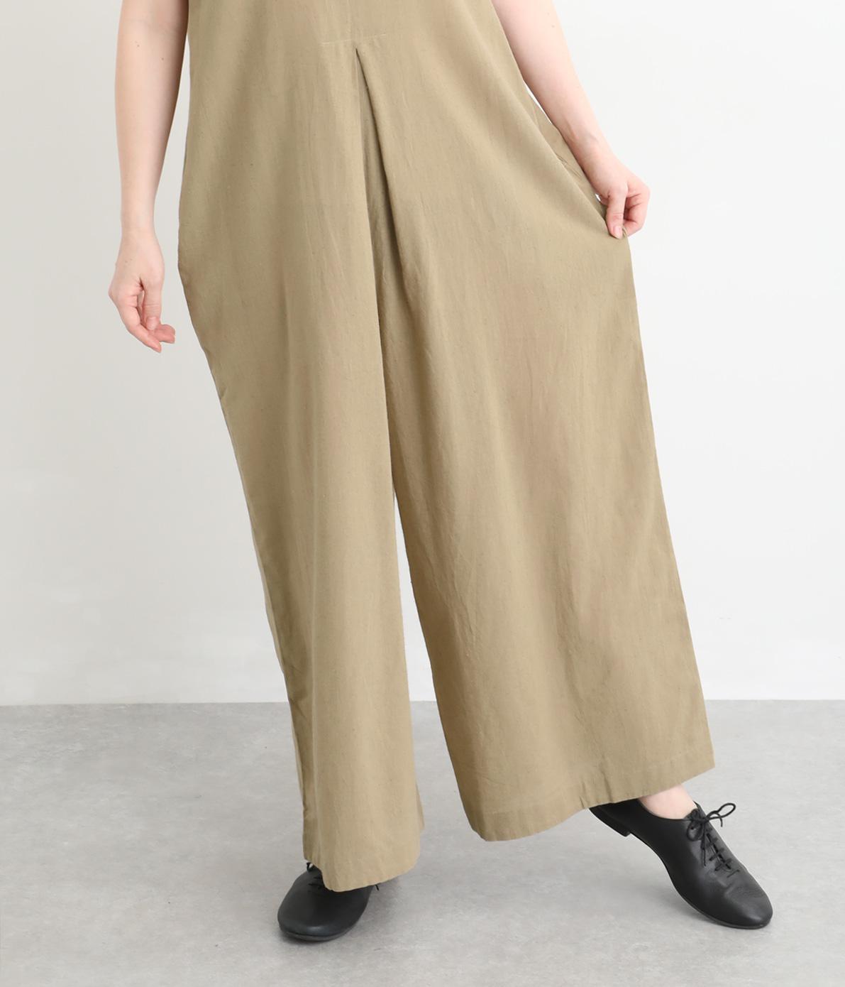 フロントにタックをあしらい、ほどよくゆとりをもたせたオールインワン。小さな襟がさりげないアクセントになり、ナチュラルな装いにきちんと感を添えます。背中の開きが、うしろ姿に軽やかな抜け感を添えます。