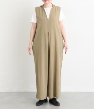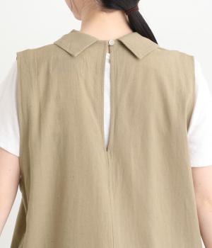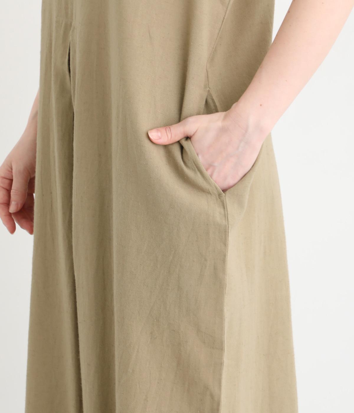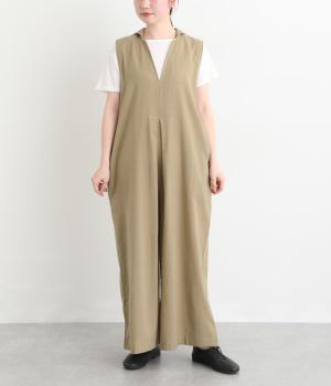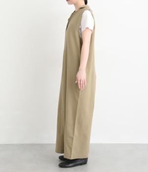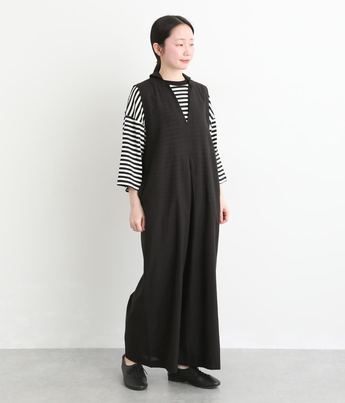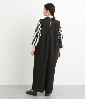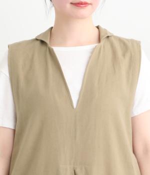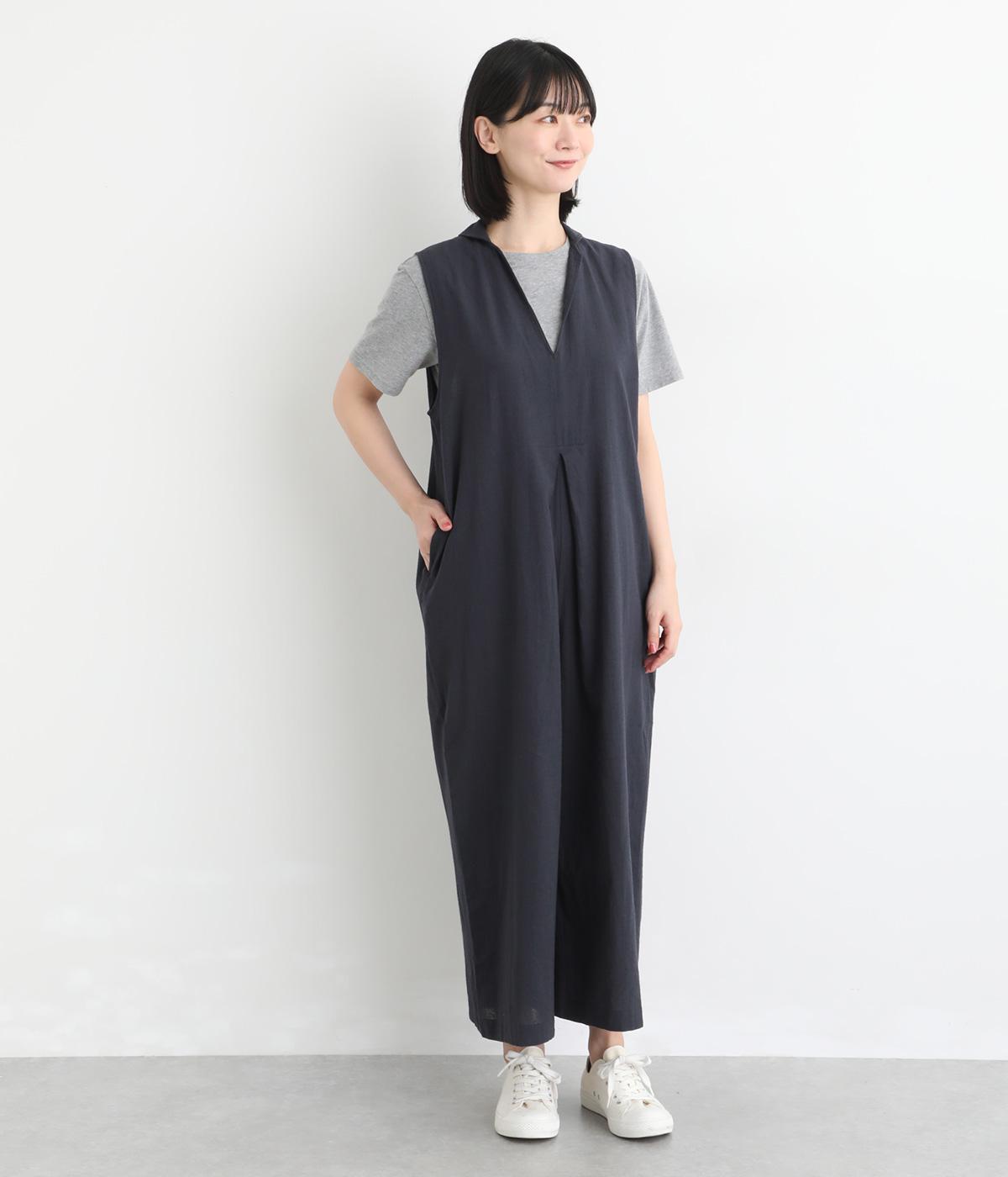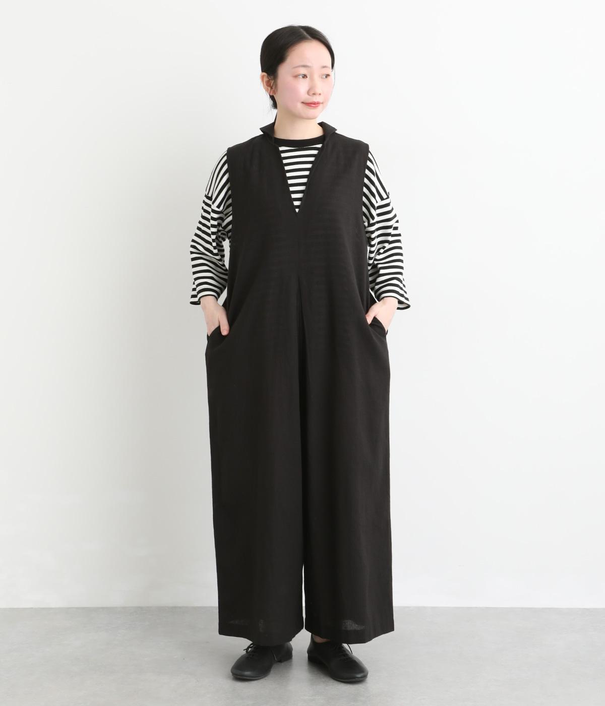 フロントにタックをあしらい、ほどよくゆとりをもたせたオールインワン。小さな襟がさりげないアクセントになり、ナチュラルな装いにきちんと感を添えます。背中の開きが、うしろ姿に軽やかな抜け感を添えます。