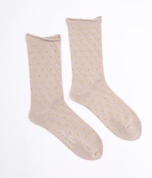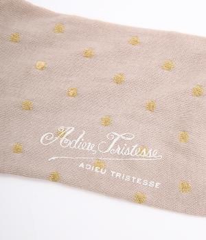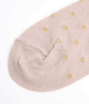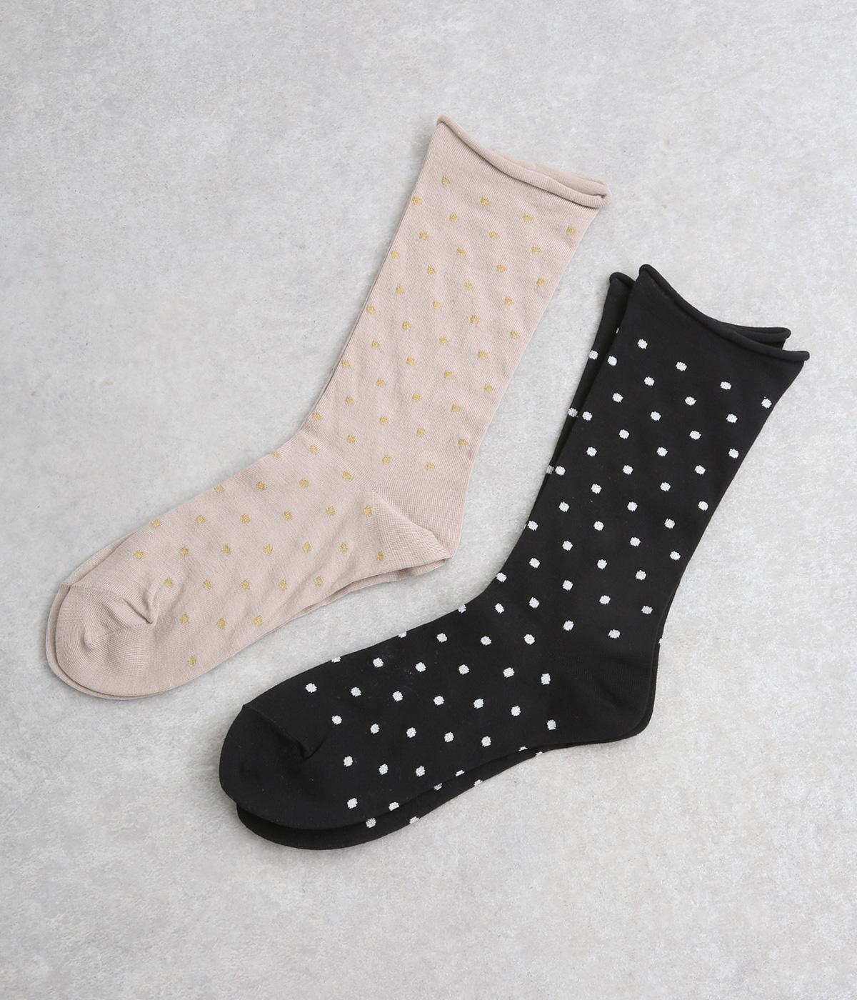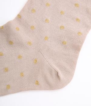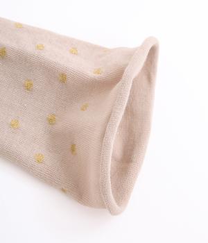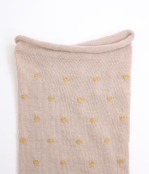 跡がつきにくい履き口がロール仕様のソックス。シンプルなドット柄をラメ糸で表現し、足もとにさりげないきらめきを添えました。ほどよい存在感で、装いにきれいめなニュアンスをプラスします。