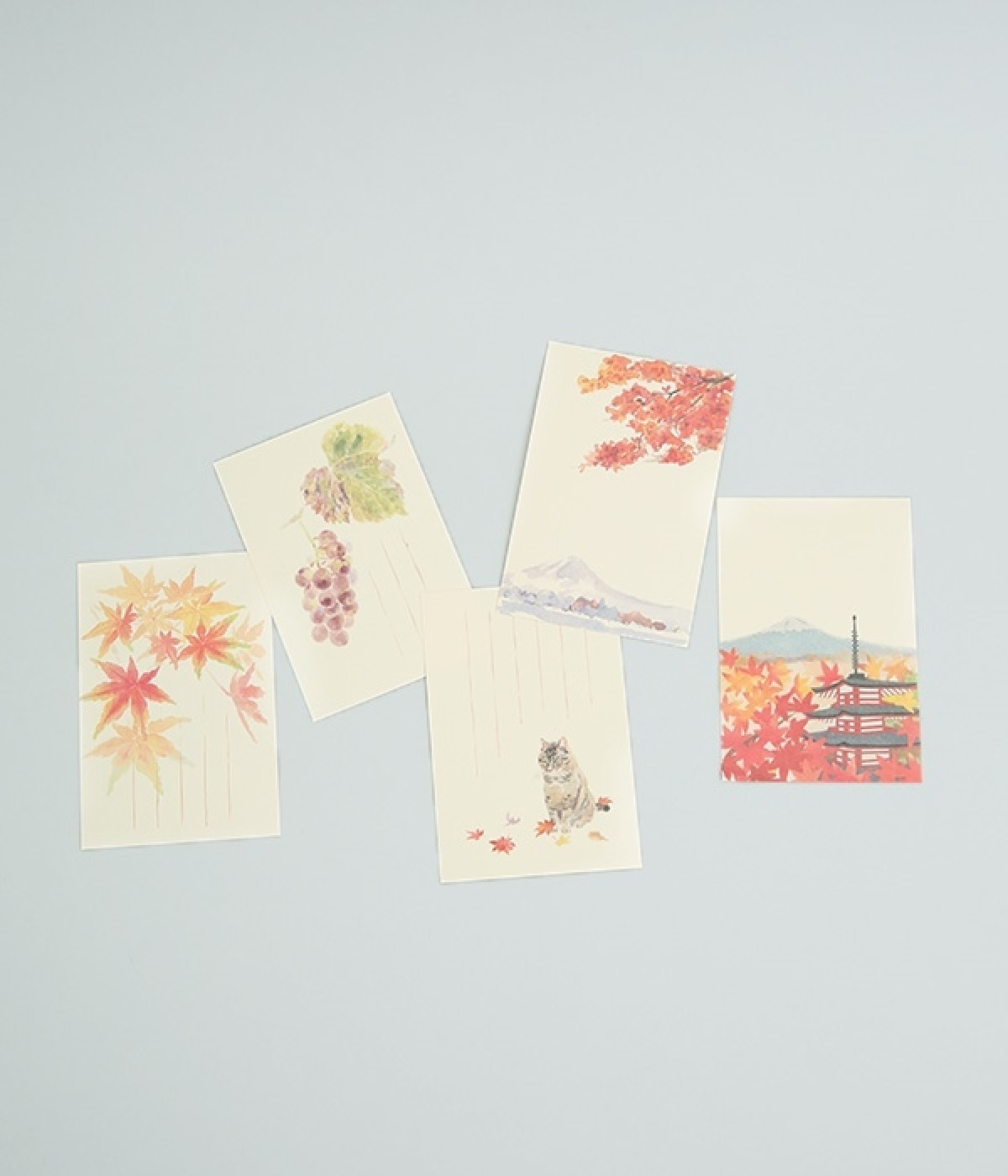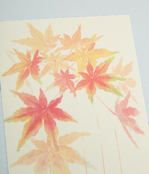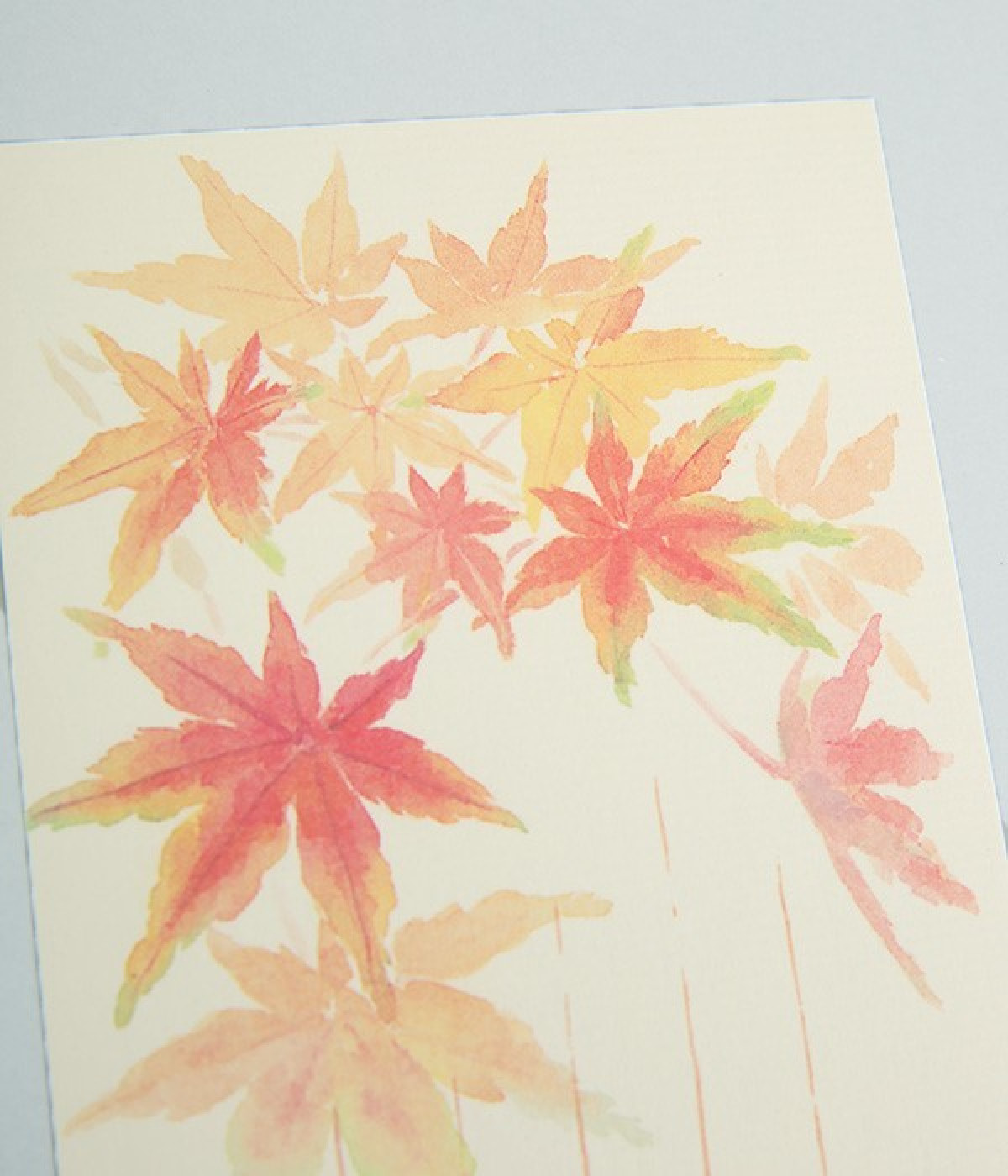 表面がキラキラした簀の目(スノメ)和紙で、角度によってかすかに光るのが特徴のハガキです。色あざやかに紅く染まったグラデーションのもみじのイラストと共に、手書き風の緩やかな罫線が入っています。季節を深く感じられる、お便りにおすすめの一枚です。宛名面は官製ハガキと同じような質感。共にペン・毛筆・プリンターでの使用が可能です。