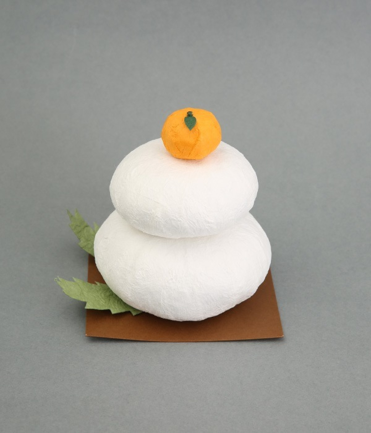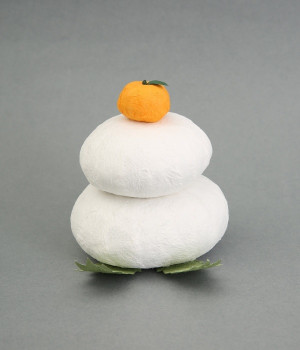 和紙でできたお正月飾りです。新しい一年の福を持ってくる歳神さまは、供えられたお餅に腰掛け、宿るといわれています。お餅のまんまるは円満をあらわし、お餅を二つ重ねるのは「福が重なる」「めでたく年をとる」という意味が込められています。和紙製なので軽量で、棚の上などにも安全に飾ることができます。和紙のでこぼことした表情が、まるで本物のお餅のよう。ミカンの質感や葉っぱまで、丁寧に表現されています。毎年繰り返して使えるのもうれしいポイント。