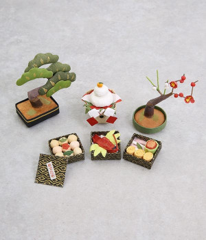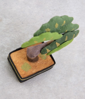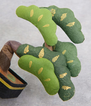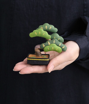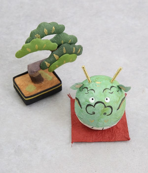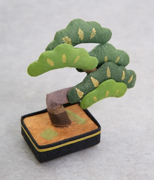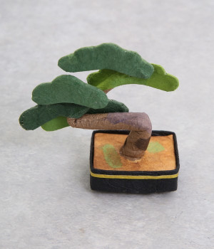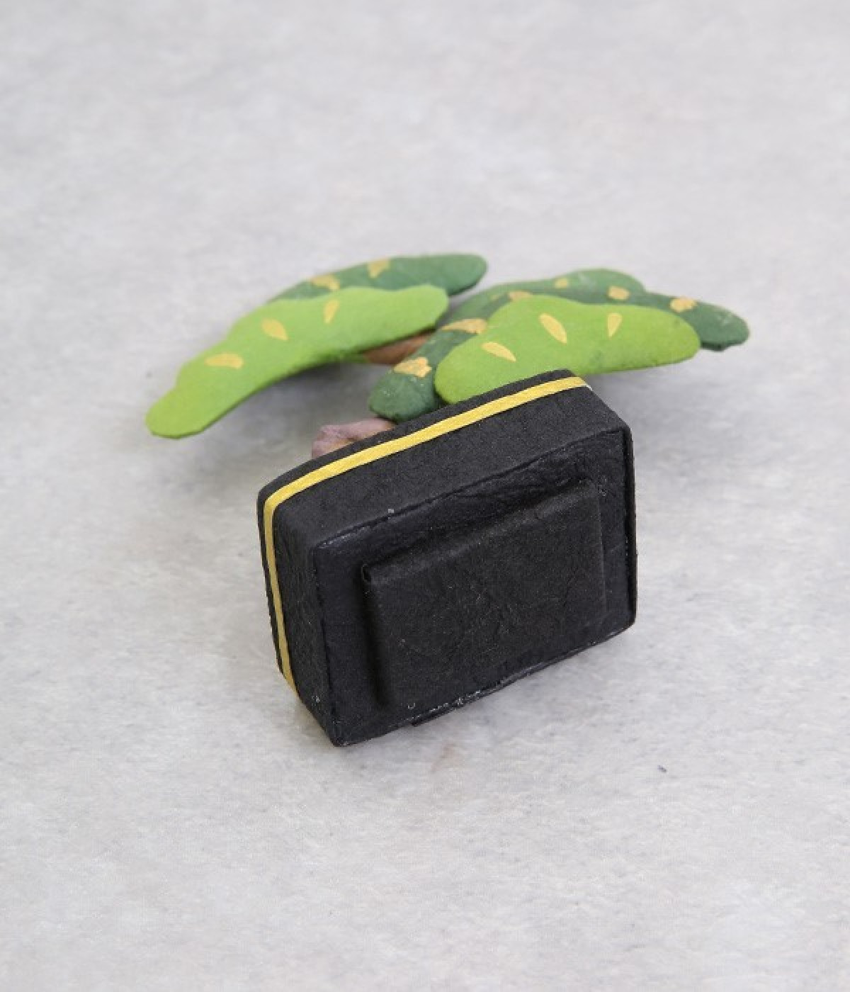 和紙で作られた小さな松の盆栽の置き飾りです。慶事を代表する植物、松竹梅。中でも松は常緑樹であり冬も緑の葉を茂らせることから、若さと不老長寿のシンボルとなっています。神の天下りを「待つ(松)」めでたい木で、現世と神を媒介する役割があるといわれています。小ぶりなのでリビングや玄関などに飾りやすく、紅白梅など他シリーズと組み合わせて並べたりと楽しめます。ちょっとしたギフトにも最適です。