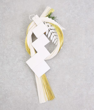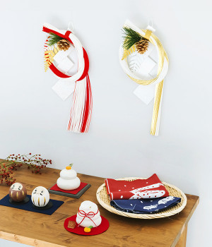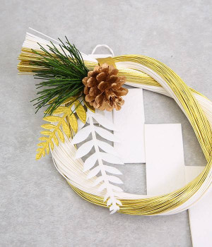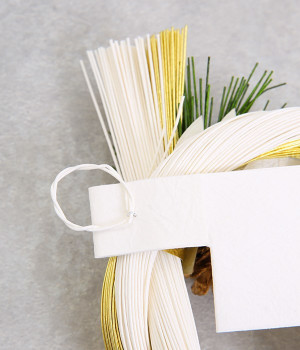 丁寧な作りと上品な配色が美しい「水引金白」ののし飾りです。金と白の水引の束を贅沢に結い、のしや松かさなどがあしらわれています。シンプルで品が良く、和洋どちらの雰囲気にも合わせやすいモダンなデザイン。玄関やお部屋の扉などに気軽に飾れて、ちょっとしたギフトにも最適です。