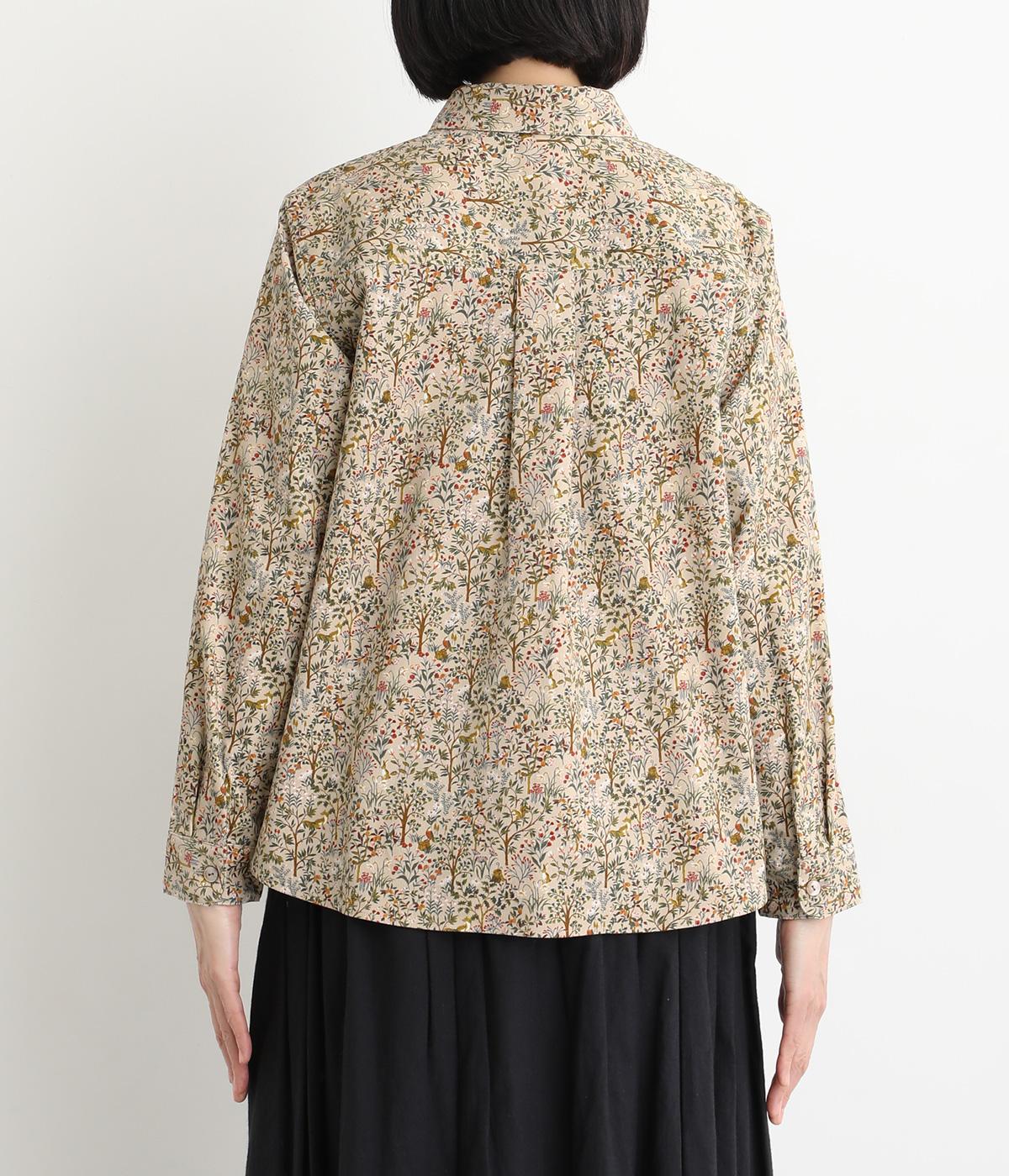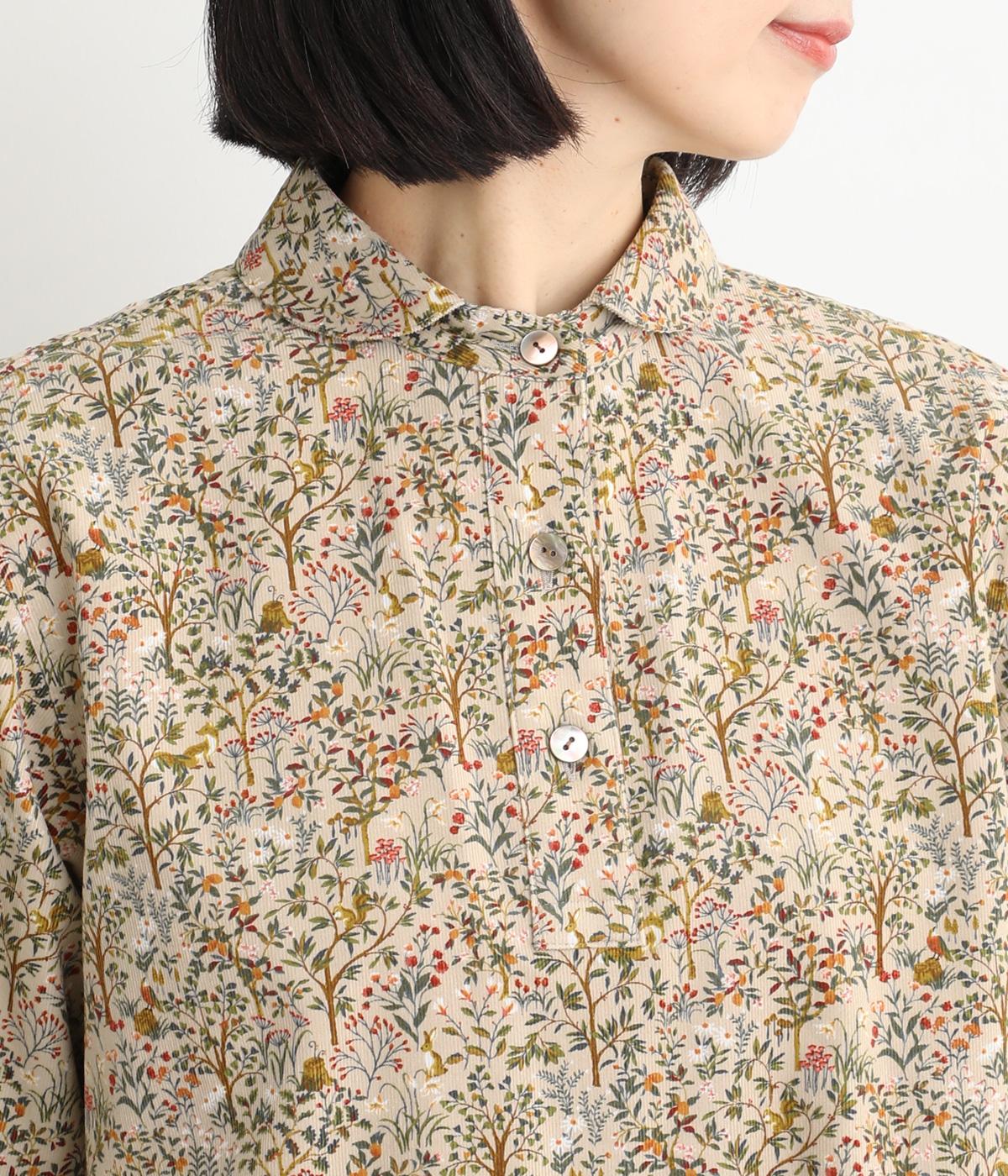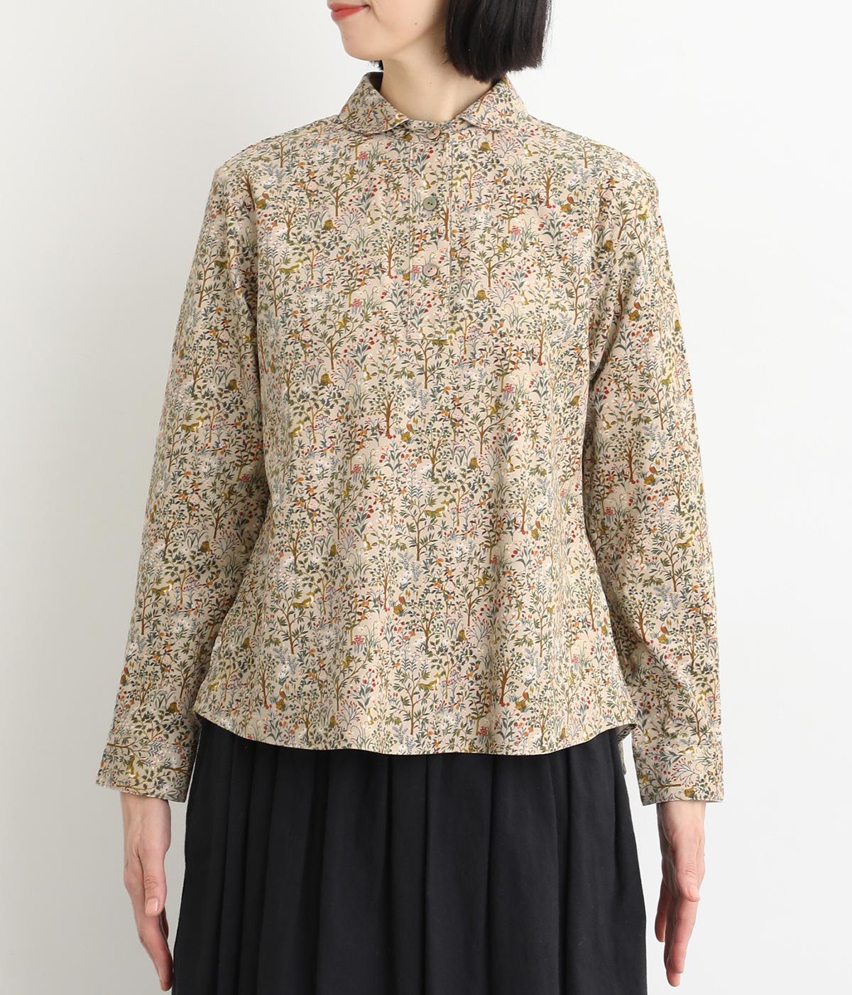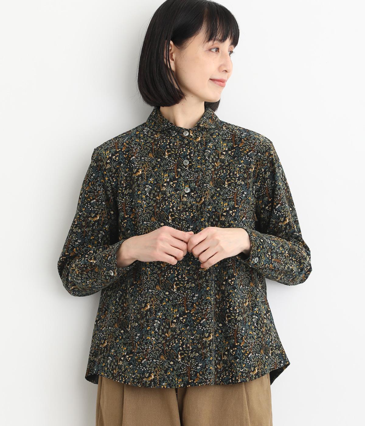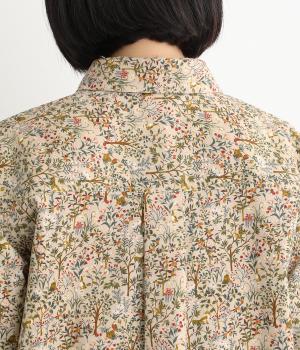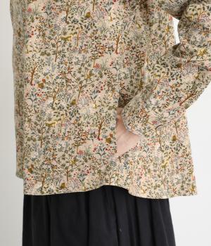 うさぎやリスなど愛らしい動物の住む森をモチーフにした総柄が素敵。柄のイメージにもマッチする、クラシカルな丸襟シャツを仕立てました。胸位置まで開くフロントボタンがアクセントに。両サイドには便利なポケットをつけています。