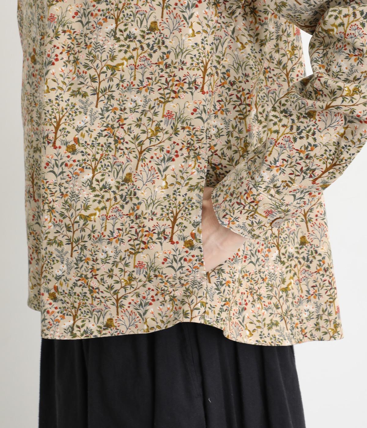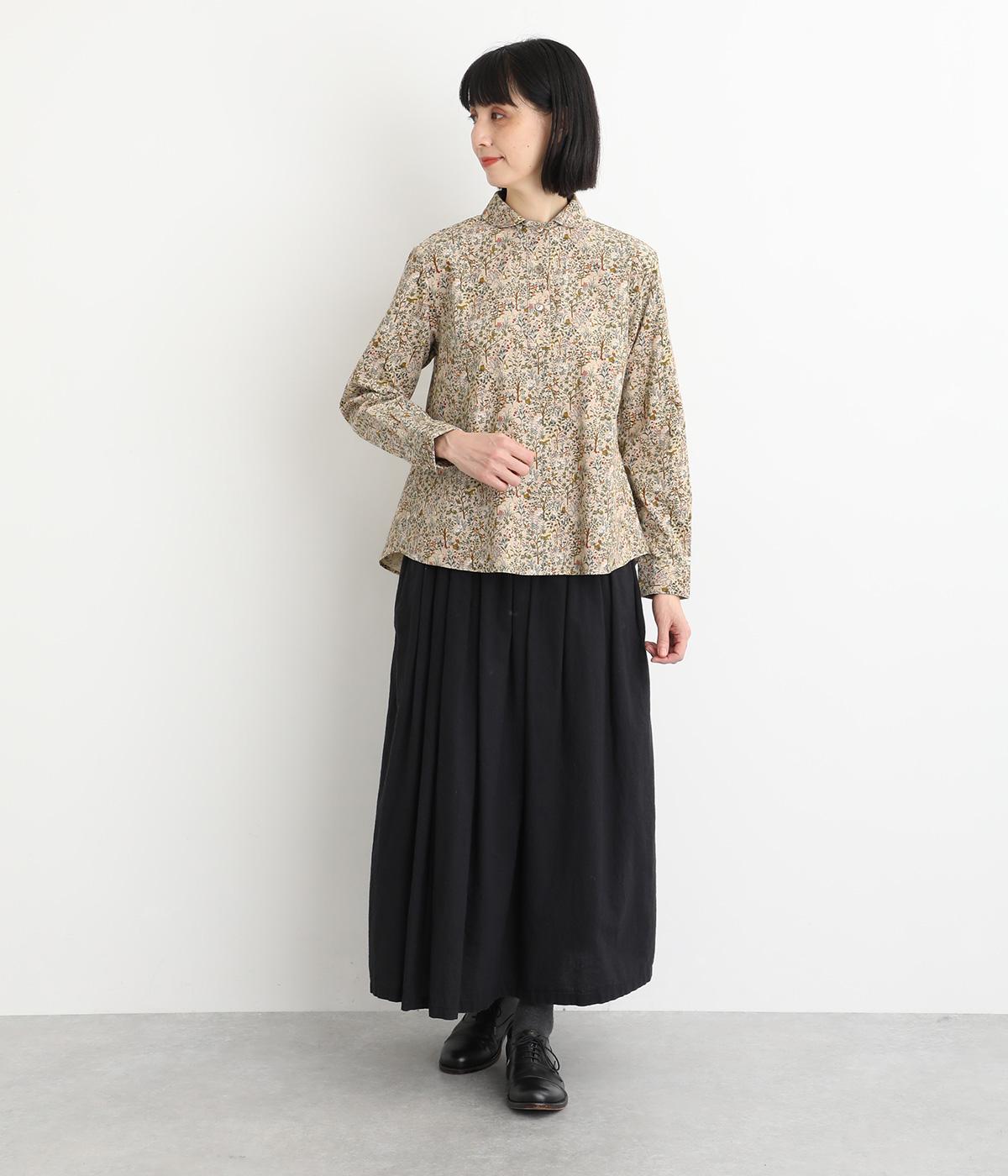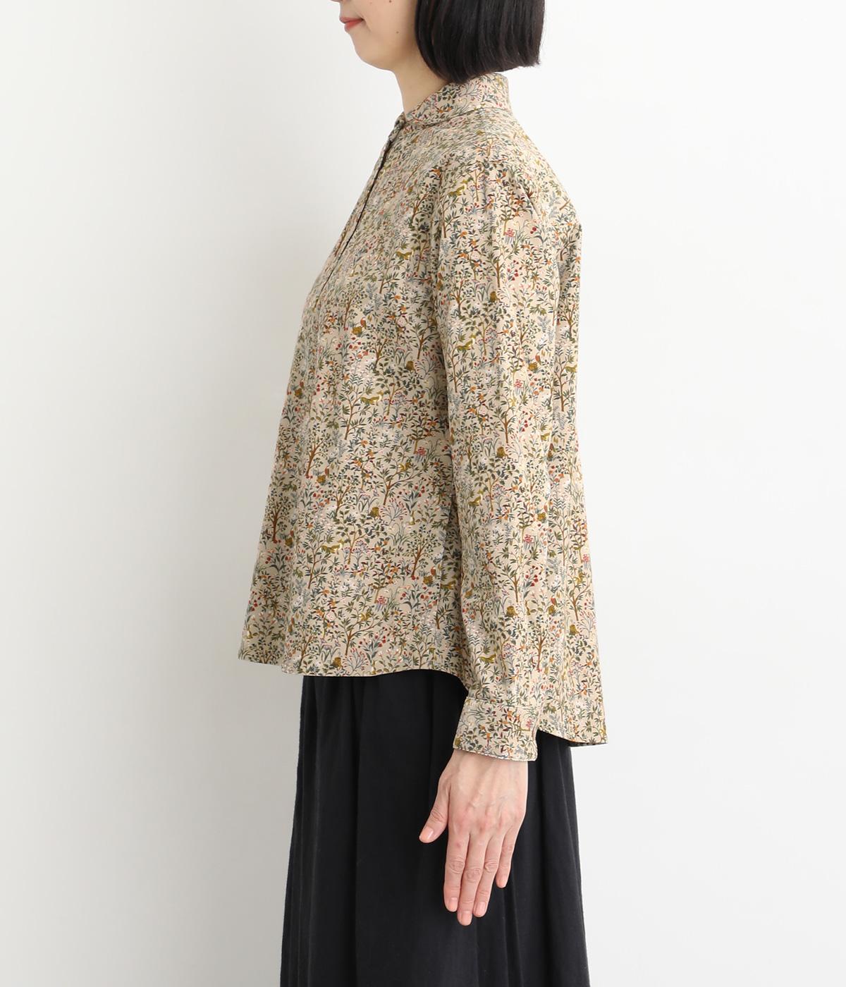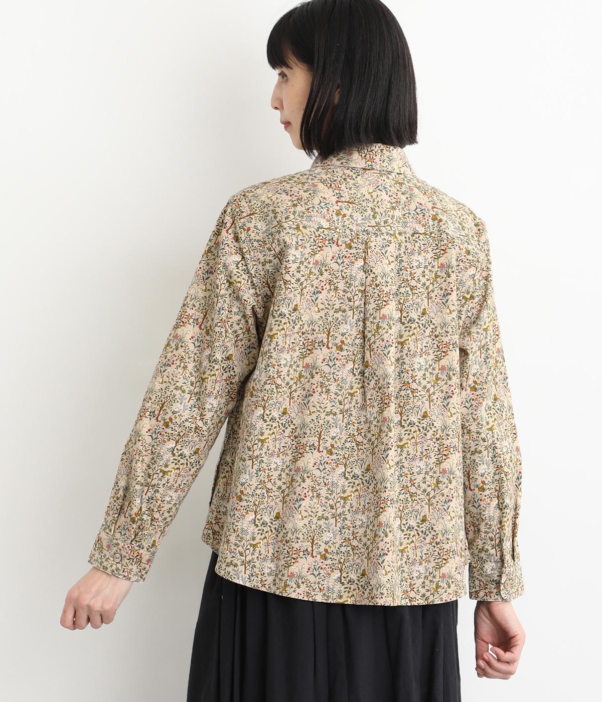 うさぎやリスなど愛らしい動物の住む森をモチーフにした総柄が素敵。柄のイメージにもマッチする、クラシカルな丸襟シャツを仕立てました。胸位置まで開くフロントボタンがアクセントに。両サイドには便利なポケットをつけています。