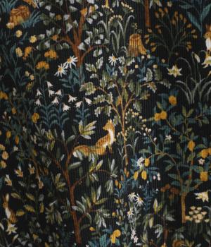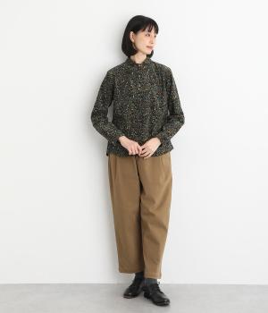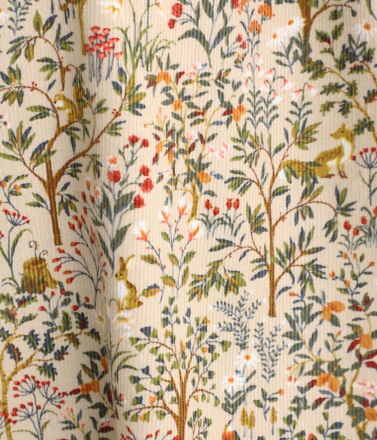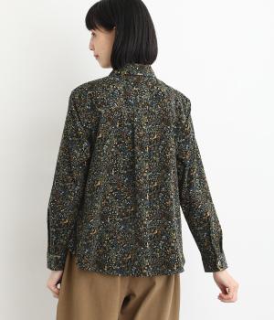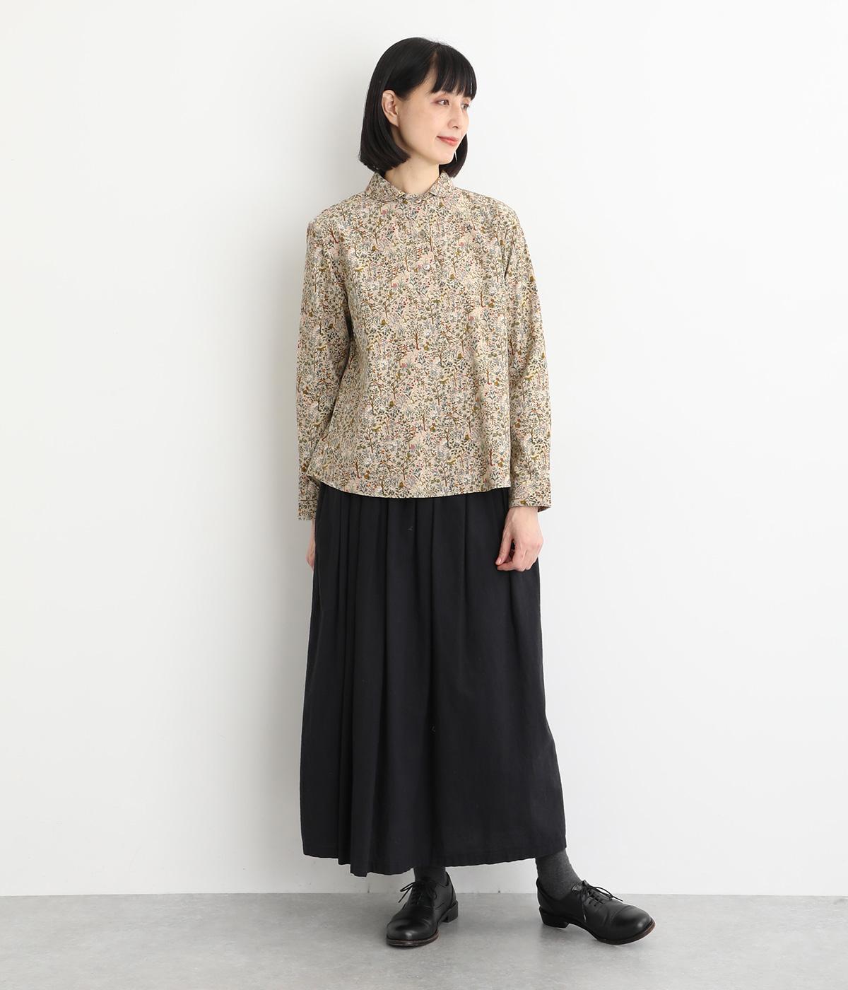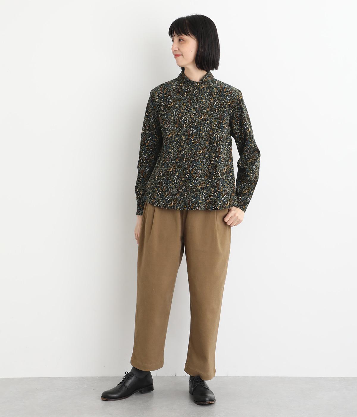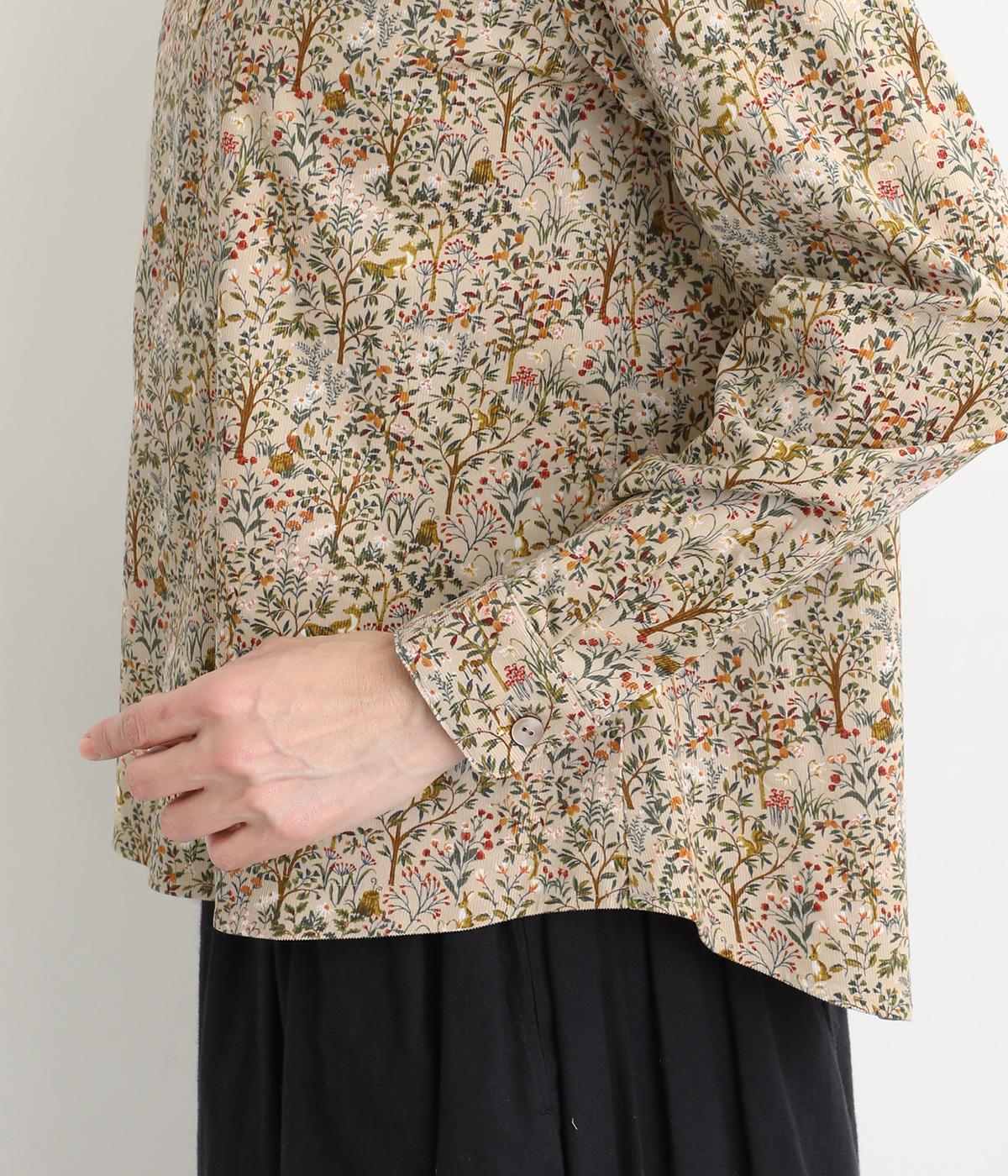 うさぎやリスなど愛らしい動物の住む森をモチーフにした総柄が素敵。柄のイメージにもマッチする、クラシカルな丸襟シャツを仕立てました。胸位置まで開くフロントボタンがアクセントに。両サイドには便利なポケットをつけています。
