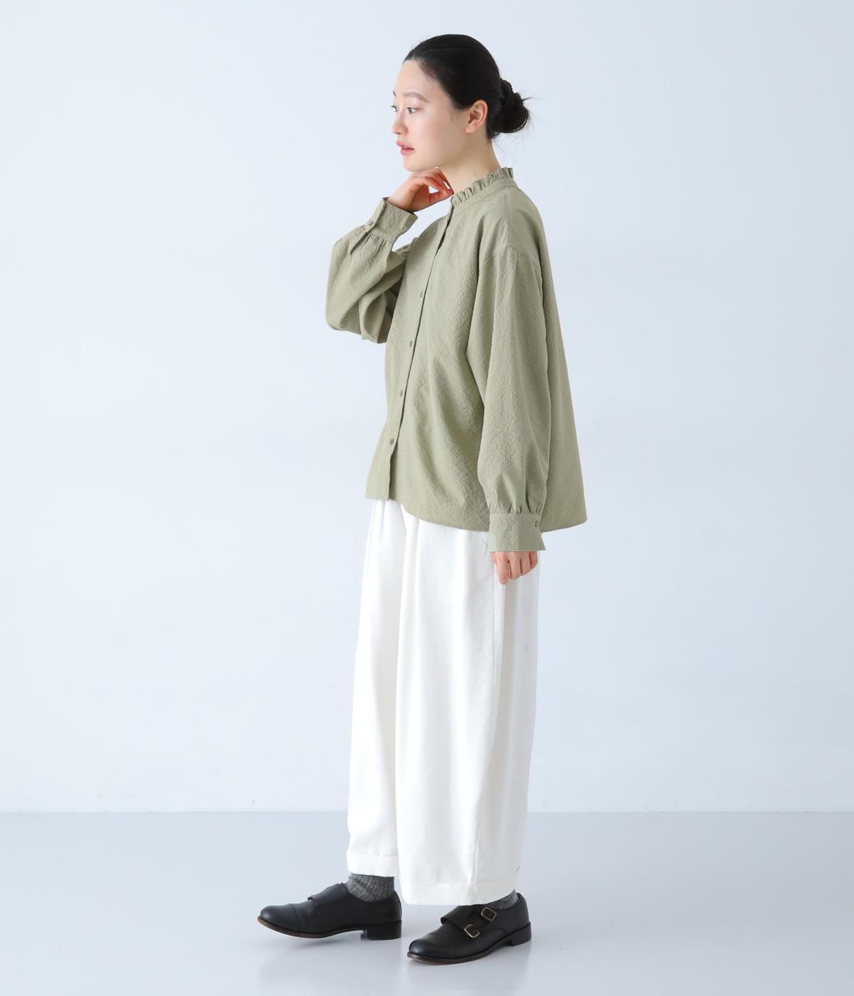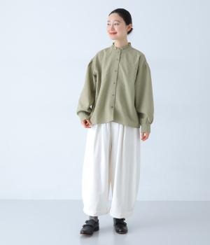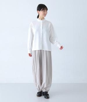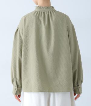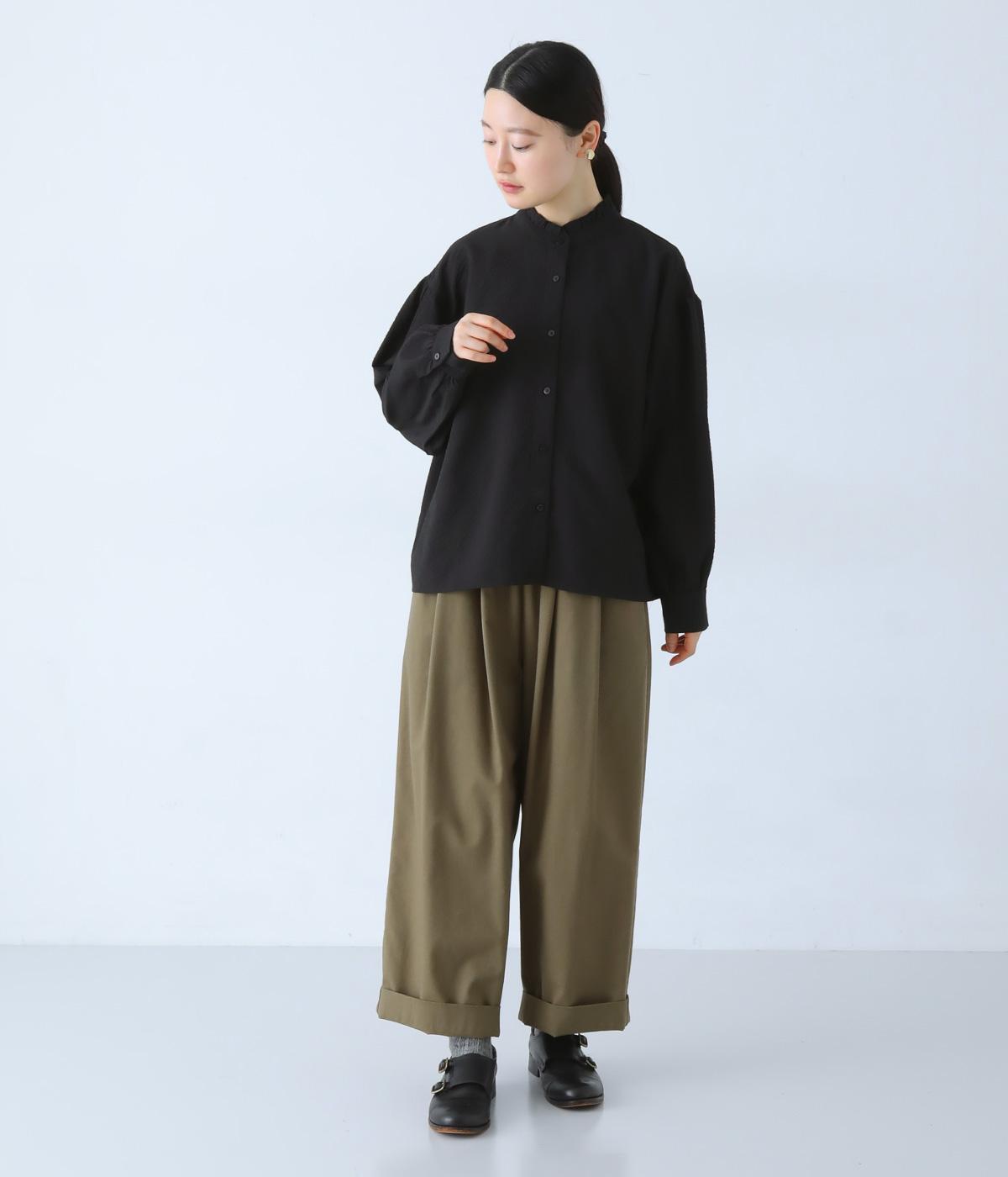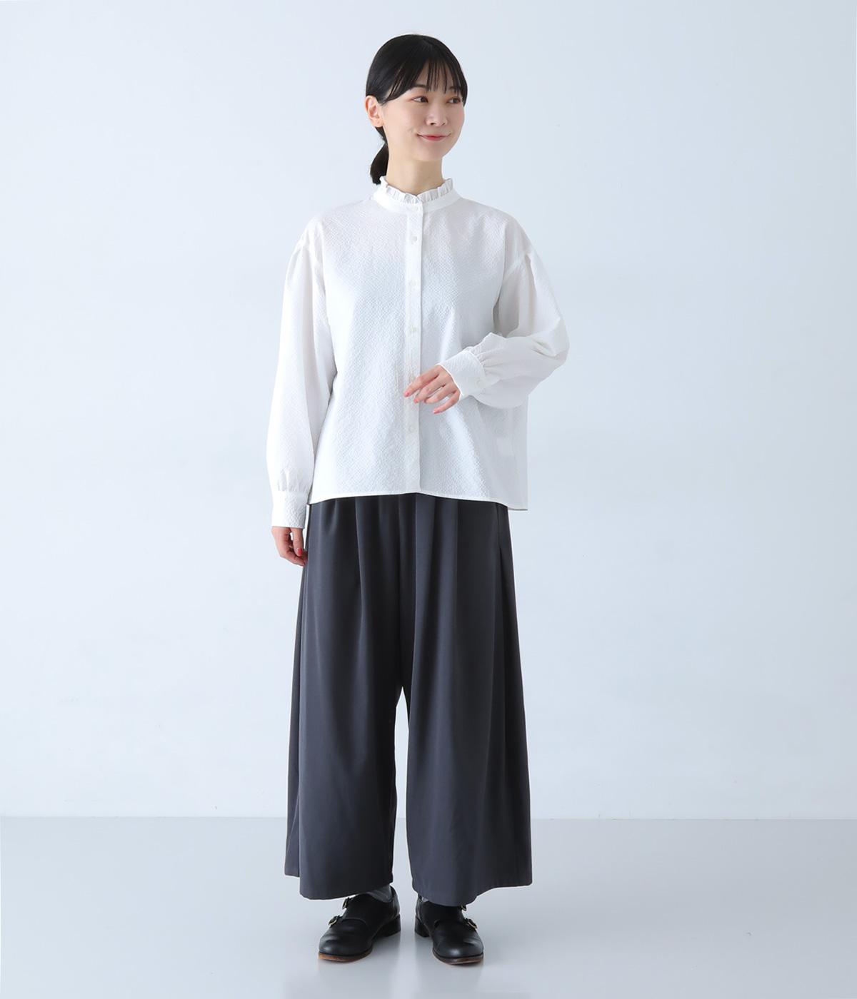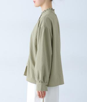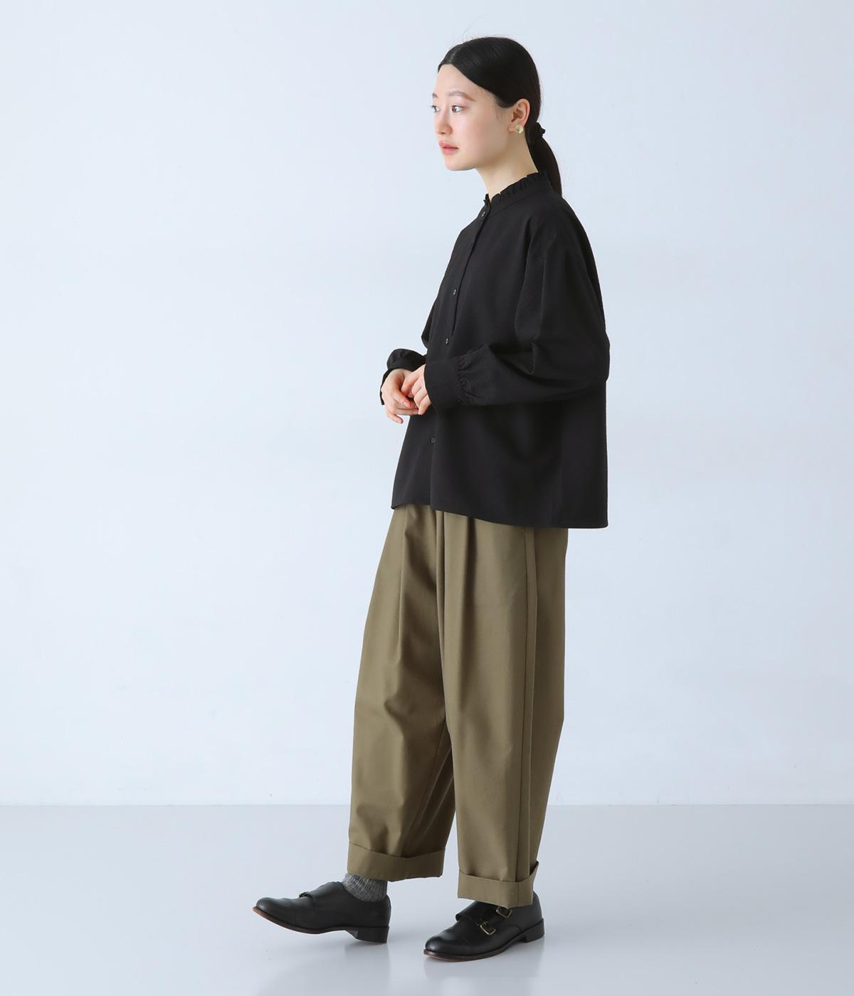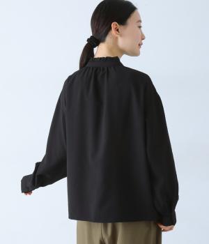 襟のフリルと広めの袖幅がクラシカルな雰囲気を与えるブラウス。カジュアルにもきれいめにも合わせやすく、ボリュームのあるボトムスともバランスよく着こなせる一枚です。