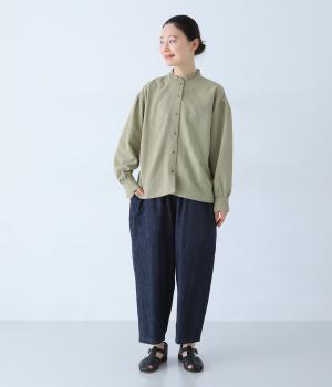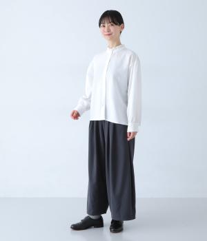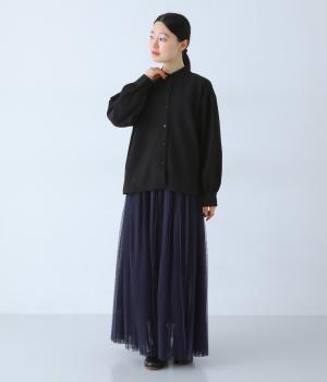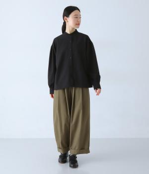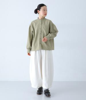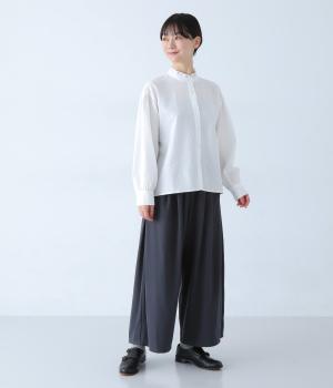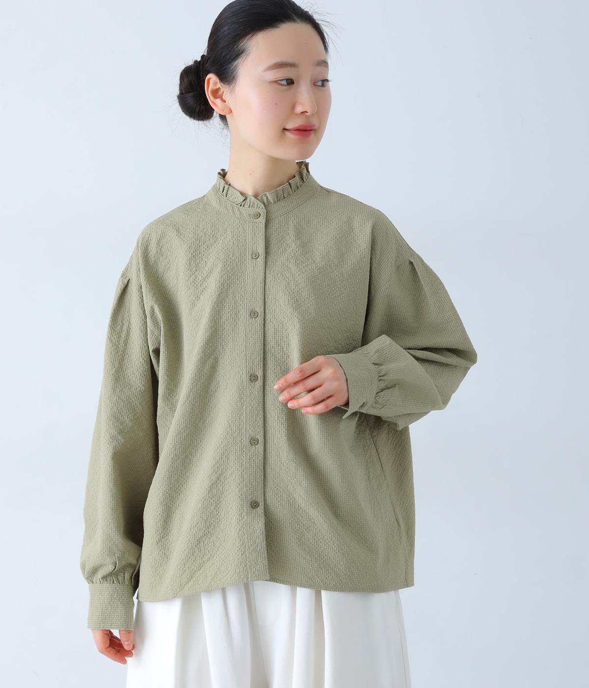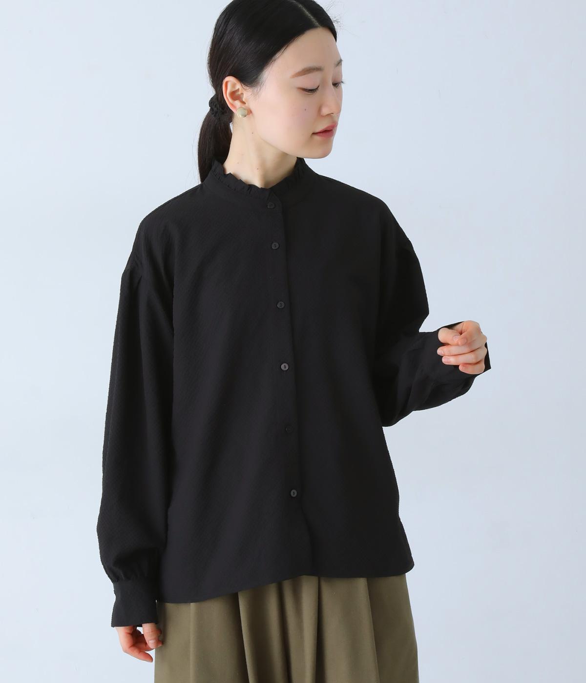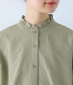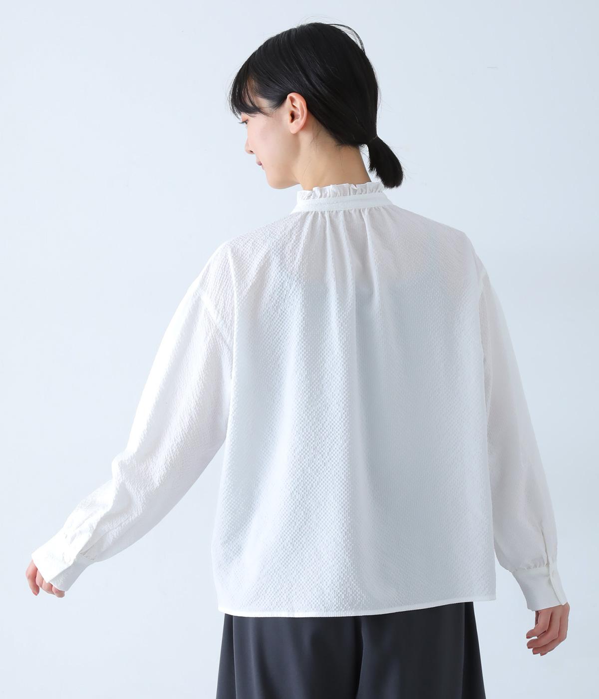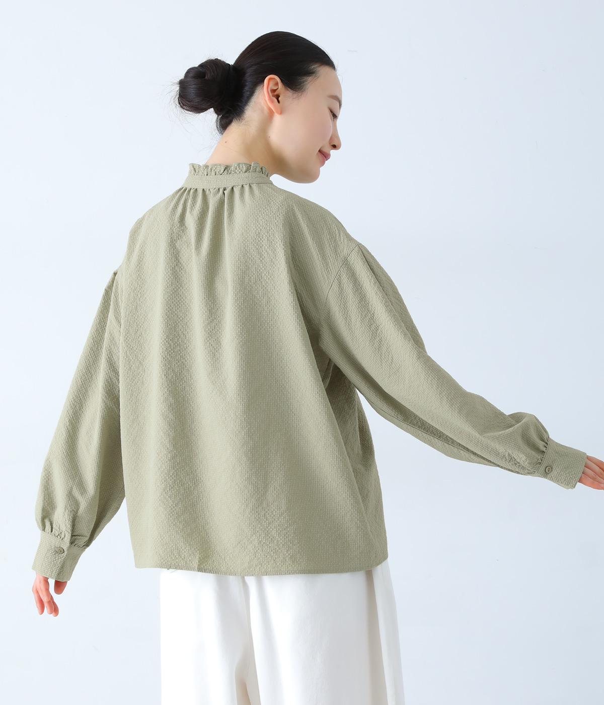 襟のフリルと広めの袖幅がクラシカルな雰囲気を与えるブラウス。カジュアルにもきれいめにも合わせやすく、ボリュームのあるボトムスともバランスよく着こなせる一枚です。